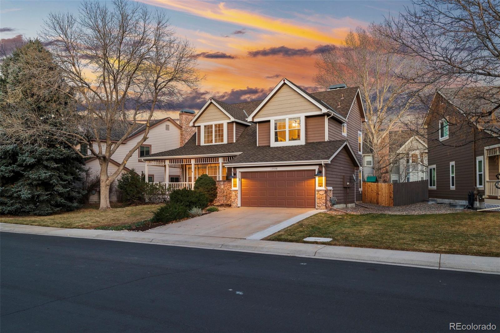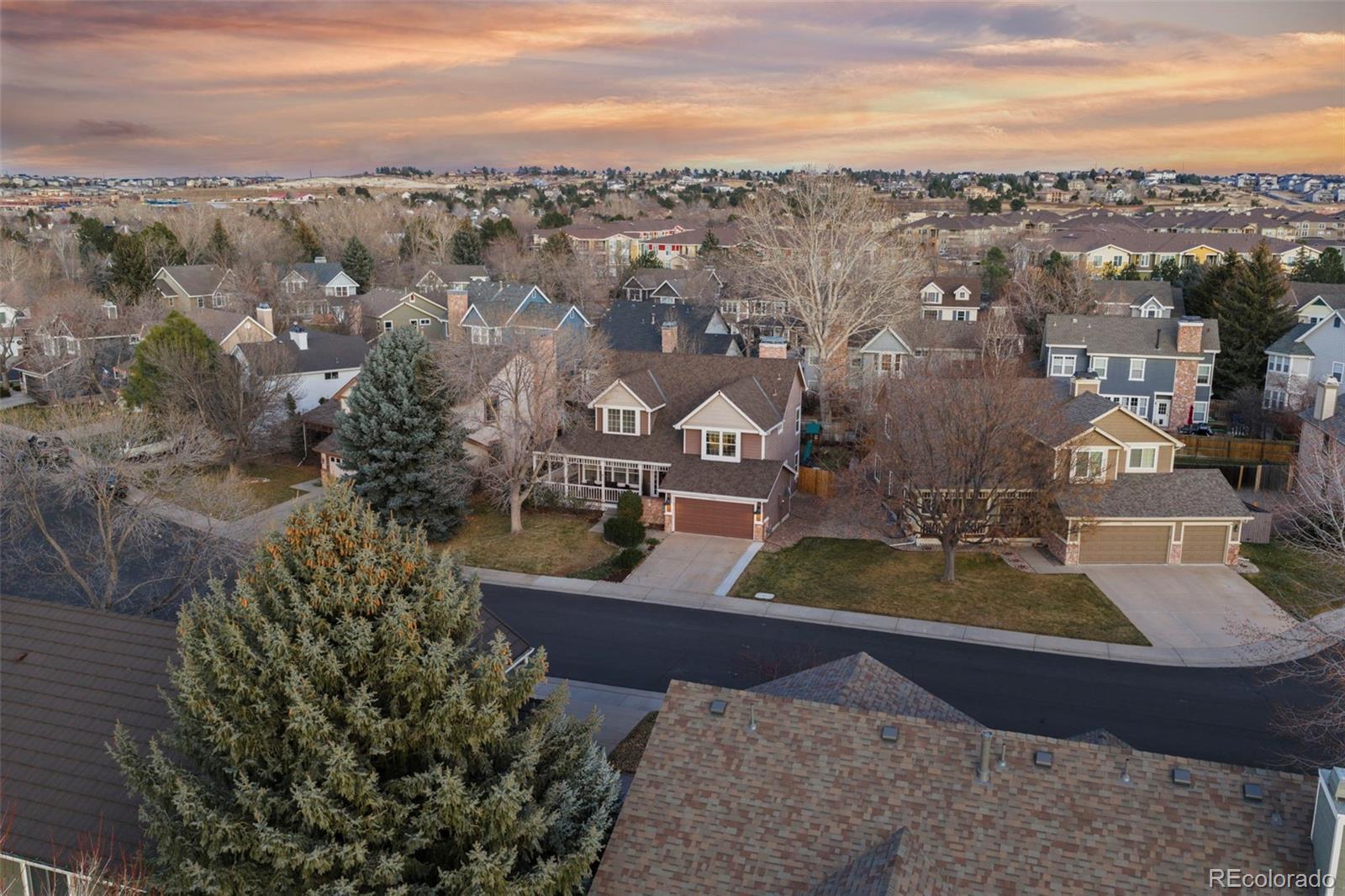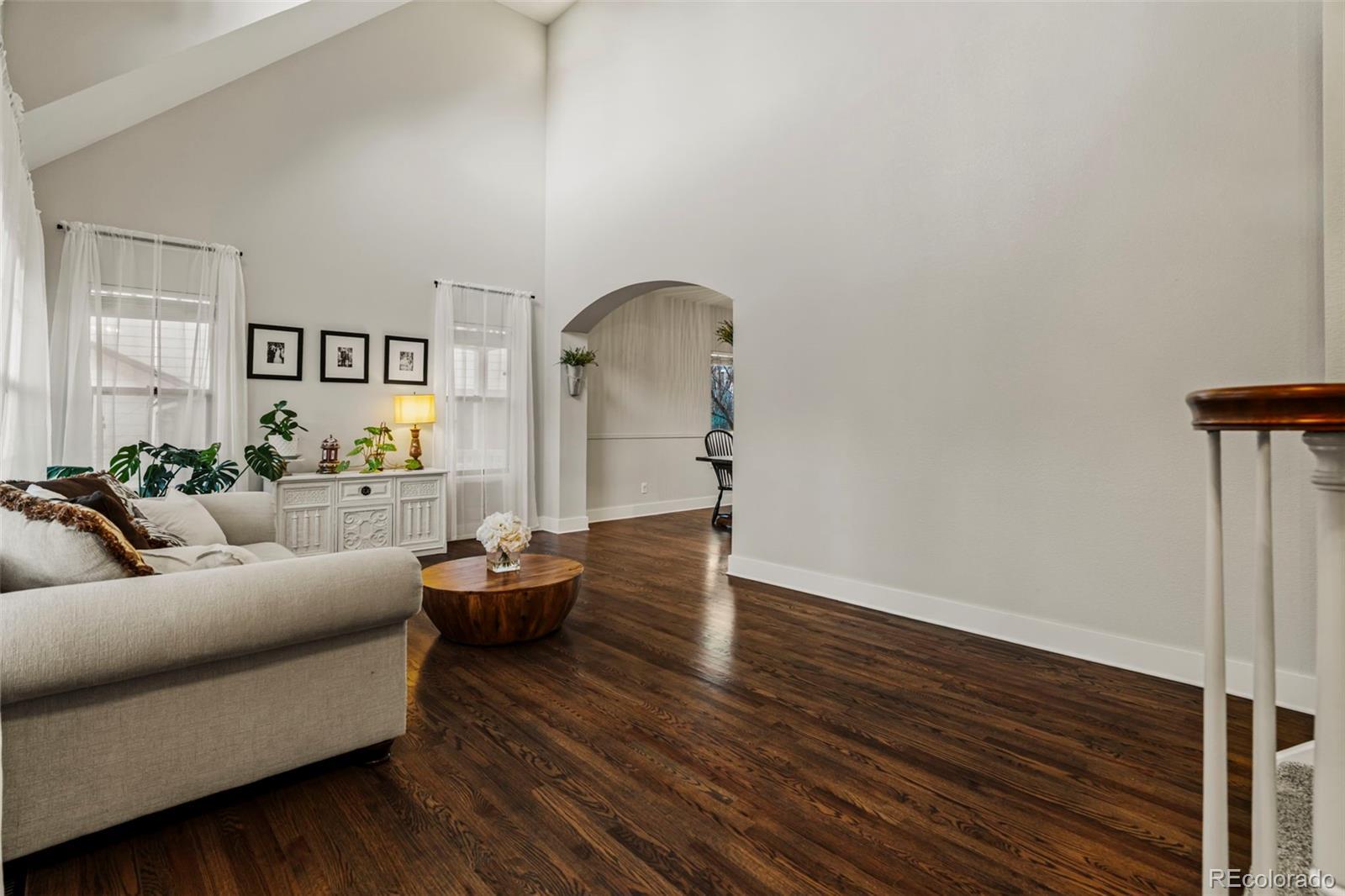 Beautifully updated and meticulously maintained, this exceptional 3-bedroom, 3-bath home is perfectly positioned on a large, private lot in the highly sought-after Stroh Ranch neighborhood—just steps from the Cherry Creek Trail and minutes to shopping, dining, and everyday conveniences. From the moment you arrive, the mature landscaping, fully fenced yard, charming covered wrap-around front porch, and oversized rear patio create outstanding curb appeal and effortless year-round outdoor living. Inside, the home impresses with hardwood floors, 6" baseboards, vaulted ceilings, and an abundance of natural light, highlighted by a dramatic formal living room with soaring 21½-foot ceilings that truly wow. The open, light, and bright kitchen features granite countertops, a center island, convection oven, R.O. water filtration system, and breakfast nook, flowing seamlessly into the inviting family room with gas fireplace—ideal for both everyday living and entertaining. A formal dining room anchors the main level for memorable holiday gatherings, while upstairs you’ll find a private primary suite with crown molding and a stunning, fully renovated spa-like bath complete with a stand-alone soaking tub, seamless glass shower, custom dual-sink vanity, marble floors, and designer tile. Two additional bedrooms are connected by a full Jack-and-Jill bath, and the 770-square-foot basement is open and ready for your custom finish. Recent major upgrades include a Presidential TL impact-resistant roof replaced in 2019, new furnace in 2024, and exterior paint in 2020, offering peace of mind for years to come. Just three blocks from the Stroh Ranch community pool, clubhouse, and fitness center and located within highly rated Douglas County Schools, this home delivers an unbeatable combination of location, lifestyle, and architectural drama—you’re going to fall in love the moment you walk in.