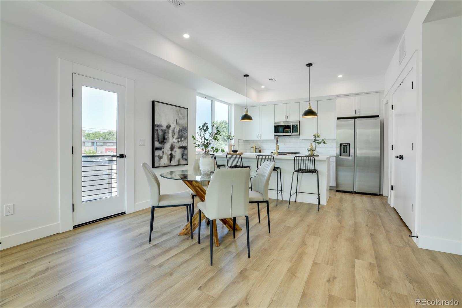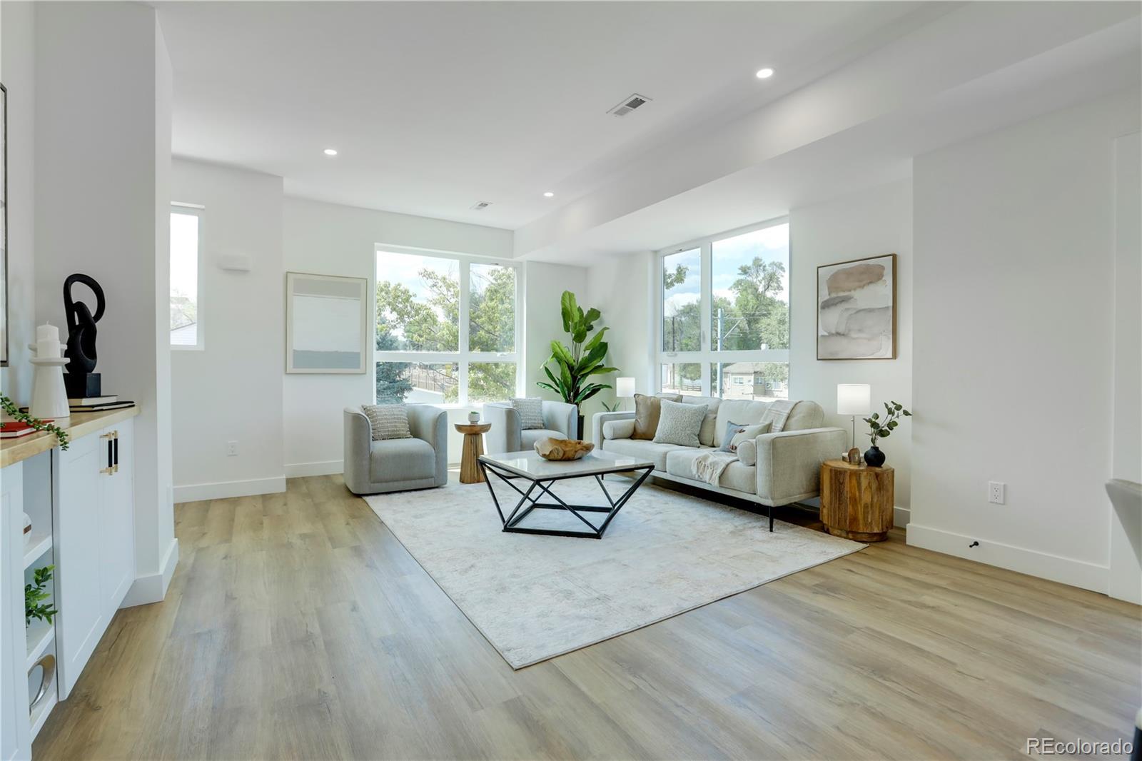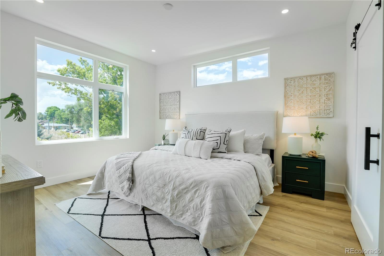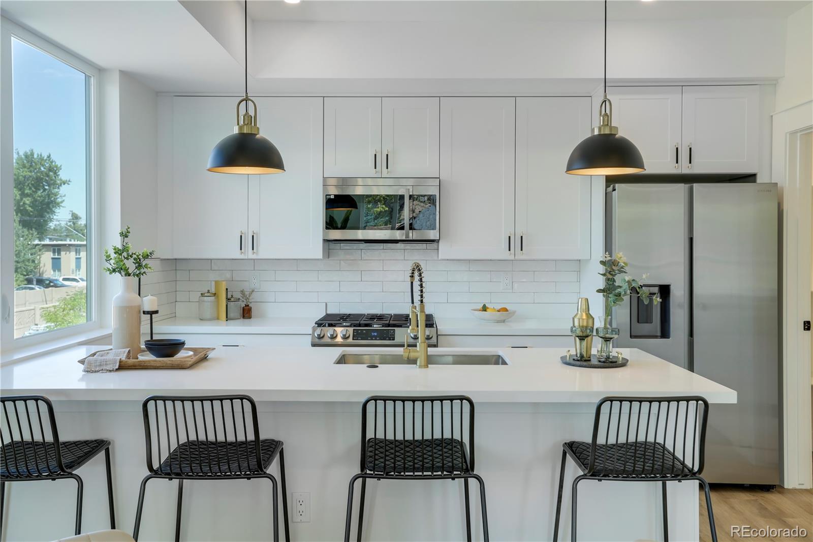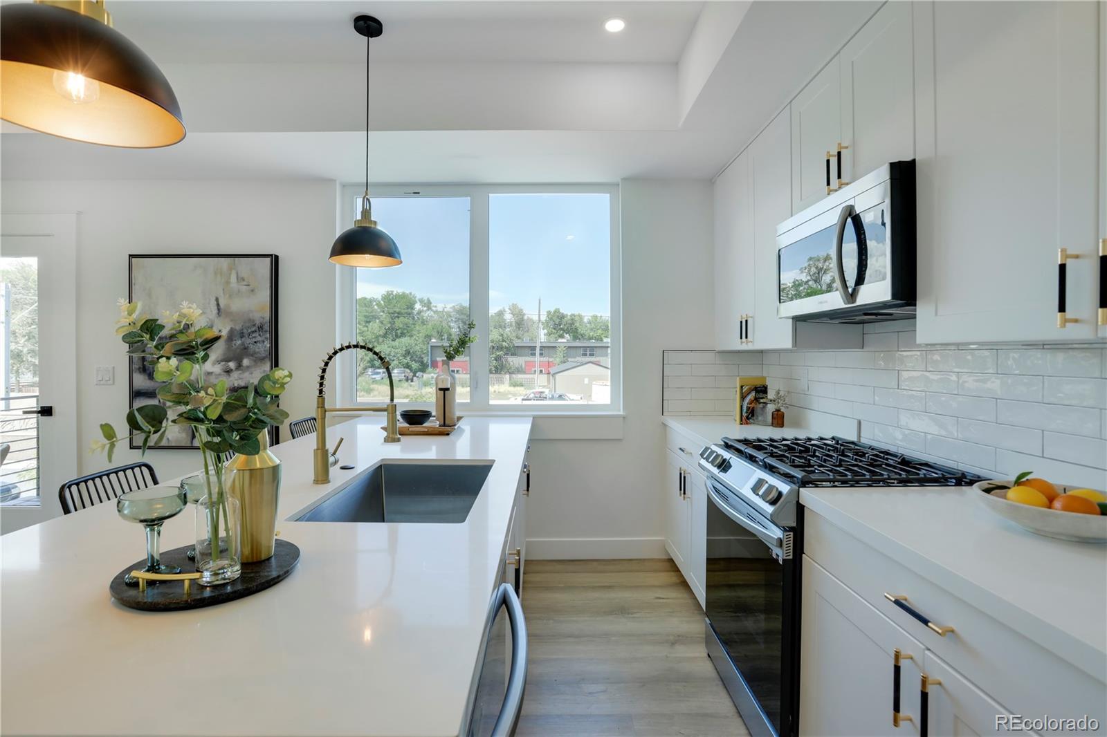 This new END UNIT townhome minutes from Sloans Lake and Downtown Denver features 3 bedrooms and 3 full bathrooms, a spacious fenced in private yard for your furry friends, Large 1 car attached garage with room for storage, 1 car private parking spot adjacent to the unit that can fit a Pick up truck, multiple balconies, and no carpet in sight! Enter through your private yard or attached garage to the lower level with a foyer, bedroom, and full bath. Head upstairs to the main level where you will find a chefs kitchen featuring a gas range, massive eat in quartz island that will comfortably seat four, and a walk in pantry with incredible storage for all your snacks and kitchen accessories. There is easy access to your balcony off the kitchen with a convenient gas hookup for all your grilling needs. Customize the main level to suit your vision with plenty of room for different dining and entertaining arrangements. Upstairs you will find two bedrooms and two full bathrooms. The spacious primary suite has its own balcony, sizable walk in closet, and beautiful primary bath with an oversized shower, toilet closet, and double vanity. Schedule a showing today! We have black and white finishes available. Photos may be of similar unit in same complex.