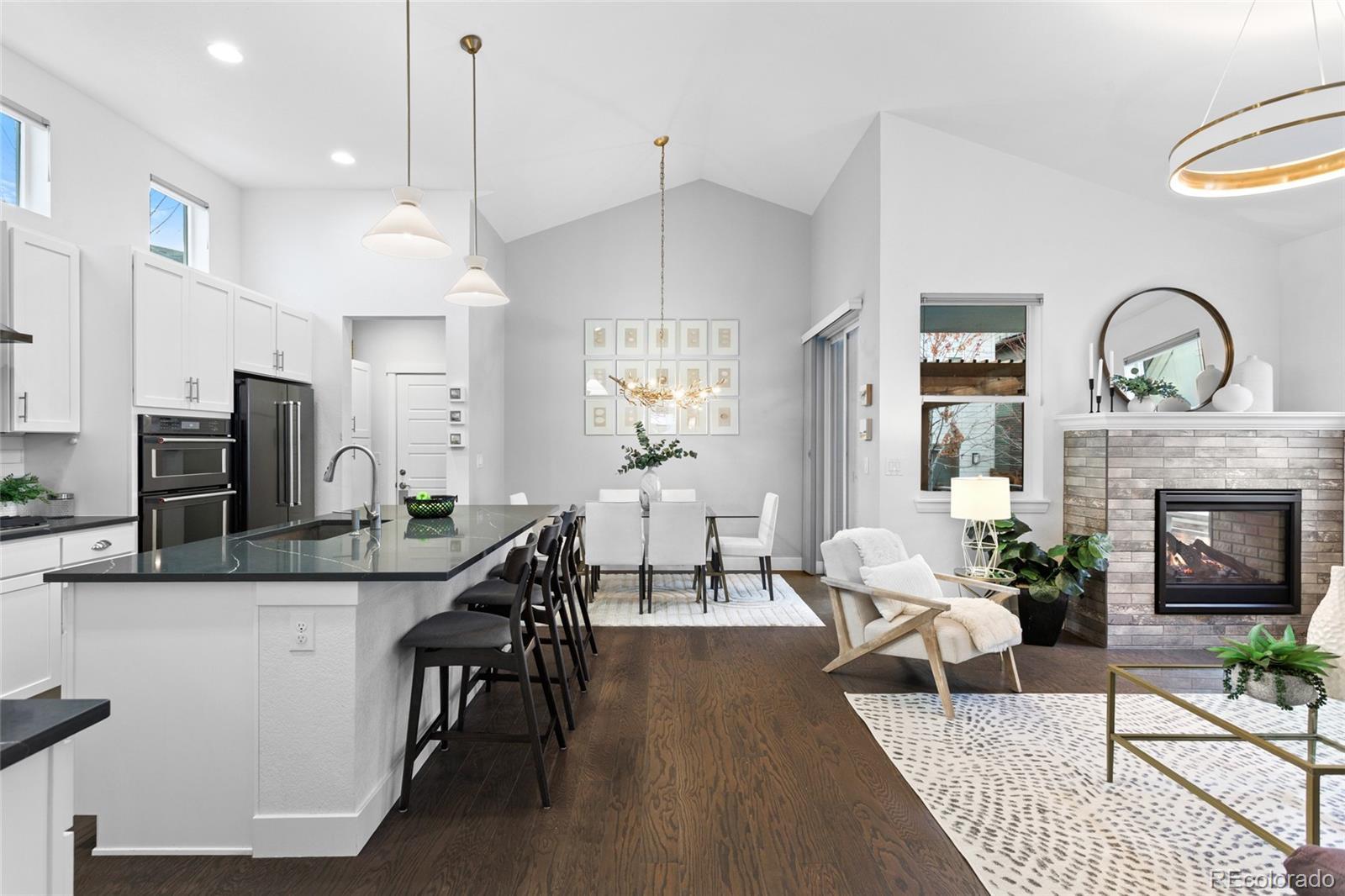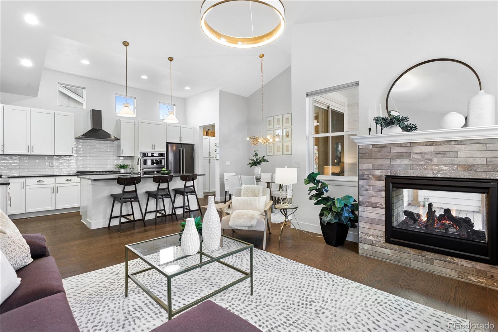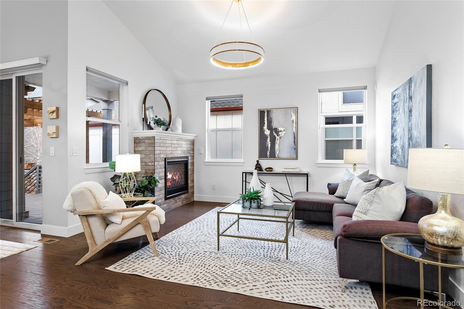 Modern Farmhouse Luxury with Main Floor Primary Bedroom and Home Office—a highly sought-after floorplan designed for elevated, easy living. Perfectly positioned along a coveted courtyard oasis with exclusive private green space. Soaring vaulted ceilings, hardwood floors & a sun-filled open-concept layout layered with thoughtful designer touches: custom light fixtures, architectural millwork, curated wallpaper accents, a fresh paint palette & tailored window treatments. Showpiece chef’s kitchen featuring premium stainless steel appliances, oversized eat-in island, abundant white cabinetry, pendant lighting + striking charcoal quartz countertops with bold white veining for contrast, all complemented by a textured white subway tile backsplash that delivers a clean, timeless finish. Stone-wrapped indoor/outdoor fireplace anchors the living room, while a sculptural chandelier defines the dining room—both flowing to the privately fenced, west-facing Trex deck with wood pergola, lighting, outdoor heaters, and dog run for year-round entertaining & sunset views. Elegant French doors open to the private main-level office. Main-floor primary retreat includes a spa-caliber five-piece ensuite + easy access to main-level laundry. Upstairs are two additional bedrooms with walk-in closets & secondary full bathroom. The newly finished basement offers luxury vinyl flooring, spacious family room, wet bar with built-ins & lounge area, two conforming bedrooms with walk-in closets, a new full bathroom, storage & an egress system with acrylic locking covers—perfect for guests, recreation, or multi-generational living. Fenced-in front porch with charming custom swings. Lockable storage system in the garage keeps gear secure & organized. Central Park's low-maintenance, well-kept community offers snow removal & meticulously maintained grounds. Home to scenic parks, trail systems, rec centers, swimming pools, the Wildlife Refuge, Northfield shops, farmers market & year-round events.