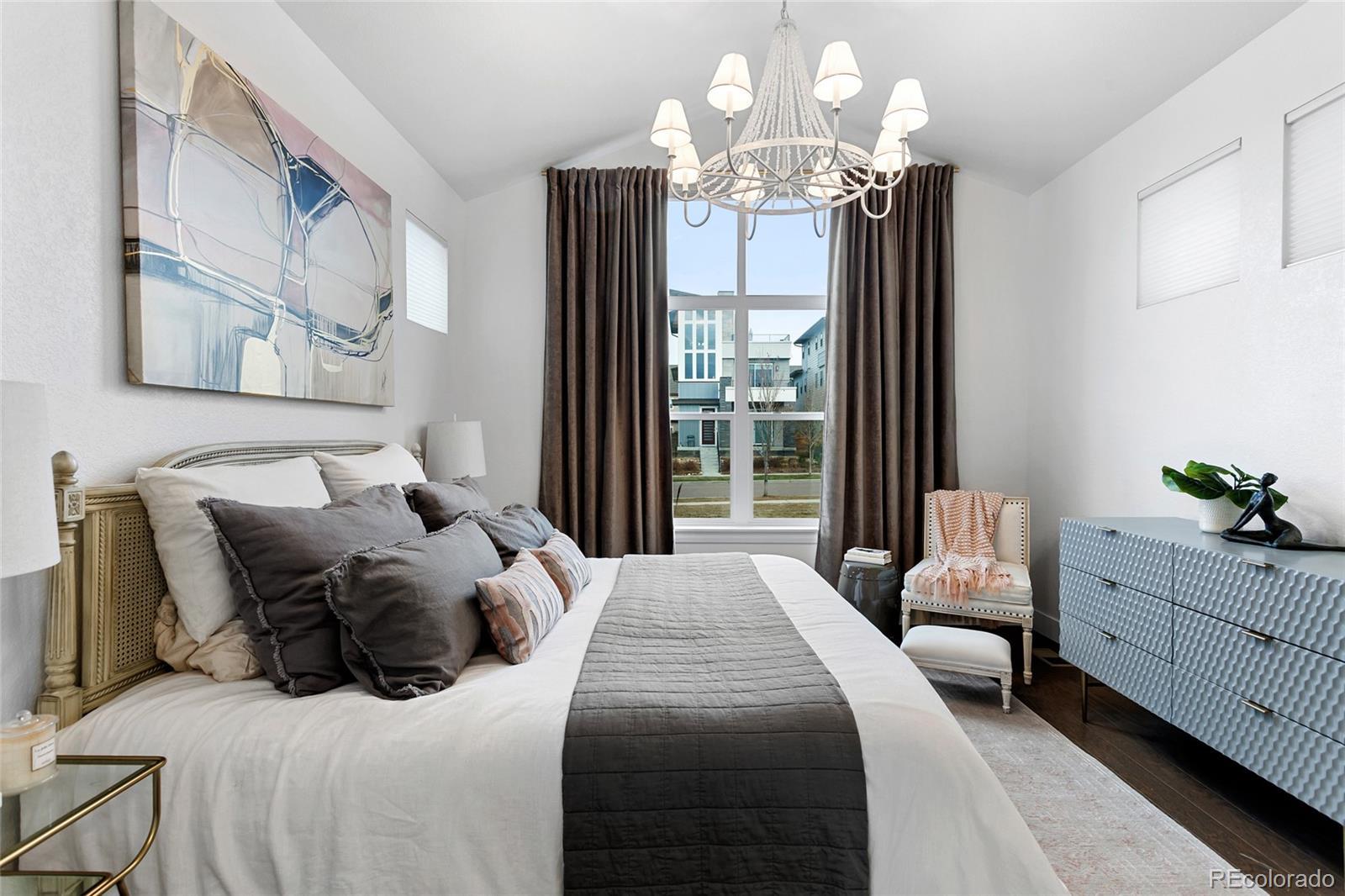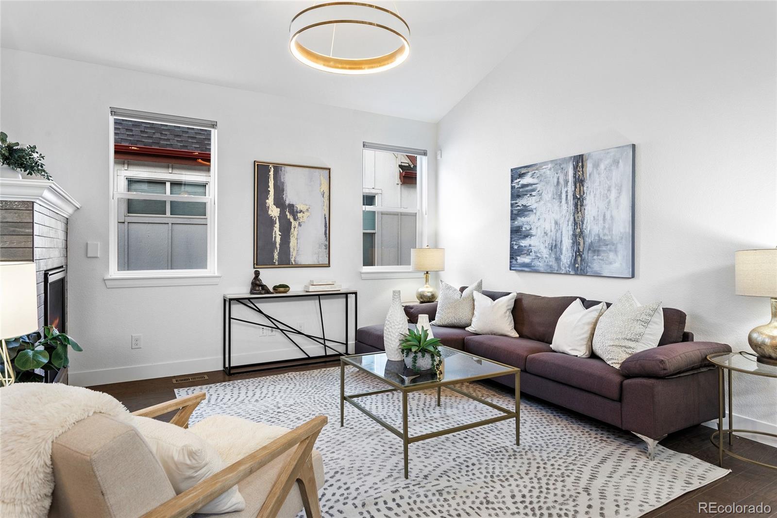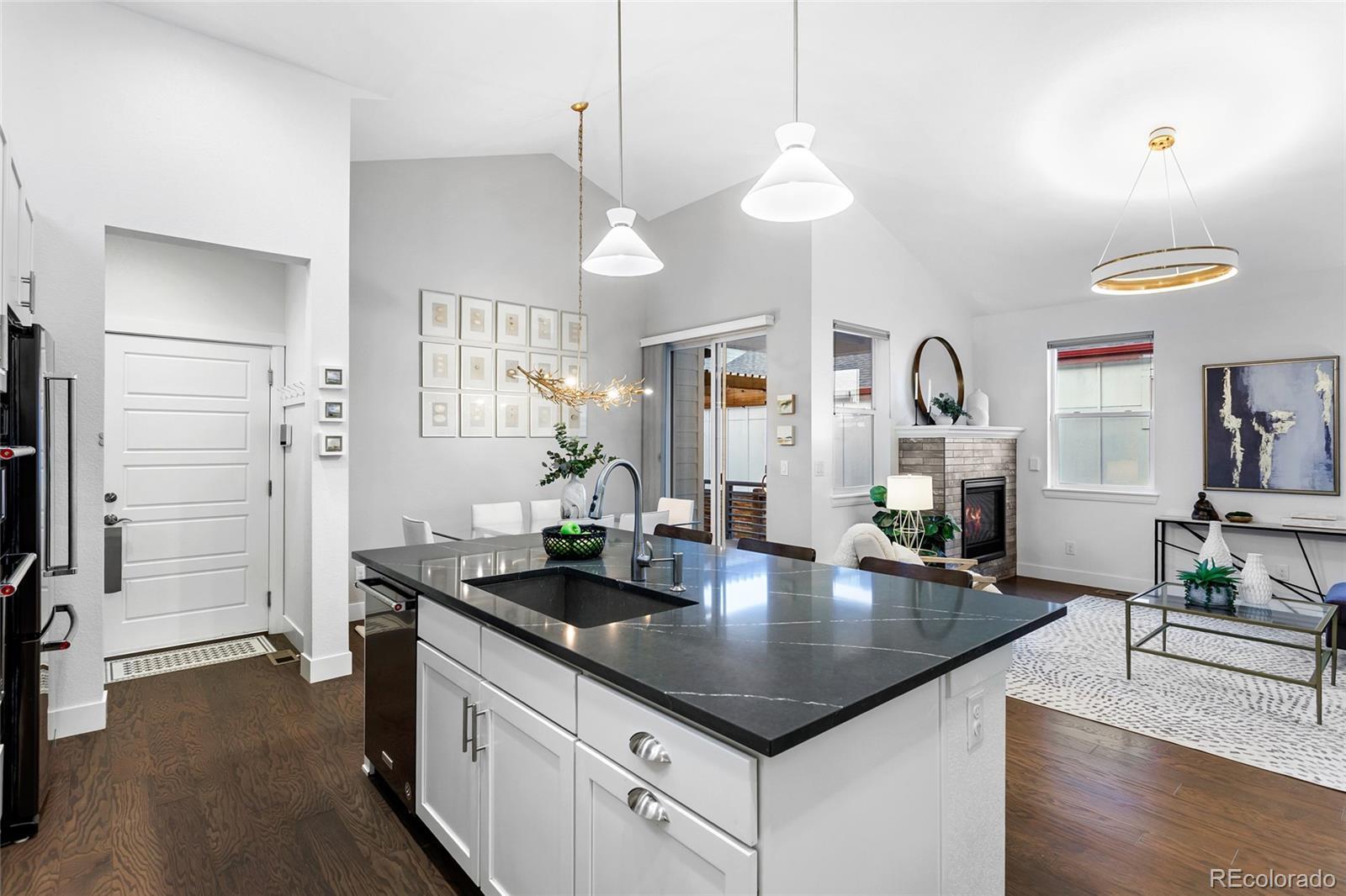 Modern Farmhouse Luxury with Main Floor Primary Bedroom and Home Office—a highly sought-after floorplan designed for elevated, easy living. Perfectly positioned along a coveted courtyard oasis with exclusive private green space. Soaring vaulted ceilings, hardwood floors & a sun-filled open-concept layout layered with thoughtful designer touches: custom light fixtures, architectural millwork, curated wallpaper accents, a fresh paint palette & tailored window treatments. Showpiece chef’s kitchen featuring premium stainless steel appliances, oversized eat-in island, abundant white cabinetry, pendant lighting + striking charcoal quartz countertops with bold white veining for contrast, all complemented by a textured white subway tile backsplash that delivers a clean, timeless finish. Stone-wrapped indoor/outdoor fireplace anchors the living room, while a sculptural chandelier defines the dining room—both flowing to the privately fenced, west-facing Trex deck with wood pergola, lighting, outdoor heaters, and dog run for year-round entertaining & sunset views. Elegant French doors open to the private main-level office. Main-floor primary retreat includes a spa-caliber five-piece ensuite + easy access to main-level laundry. Upstairs are two additional bedrooms with walk-in closets & secondary full bathroom. The newly finished basement offers luxury vinyl flooring, spacious family room, wet bar with built-ins & lounge area, two conforming bedrooms with walk-in closets, a new full bathroom, storage & an egress system with acrylic locking covers—perfect for guests, recreation, or multi-generational living. Fenced-in front porch with charming custom swings. Lockable storage system in the garage keeps gear secure & organized. Central Park's low-maintenance, well-kept community offers snow removal & meticulously maintained grounds. Home to scenic parks, trail systems, rec centers, swimming pools, the Wildlife Refuge, Northfield shops, farmers market & year-round events.