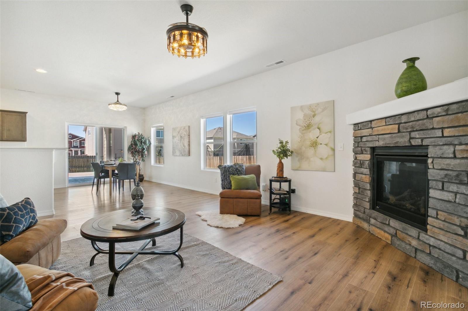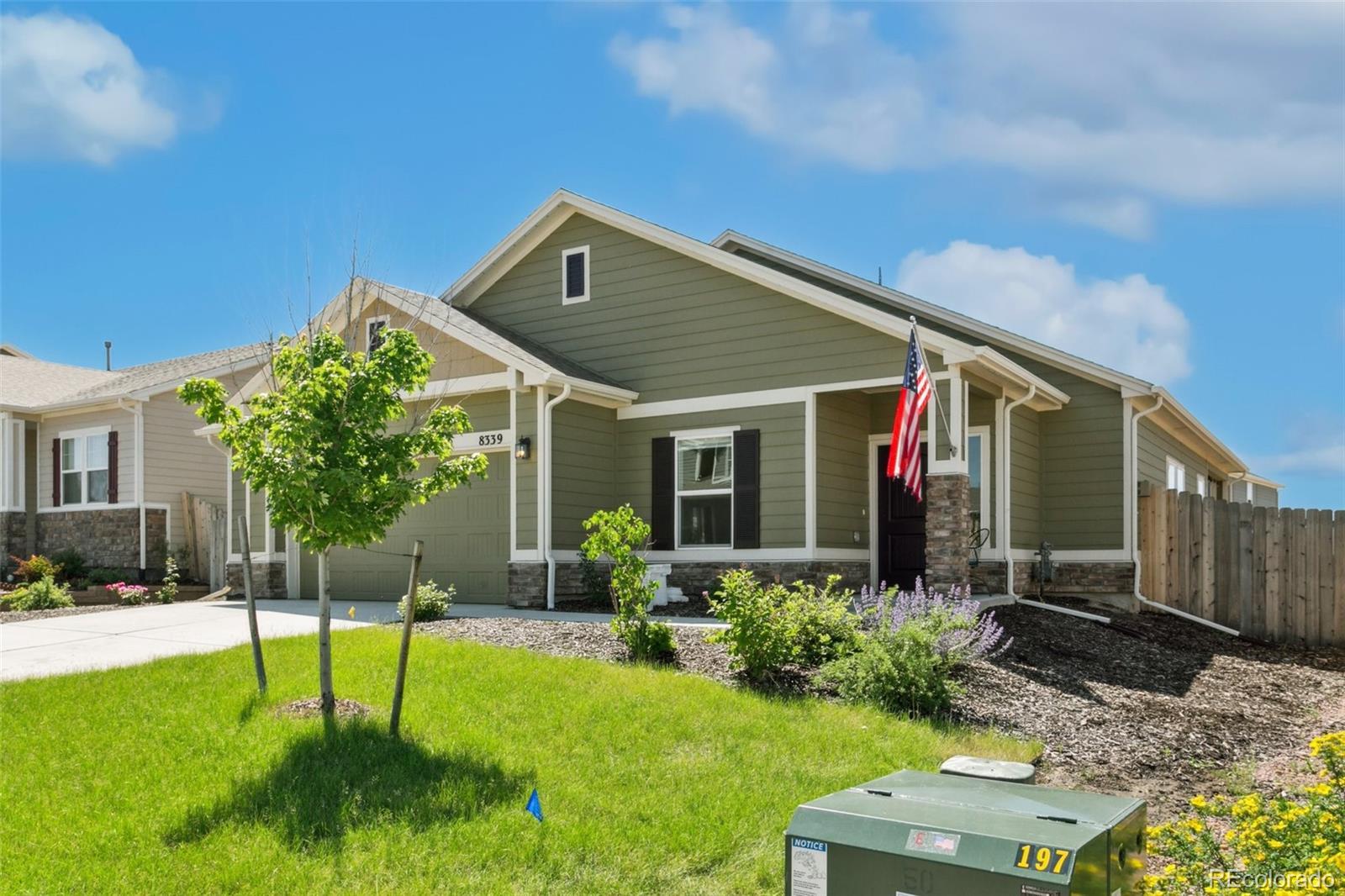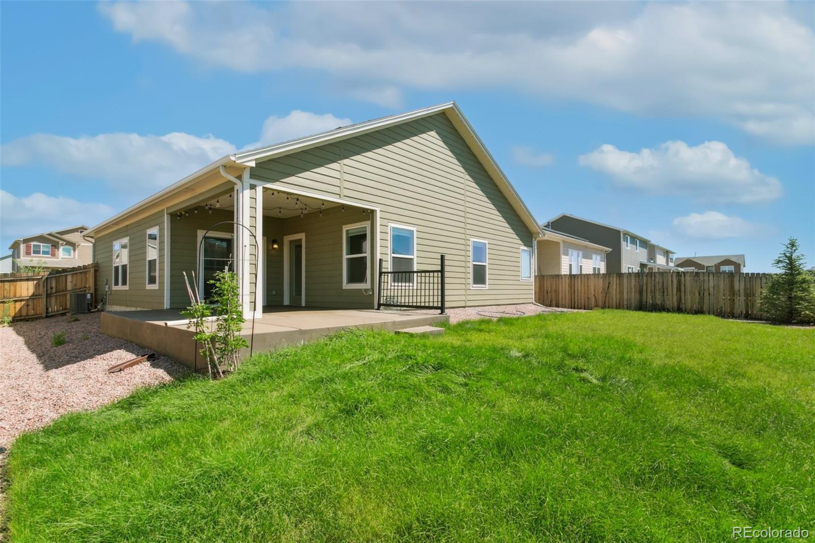 This lovely ranch style Challenger home has all main level living (3/2/2.5). This 2021 gem in Branding Iron of Sterling Ranch is highly desirable. Upon entry with area for coats and sundries you flow to the living space with stunning stone surrounded gas fireplace that provides a cozy feel on chilly evenings and dining area. Fabulous open floor plan! The designer kitchen features breakfast bar, custom slide outs in select cabinets, farm sink, pantry, quartz countertops and stainless appliances including gas range with double oven, microwave and dishwasher with easy access to back door to covered and enlarged back patio and fully fenced back yard. Great place to enjoy morning coffee and take in breathtaking view of Pikes Peak. Beyond the kitchen is the laundry room with access to the oversized 2.5 garage (truly oversized with 586 sq ft!) and built in shelving. The primary suite is in the rear of the home with it's own door to the patio and overlooking spacious, landscaped back yard. The luxurious five piece en-suite bath includes an inviting soaking tub, separate shower and double vanity and walk-in closet. The 2nd bedroom just down the hall is complete with barn door to access en-suite full bath second bathroom door to hall for guests. The 3rd bedroom is closer to the front of the home - perfect space for guests or use as an office. This home boasts 9 foot ceilings, Jellyfish year round outdoor lighting, lots of closets, designer, retractable fans surrounded by stunning lighting and all hard surface flooring.