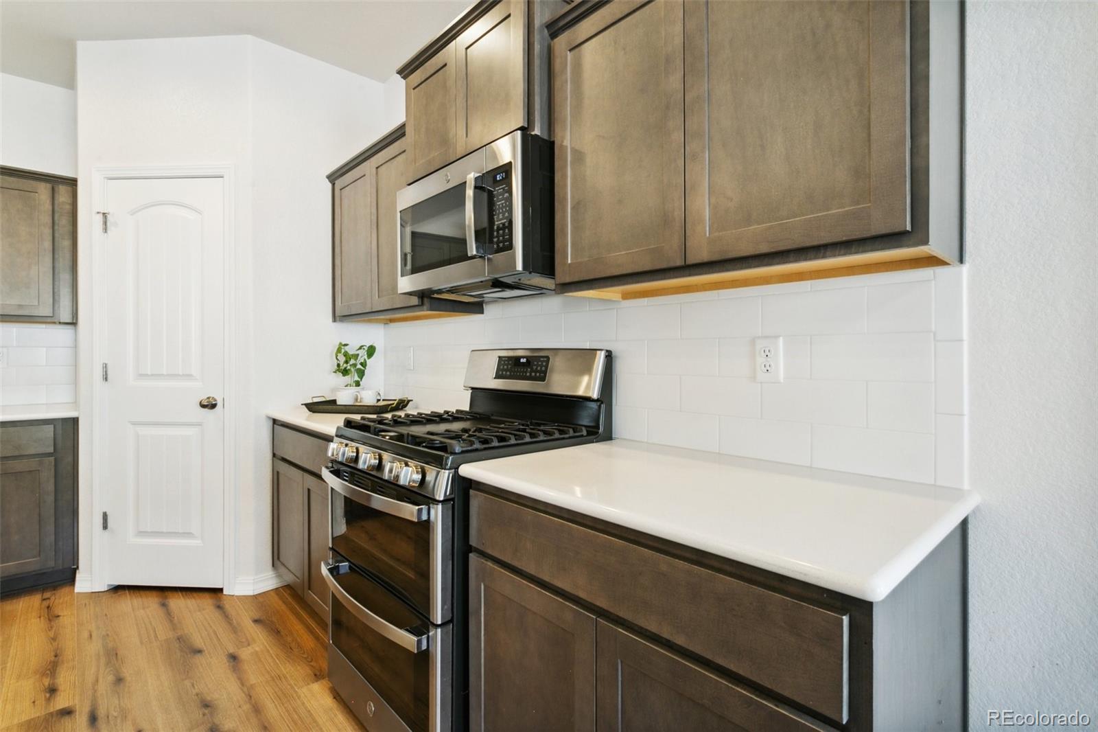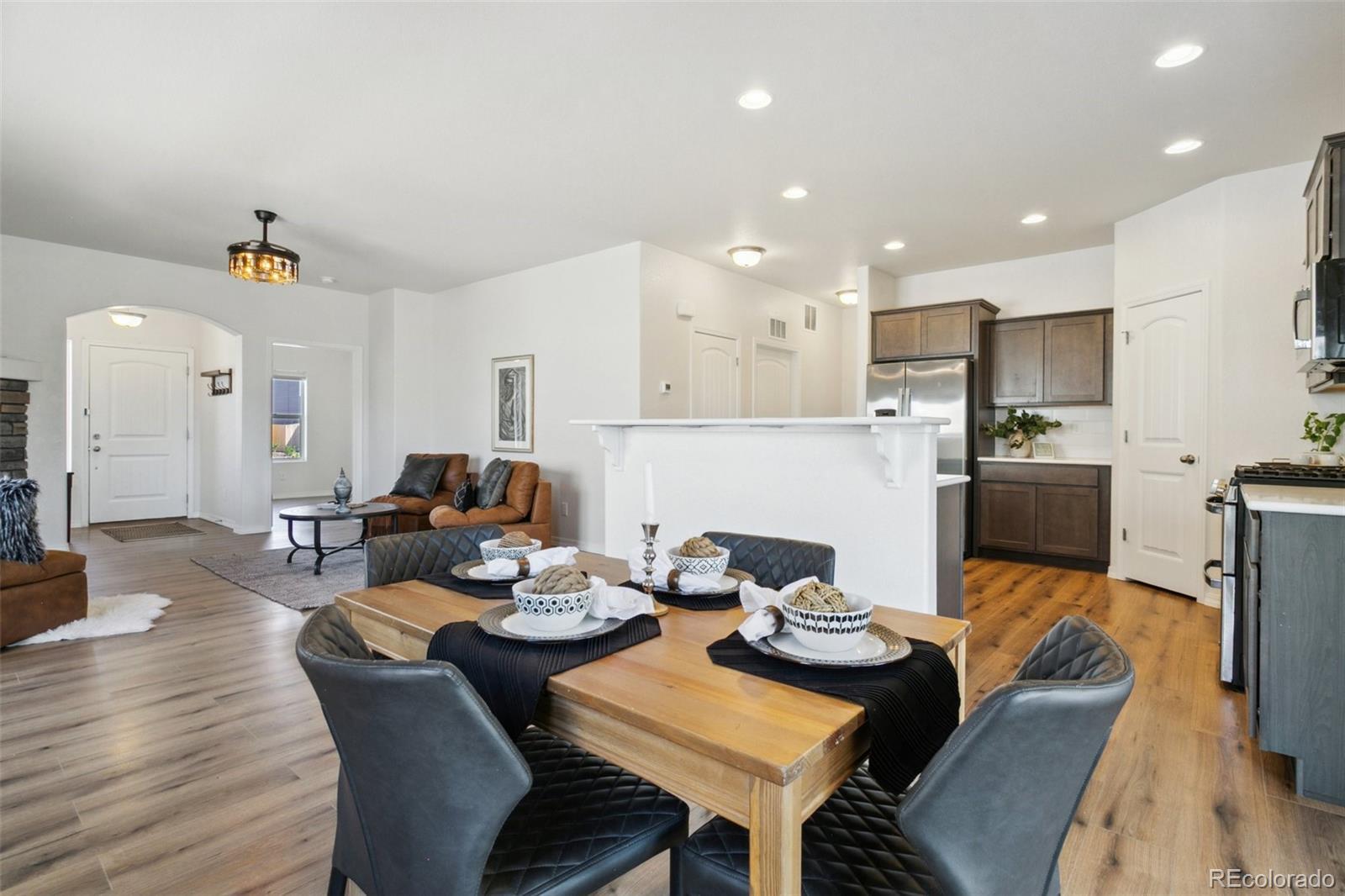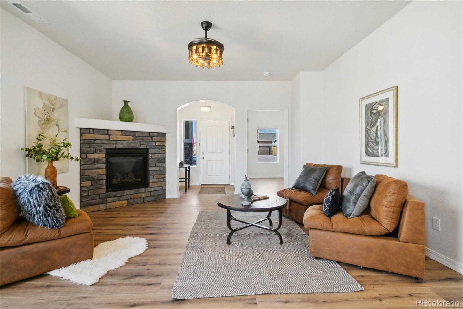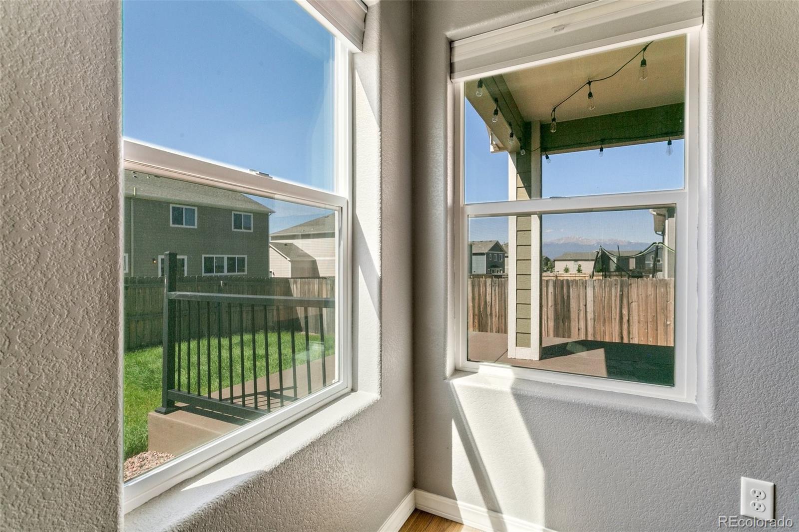 This lovely ranch style Challenger home has all main level living (3/2/2.5). This 2021 gem in Branding Iron of Sterling Ranch is highly desirable. Upon entry with area for coats and sundries you flow to the living space with stunning stone surrounded gas fireplace that provides a cozy feel on chilly evenings and dining area. Fabulous open floor plan! The designer kitchen features breakfast bar, custom slide outs in select cabinets, farm sink, pantry, quartz countertops and stainless appliances including gas range with double oven, microwave and dishwasher with easy access to back door to covered and enlarged back patio and fully fenced back yard. Great place to enjoy morning coffee and take in breathtaking view of Pikes Peak. Beyond the kitchen is the laundry room with access to the oversized 2.5 garage (truly oversized with 586 sq ft!) and built in shelving. The primary suite is in the rear of the home with it's own door to the patio and overlooking spacious, landscaped back yard. The luxurious five piece en-suite bath includes an inviting soaking tub, separate shower and double vanity and walk-in closet. The 2nd bedroom just down the hall is complete with barn door to access en-suite full bath second bathroom door to hall for guests. The 3rd bedroom is closer to the front of the home - perfect space for guests or use as an office. This home boasts 9 foot ceilings, Jellyfish year round outdoor lighting, lots of closets, designer, retractable fans surrounded by stunning lighting and all hard surface flooring.