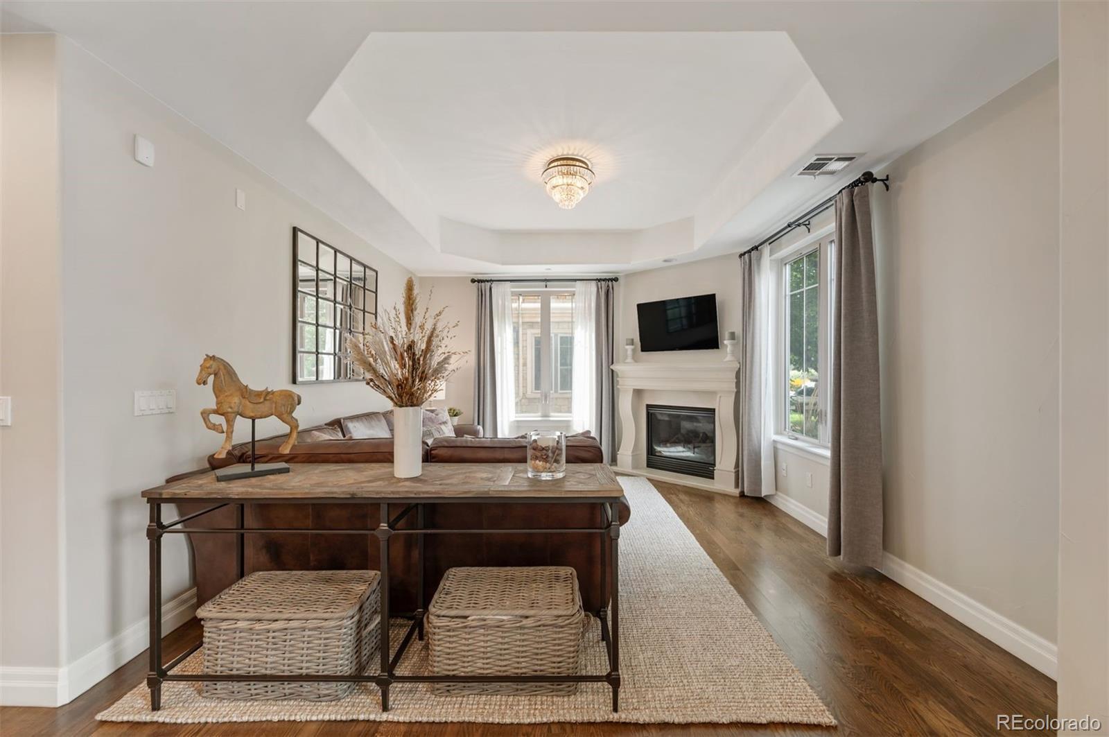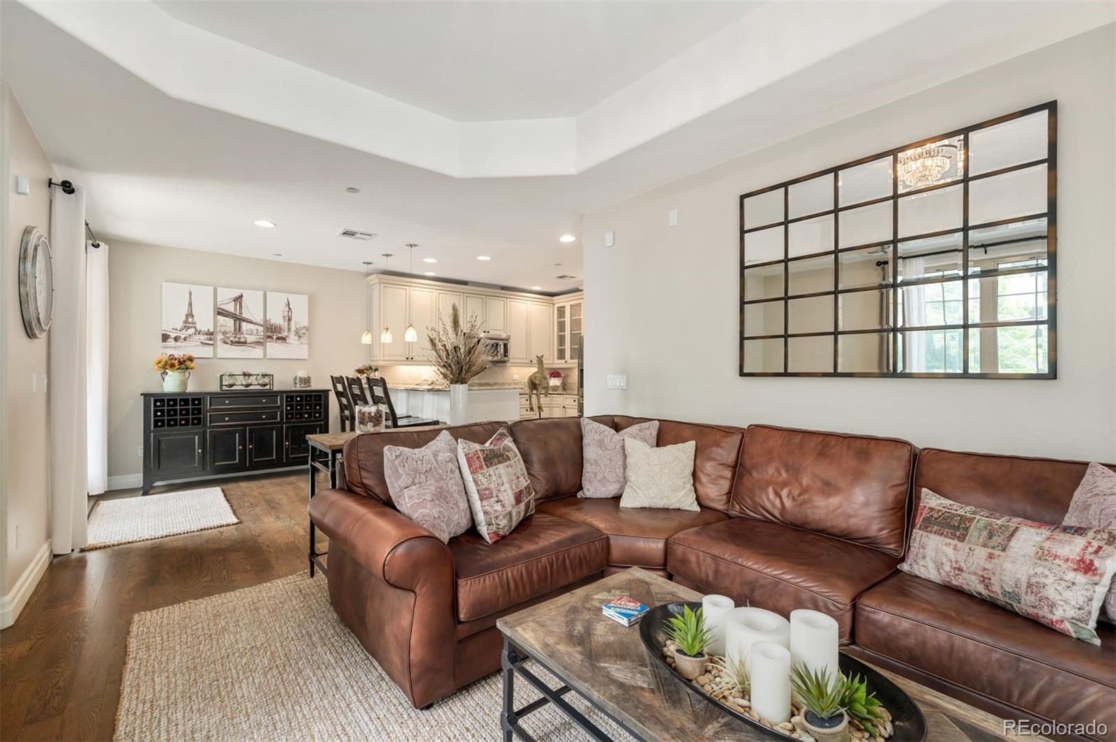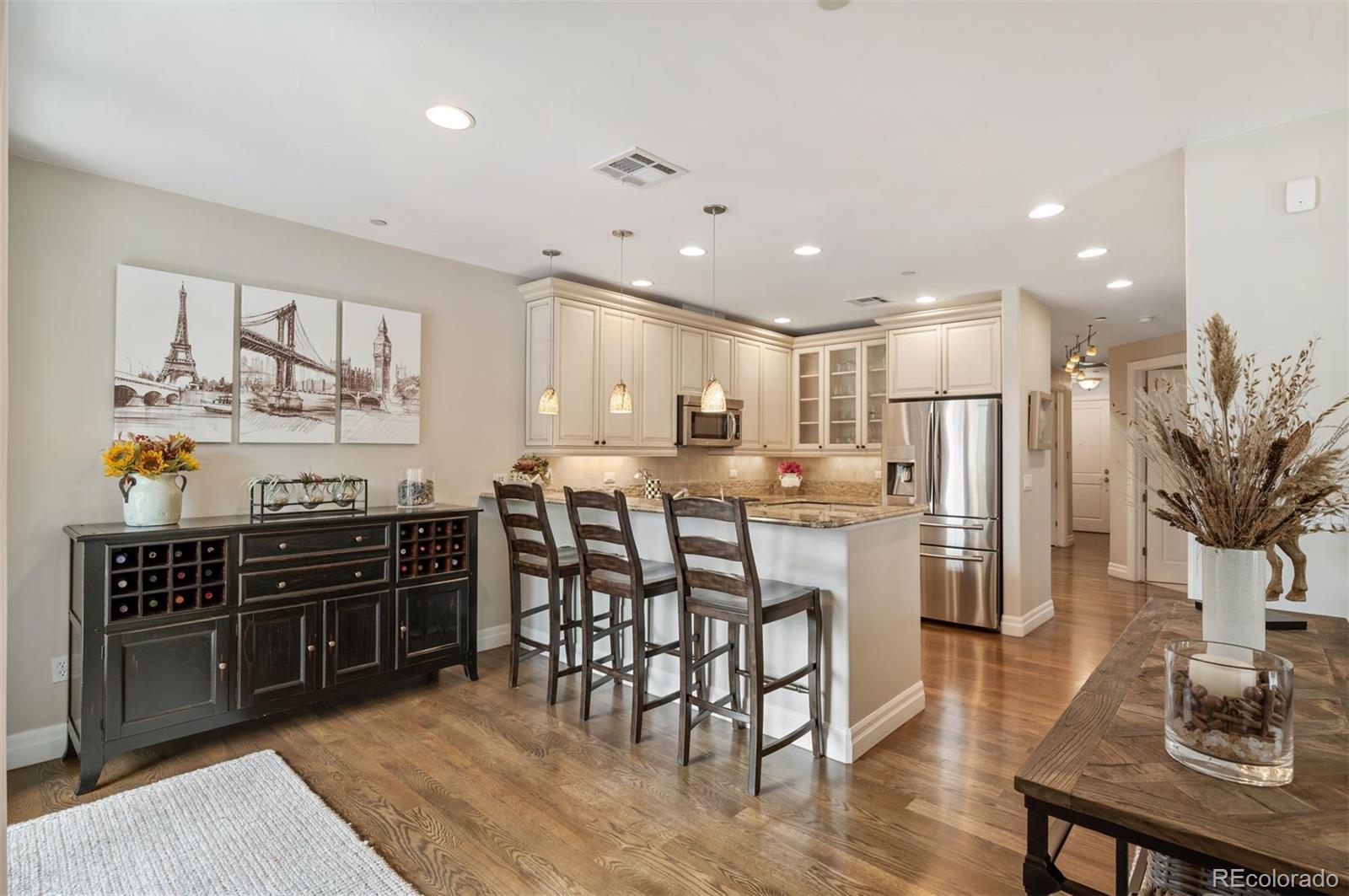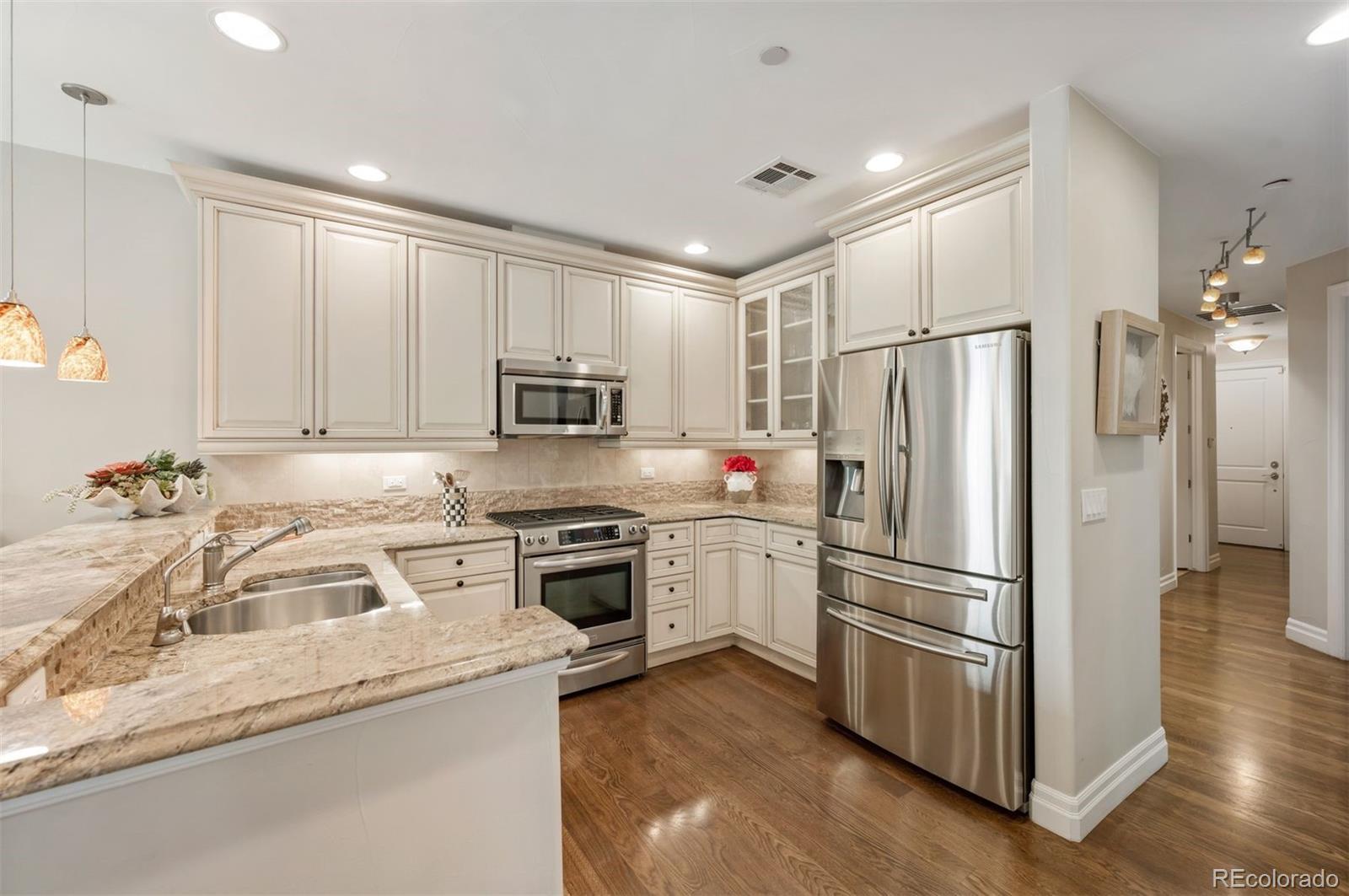 Cherry Creek perfection, ideally located close to world-class dining and shopping, plus parks, trails, downtown and more. This elegant condo features an open floorplan with beautiful kitchen showcasing stainless appliances, granite countertops, 42” cabinets, custom tile backsplash and breakfast bar. You’ll love the ambiance that the coffered ceiling and cozy gas fireplace creates in the great room. Entertaining is a dream with the French door off the dining area onto your covered patio that creates your own entrance without going through the lobby. The primary suite features a five-piece bath with custom shower and walk-in closet. The second bedroom, hall bath and laundry complete the layout. Two garage parking spaces and a storage closet provide plenty of room for all your gear. This delightful home is move-in ready, all you have to do is unpack and start enjoying that Cherry Creek lifestyle!