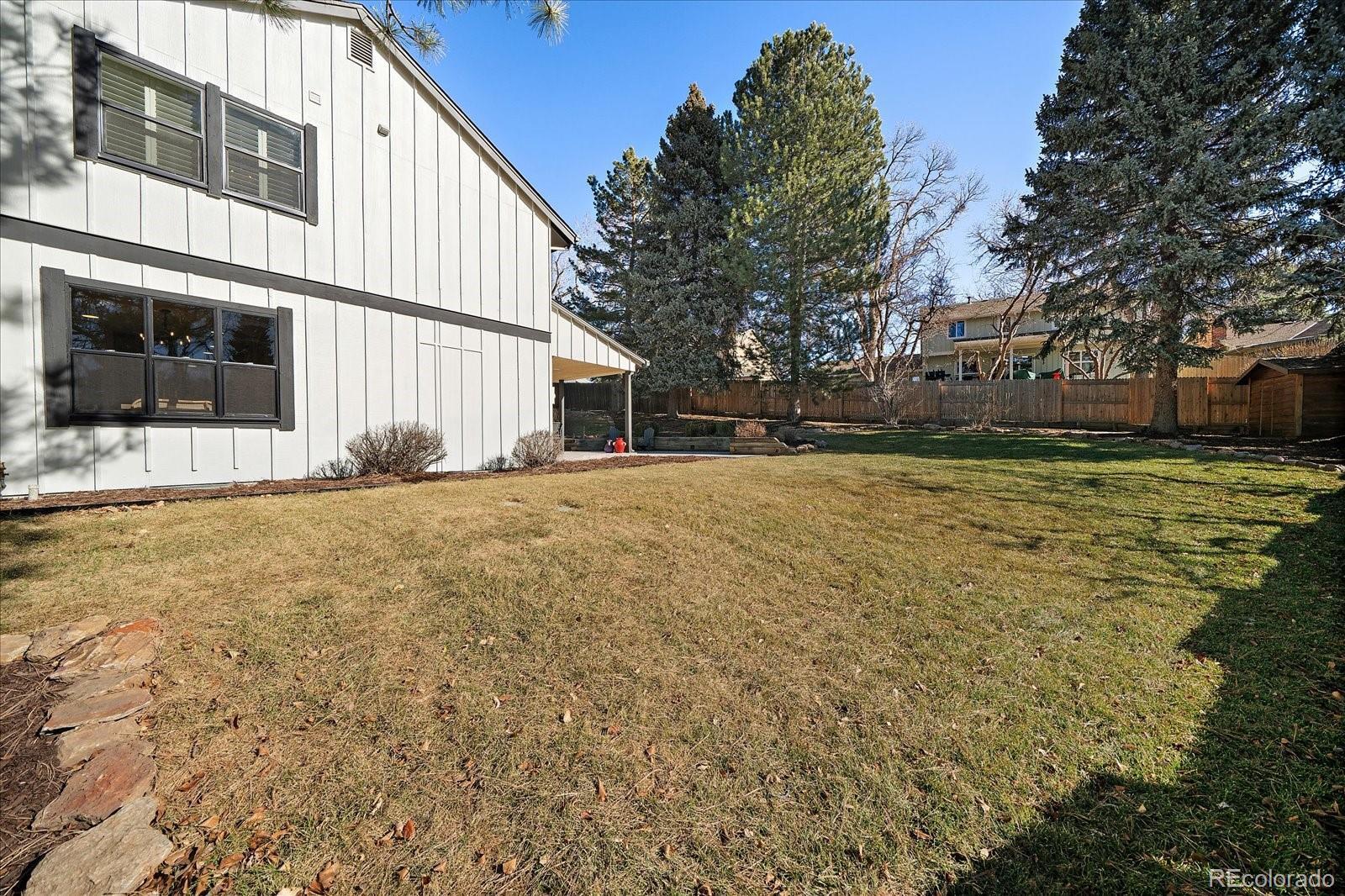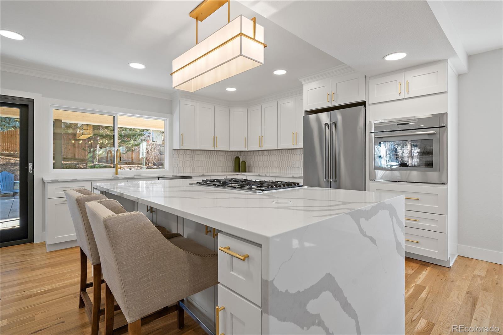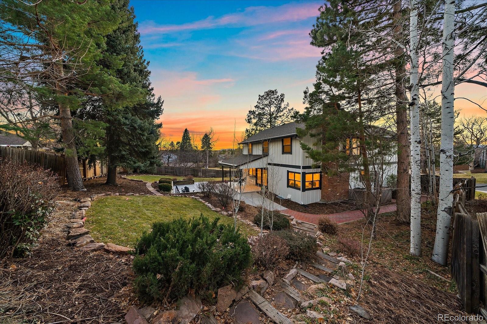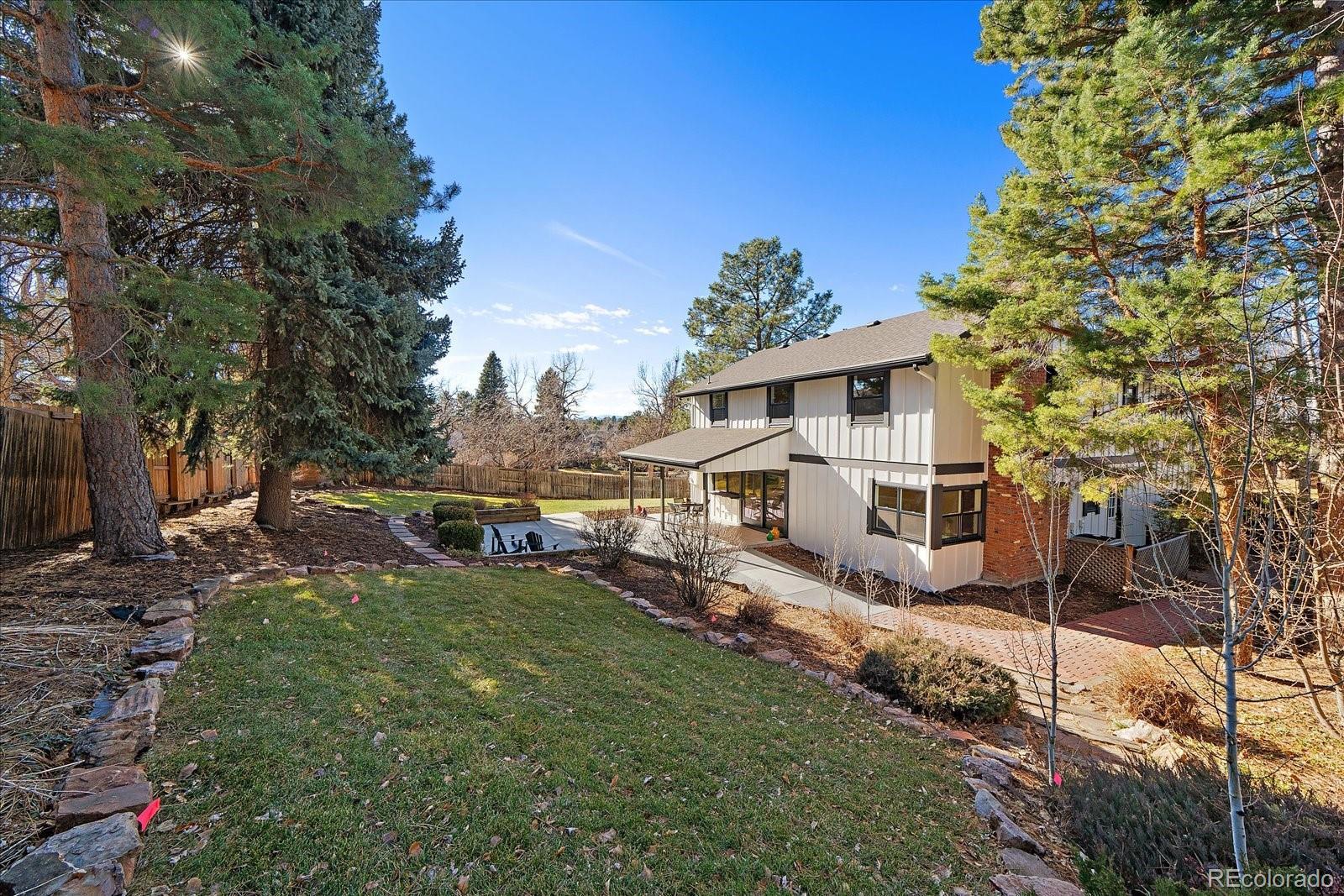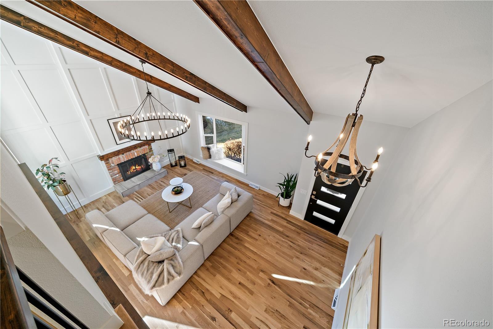 Stunning modern renovation in The Knolls with mountain views. This custom two-story home features an open concept floor plan perfect for entertaining with white oak hardwood floors throughout. Upon entering the home, your eyes will be drawn to the beautiful custom fireplace and beautiful beams. Large Chef’s kitchen with high-end appliances and an over-sized Island open to dining room. Primary suite has a large walk-in closet with custom shelving and en-suite bath with oversized shower with dual rain heads and handhelds. Second level features three additional bedrooms, one includes an en-suite bath, second full bath and laundry with washer/dryer. All new windows. Spacious entertaining patio and a large backyard with all new landscaping and storage shed. The finished basement includes abundant space with a full bath, wet bar and storage. Home is steps away from greenbelt and the Dry Creek Trail, Cherry Knolls Park, neighborhood pool, tennis/pickleball courts and top-rated LPS schools.