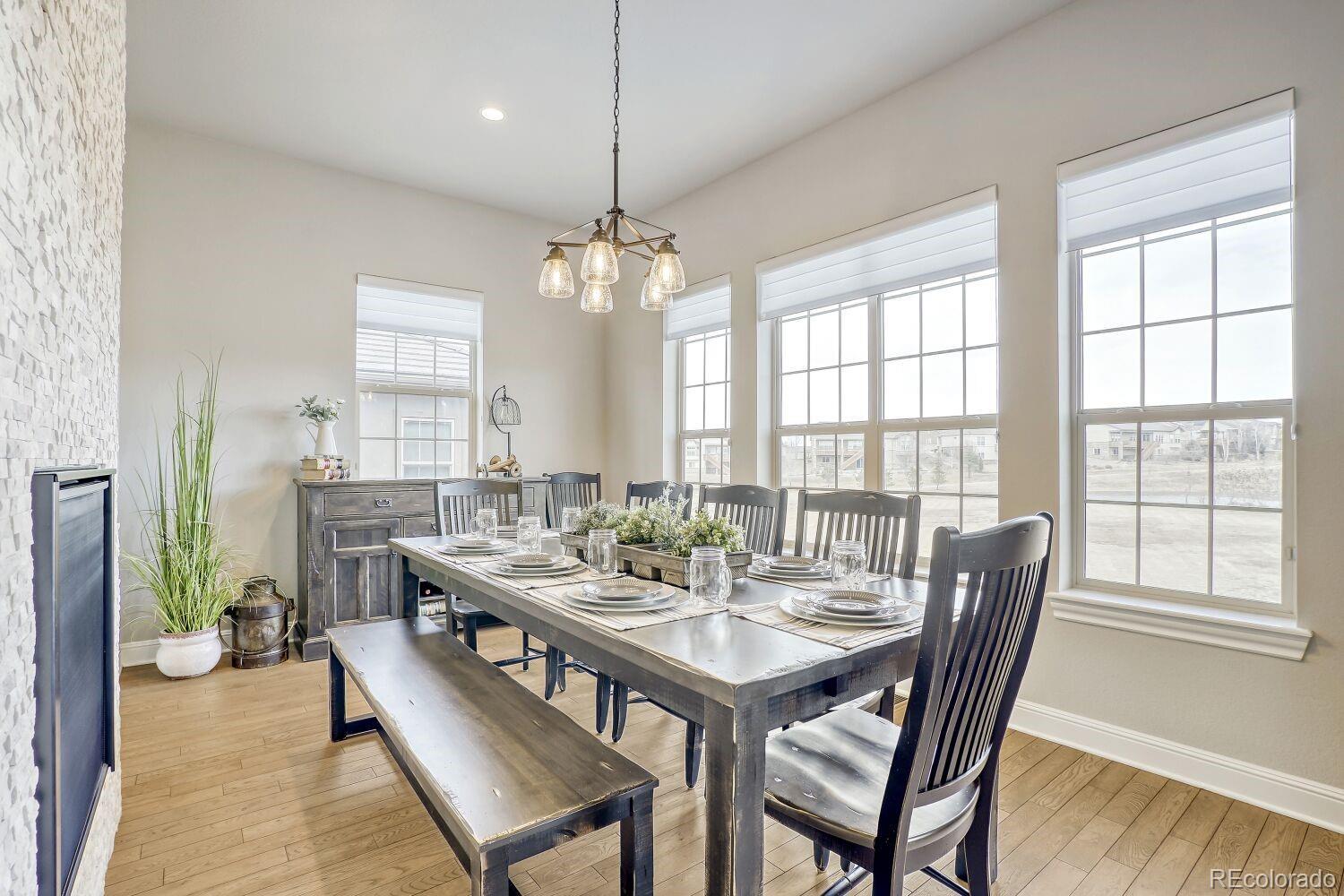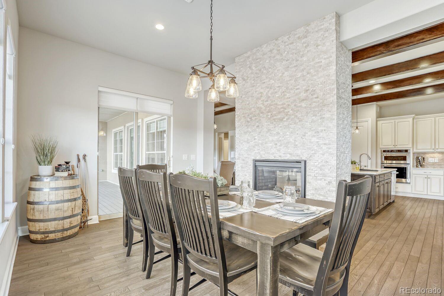 Exceptional Toll Brothers Montana Model showcasing over $100,000 in thoughtful upgrades and designer enhancements. Perfectly positioned on a quiet street backing to serene greenbelt and open space, this home offers both privacy and easy access to nearby walking trails. Extended hardwood flooring flows throughout the main living areas, complemented by soaring ceilings, solid wood doors, and abundant natural light. The inviting layout features a dramatic double-sided fireplace shared between the kitchen and dining area, plus a second fireplace creating warmth and ambiance in the living room. The gourmet kitchen is a true centerpiece with striking two-tone cabinetry, quartz countertops, elegant tile selections, upgraded fixtures, and premium finishes that elevate everyday living and entertaining. Designer bathrooms highlight tile extended to the ceiling, custom floor patterns, tall glass shower doors, and upgraded faucets, sinks, and toilets. The spacious primary suite offers a bay window, private patio door access, and a spa-inspired bath retreat. Outdoor living is enhanced by dual patio doors from both the primary suite and living area leading to an extended back deck ideal for relaxing or hosting. Additional upgrades include a 4-foot expanded and insulated garage, gas line to dryer, fireplace fan, humidifier, radon mitigation system, and upgraded interior doors throughout. The walk-out unfinished basement provides excellent potential for future expansion and customization. Offering 2 bedrooms plus a dedicated office that can easily function as a conforming 3rd bedroom, this home combines flexibility with refined comfort. Residents enjoy access to an impressive 30,000 sq ft recreation center with indoor and outdoor pools, hot tubs, tennis, pickleball, bocce, more than 130 clubs, and a vibrant calendar of social activities. With over 48 miles of walking and biking trails nearby, this property delivers an exceptional lifestyle opportunity in a highly desirable setting.