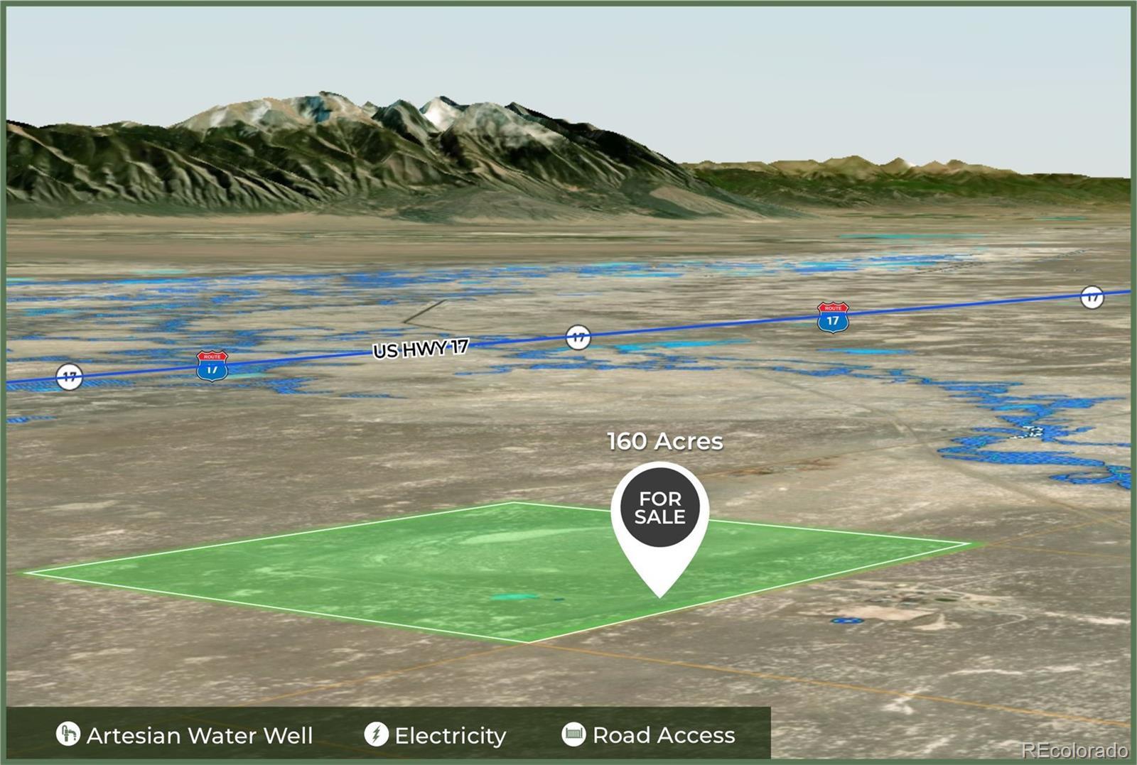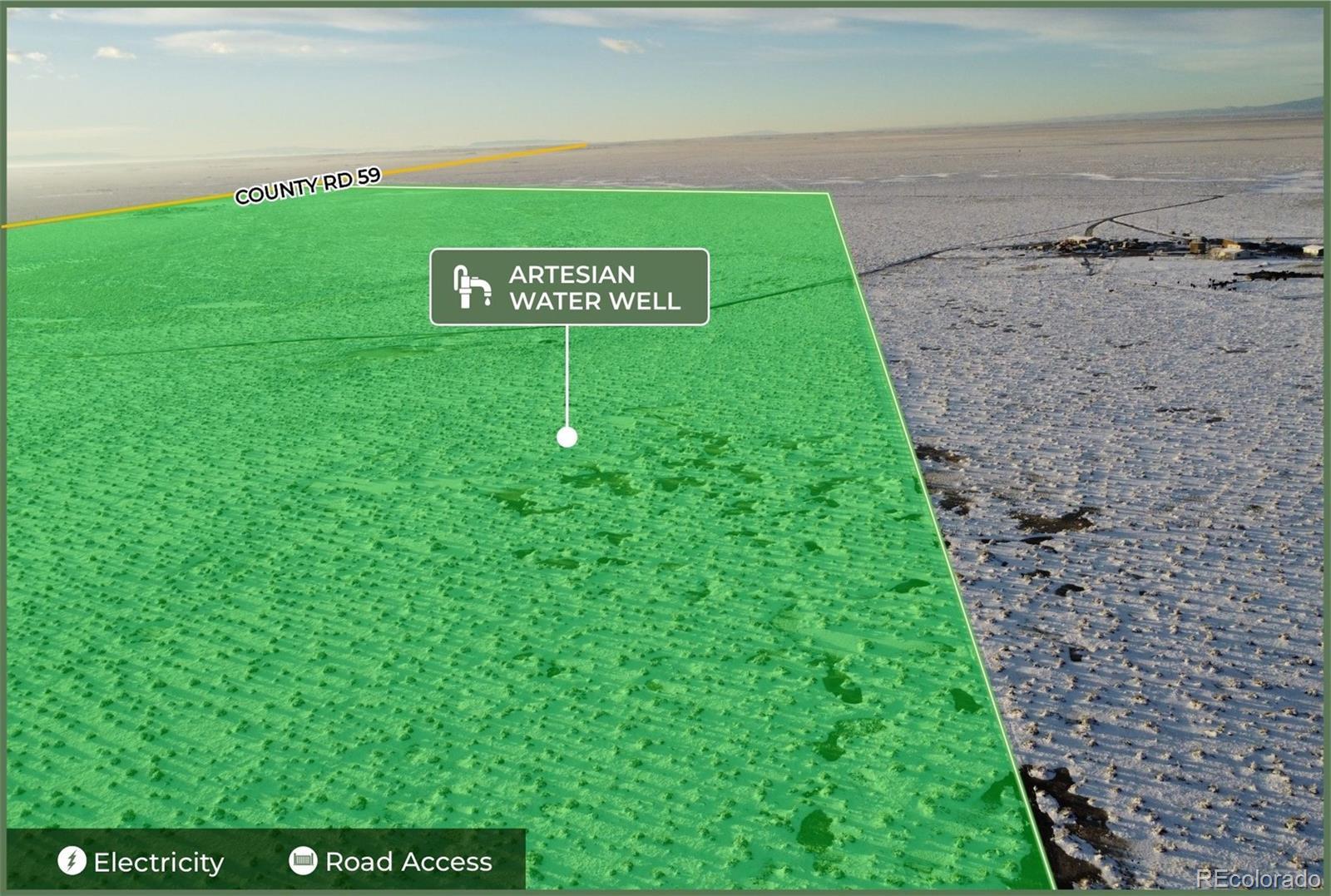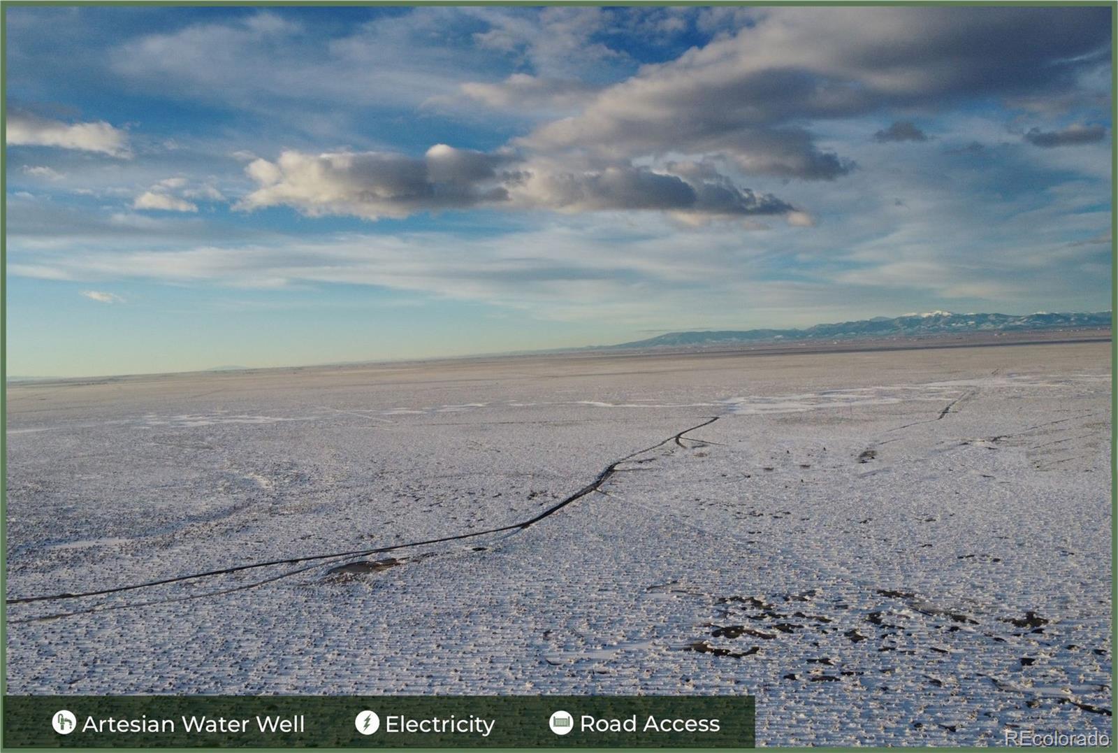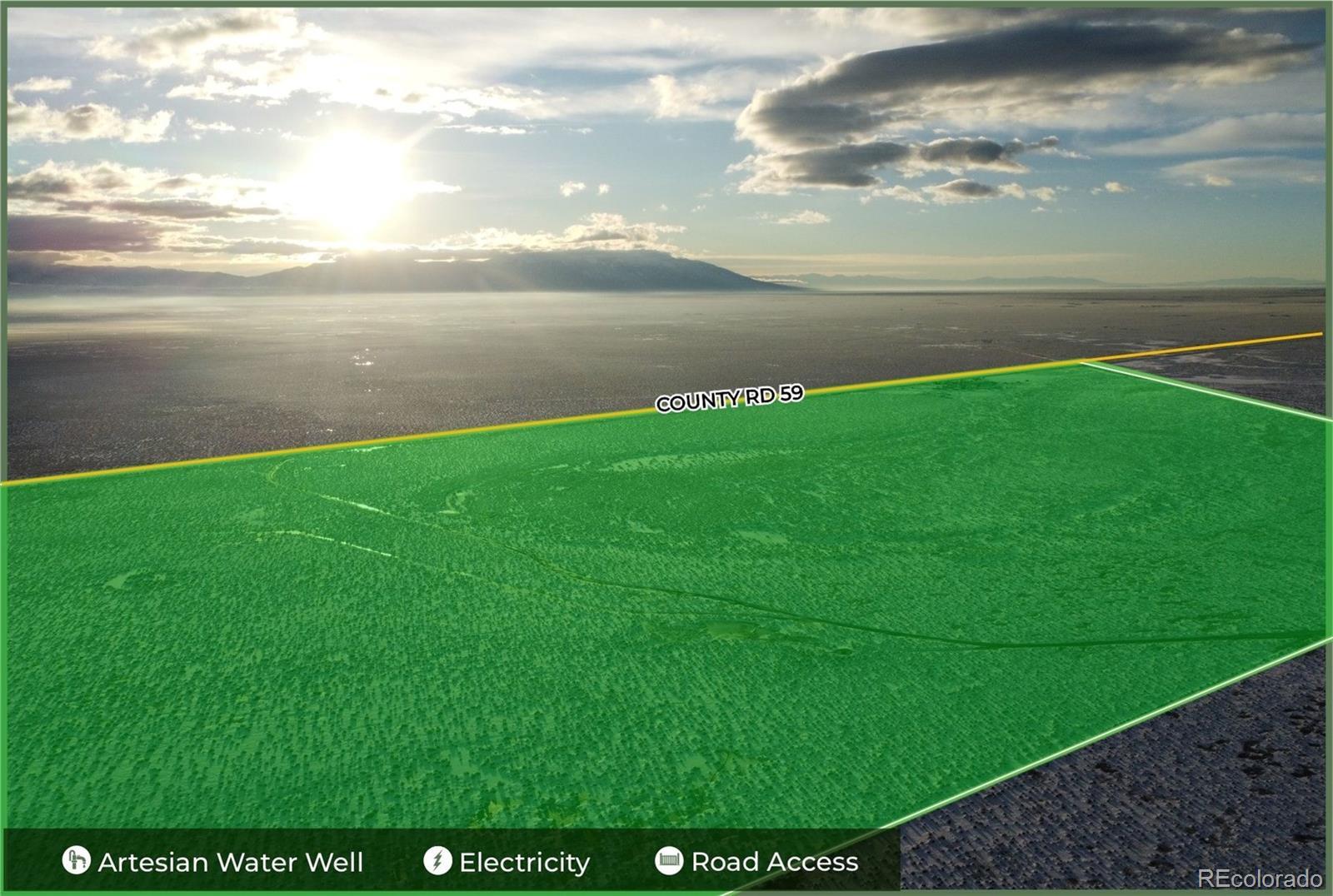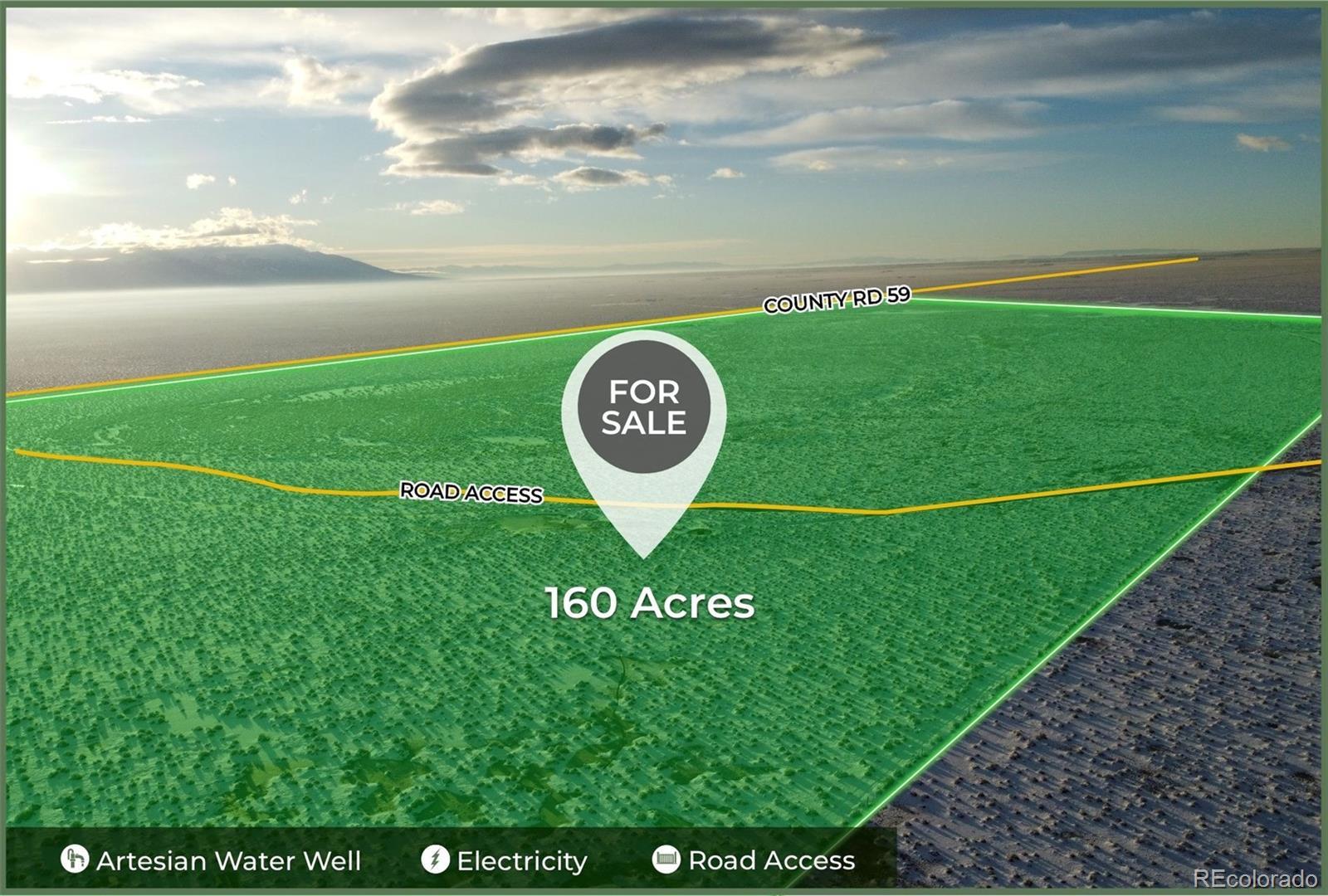 160-Acres with your own ARTESIAN WELL, ELECTRICITY at lot line, and panoramic 360-degree of mountain views plus Great Sand Dunes National Park views! Located in the heart of the San Luis Valley this parcel benefits from DIRECT ACCESS via County Road 59 - a COUNTY-MAINTAINED ROAD. To complete your peaceful and quiet paradise, there's NO NEIGHBORS to the North, South, or East! This expansive property borders public BLM LAND parcels both to the North and the South - plus to the East, it borders the SAGUACHE CREEK STATE LAND TRUST (PUBLIC HUNTING ACCESS) with almost 5,000 acres of recreational land in Game Unit 682. That means that no one will EVER be able to build and block your views in neither North, South, nor East directions. Only 16 minutes to Moffat, CO (7 to 8 miles) and 18 minutes to Hooper, CO...plus only 20 minutes to HOT SPRINGS at the Sand Dunes Recreation Pool. ARTESIAN WELL never stops flowing and its stream has created a small pond - perfect for cattle, irrigation, horses, or anything you want to do with all the water it pumps from the confined aquifer. They don't make these wells often anymore and they are very deep. Land is Flat, usable acreage with panoramic views in every direction. READY TO BUILD! The ARTESIAN WELL provides a rare water advantage, and the presence of ELECTRICITY makes it so that this land is ready to build after septic installation (around $20K). This piece of land is ready to build as fast as you want - you can even split it into two 40-acre parcels and build multiple houses plus be allowed to drill another well. No HOA and no covenants — bring your vision, build your homestead, or hold as a long-term land investment. Easy access to Highway 285 leading directly to Salida, Alamosa, or Denver. Close to top outdoor destinations including the Great Sand Dunes, Monarch Mountain skiing, and the Arkansas River for rafting and fishing. A truly RARE COMBINATION of WATER, POWER, ACCESS, and FREEDOM — we can help with development!