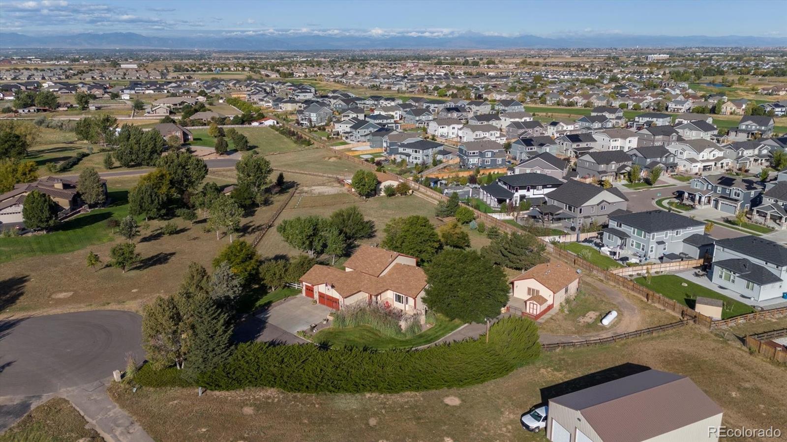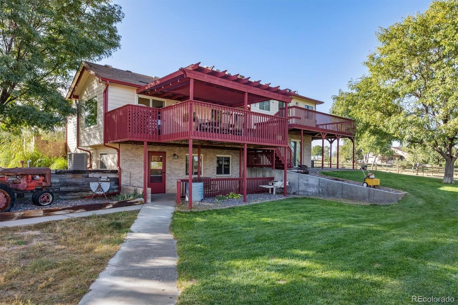 Versatile fenced estate with a 4-bedroom, 4-bath mult-level home, a guest house, outbuilding and 2 stall lean to on nearly 3 acres offers an exceptional opportunity for multigenerational living, as well as animals just minutes from shopping. This thoughtfully designed property combines space, separation & everyday convenience with stunning mountain views. The separate guest house is complete with a ¾ bath, large closet, cabinetry & countertop space—perfect for extended family, a live-in caretaker, home office, or private studio. A heated 1,530 sq ft outbuilding w/concrete floors, 220V power & access from a separate cul-de-sac is great for storage, hobbies, workshop use. Directly adjacent is the lean-to with power, water, a riding arena and 2 separate grazing pastures. Inside the main home, a spacious foyer opens to a main level w/hardwood floors & vaulted ceilings. The upgraded kitchen features a large island, stainless steel appliances, abundant cabinetry & generous counter space, which flows into the formal living room and dining area with expansive windows and plenty of space for entertaining & gatherings. Outdoor living is elevated w/direct access to an expansive multi-level deck ideal for relaxing or hosting while enjoying Colorado sunsets. The upper level includes a private primary suite w/an updated 5-piece bath, walk-in closet & deck access, plus an additional bedroom w/an ensuite bath & walk-in closet—perfect for privacy and separation. The lower level offers a comfortable family room with new carpet & a propane fireplace, a bedroom, ¾ bath & oversized laundry. An additional lower level includes a large media room, bedroom, office, and ¾ bath—creating an ideal layout for extended family or guests. A rare opportunity to own a property that offers privacy, flexibility & room to live together—yet independently—without sacrificing proximity to amenities.