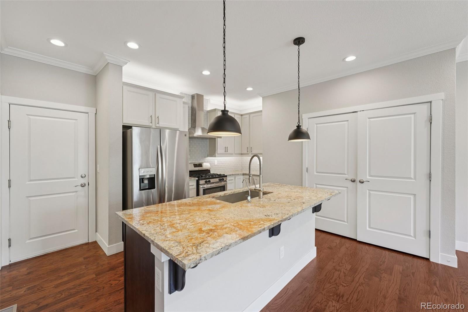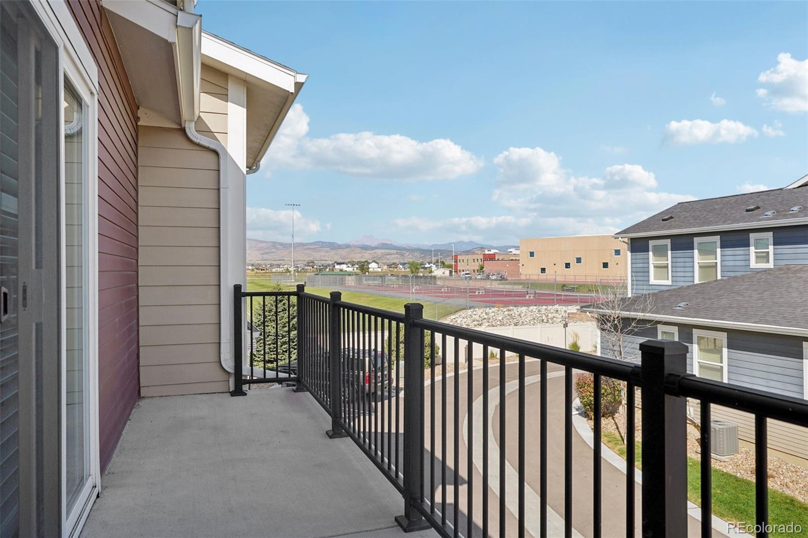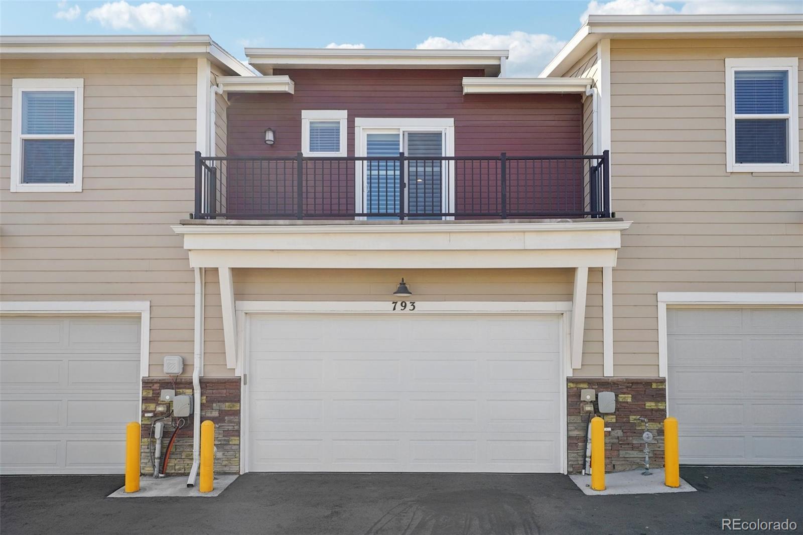 Step inside this modern townhome and immediately feel the pull of the Rocky Mountains right from your front door. Designed with unique touches not found elsewhere in the community, this home boasts an open, light-filled layout that feels both spacious and inviting. The chef’s kitchen is a showstopper with crisp white cabinets, a contrasting extended island, granite countertops, soft gray subway tile, matte-black designer lighting, and a stainless-steel farm-style sink and appliances. A custom double-door pantry keeps all your essentials organized and within reach. Warm hardwood floors flow across the main level while crown molding adds an extra touch of elegance. Thoughtful interior lighting on every floor keeps the space bright, and the modern electric fireplace makes cozy evenings effortless. Upstairs, choose between two incredible suites, each featuring large walk-in closets and spa-inspired bathrooms with upgraded tile and double vanities. Step out onto the upper-level balcony to soak in breathtaking mountain views or breeze through laundry in the conveniently located upstairs laundry room with built-in shelving. The finished basement with high ceilings and multiple windows provides a versatile space perfect as a third bedroom with an ensuite or a large recreation area. Enjoy crisp, clean water every day thanks to the advanced water filtration and softening system. With abundant storage and a two-car garage, there’s room for all your gear. Beyond your doorstep, the neighborhood offers excellent schools and direct access to the 23-acre Dry Creek Park, complete with trails, disc golf, picnic spots, playgrounds, and even a sledding hill. You’re also just minutes from shopping, dining, cinema, Whole Foods, and more, making this home the perfect blend of comfort, style, and convenience.