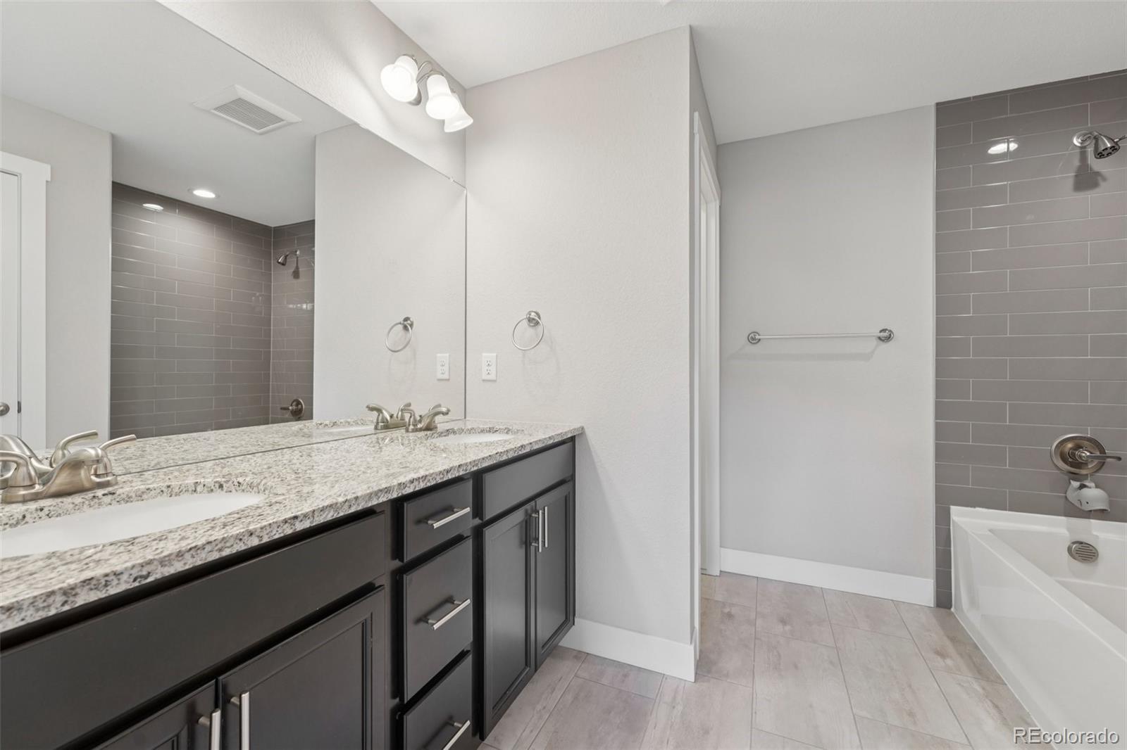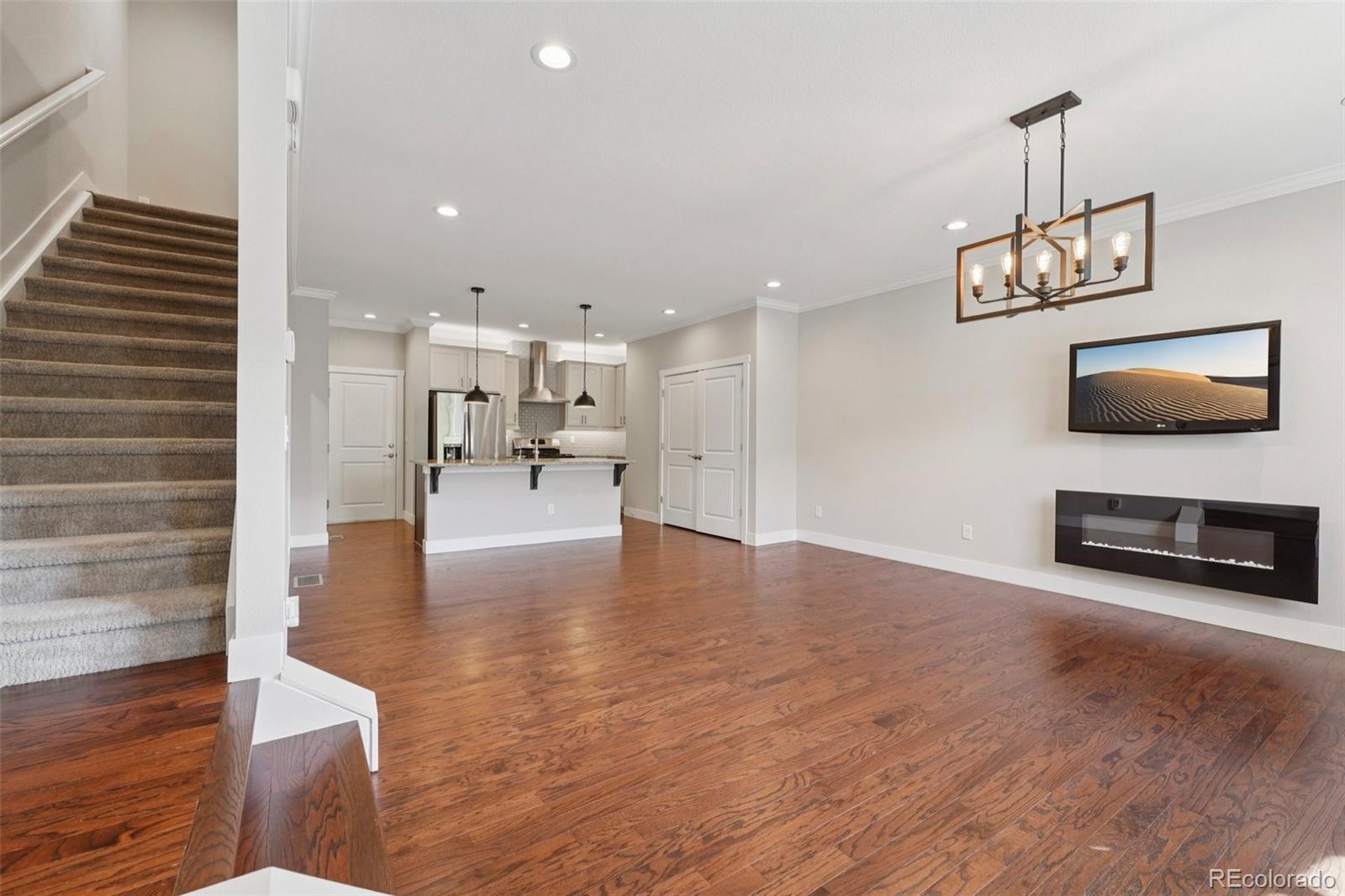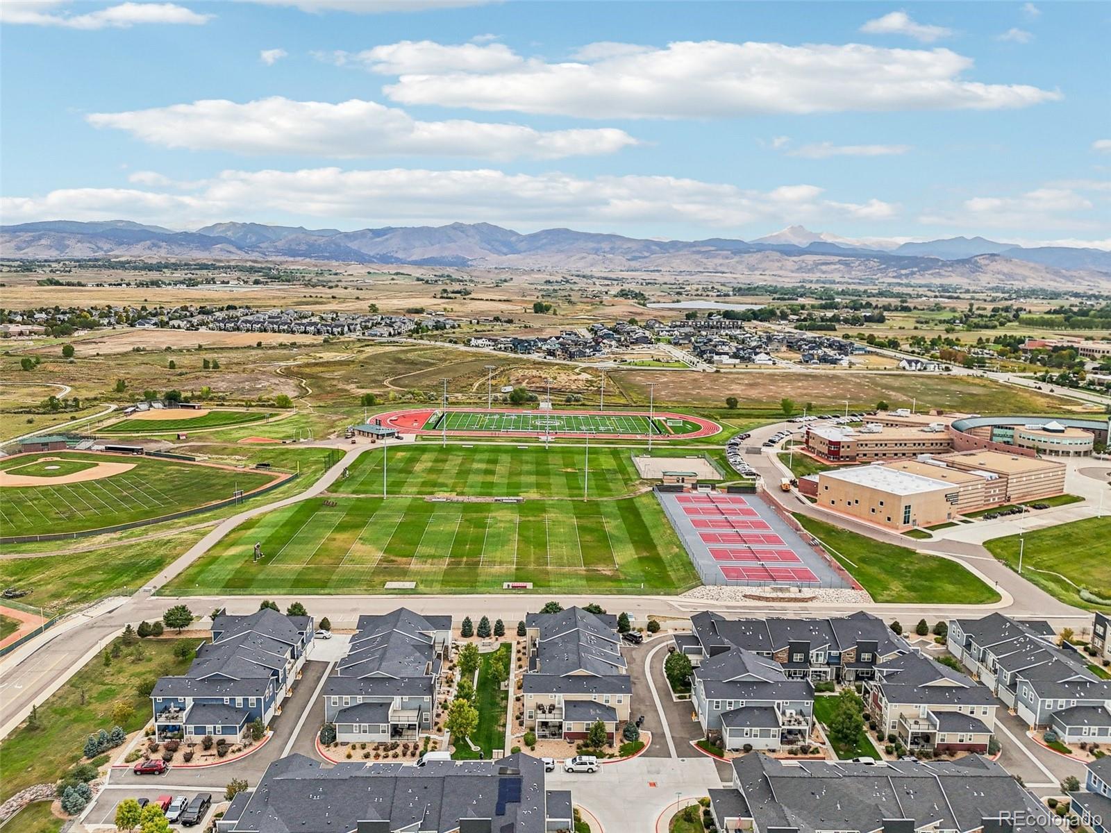 Step inside this modern townhome and immediately feel the pull of the Rocky Mountains right from your front door. Designed with unique touches not found elsewhere in the community, this home boasts an open, light-filled layout that feels both spacious and inviting. The chef’s kitchen is a showstopper with crisp white cabinets, a contrasting extended island, granite countertops, soft gray subway tile, matte-black designer lighting, and a stainless-steel farm-style sink and appliances. A custom double-door pantry keeps all your essentials organized and within reach. Warm hardwood floors flow across the main level while crown molding adds an extra touch of elegance. Thoughtful interior lighting on every floor keeps the space bright, and the modern electric fireplace makes cozy evenings effortless. Upstairs, choose between two incredible suites, each featuring large walk-in closets and spa-inspired bathrooms with upgraded tile and double vanities. Step out onto the upper-level balcony to soak in breathtaking mountain views or breeze through laundry in the conveniently located upstairs laundry room with built-in shelving. The finished basement with high ceilings and multiple windows provides a versatile space perfect as a third bedroom with an ensuite or a large recreation area. Enjoy crisp, clean water every day thanks to the advanced water filtration and softening system. With abundant storage and a two-car garage, there’s room for all your gear. Beyond your doorstep, the neighborhood offers excellent schools and direct access to the 23-acre Dry Creek Park, complete with trails, disc golf, picnic spots, playgrounds, and even a sledding hill. You’re also just minutes from shopping, dining, cinema, Whole Foods, and more, making this home the perfect blend of comfort, style, and convenience.