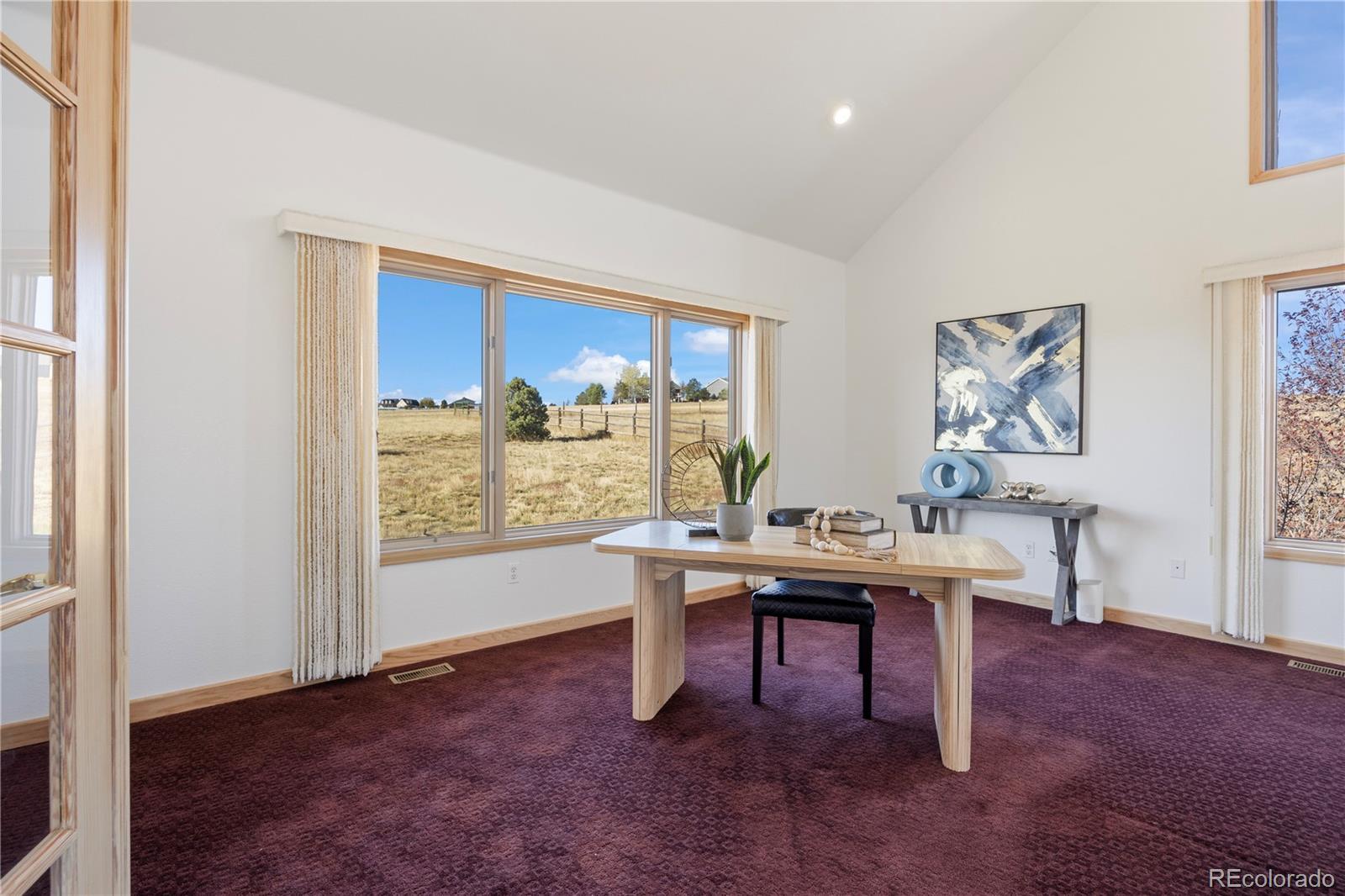Escape to over six acres of serene Colorado countryside at the end of a quiet cul-de-sac in sought-after Amanda Pines Estates. Perfect for country or equestrian living, this Parker residence offers a seamless blend of privacy and space. Step inside to a bright, open floor plan with soaring ceilings, walls of windows, and tree-lined views that frame the barn with views of your horses ~ animals at all times. The chef's kitchen showcases sleek stainless steel appliances, quartz countertops, and a walk-in pantry, while the formal dining room sets the stage for memorable gatherings. Relax in the inviting great room beside a wood-burning fireplace, or step onto the full-length deck to enjoy peaceful sunsets. The primary suite is your private retreat, complete with its own balcony for morning coffee or evening sunsets, dual walk-in closets, and a spa-inspired five-piece bath with a soaking tub and glass shower. Upstairs, you'll find three additional bedrooms with generous closet space and a convenient laundry area. A main-floor office provides an ideal work-from-home space. The finished walkout basement offers another fireplace, an additional bedroom and bath, and a theater like area ~ perfect for movie nights or entertaining. Equestrian enthusiasts will appreciate the three-stall barn with power, water spigot, and hay storage, plus ample space to add an outdoor arena. The insulated three-car garage with epoxy floors ensures plenty of storage and easy upkeep. Tucked away for privacy, yet only minutes from Parker's shops, dining, and Douglas County schools, this property delivers the best of Colorado country living without sacrificing convenience. It just keeps giving! Come see it today.
