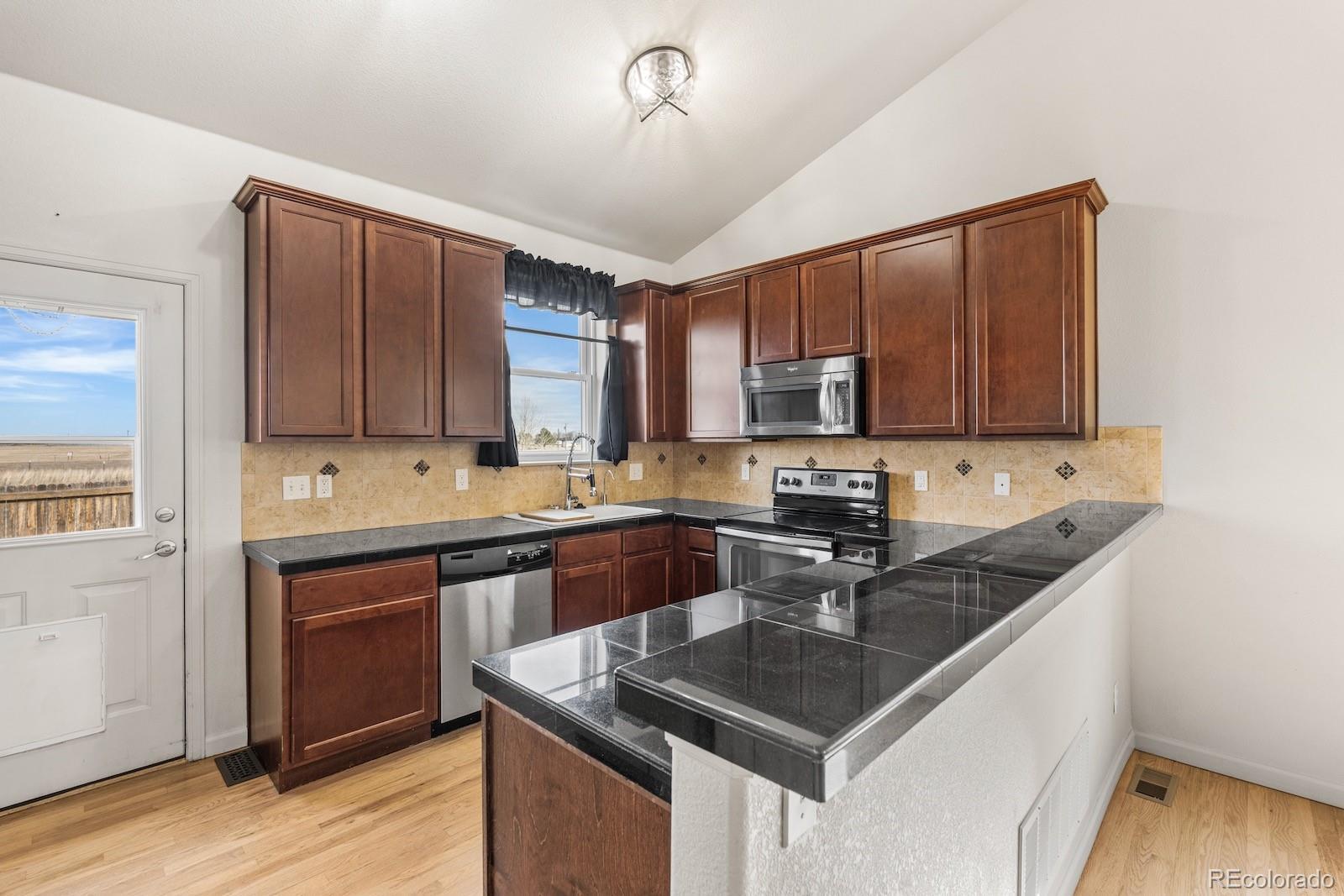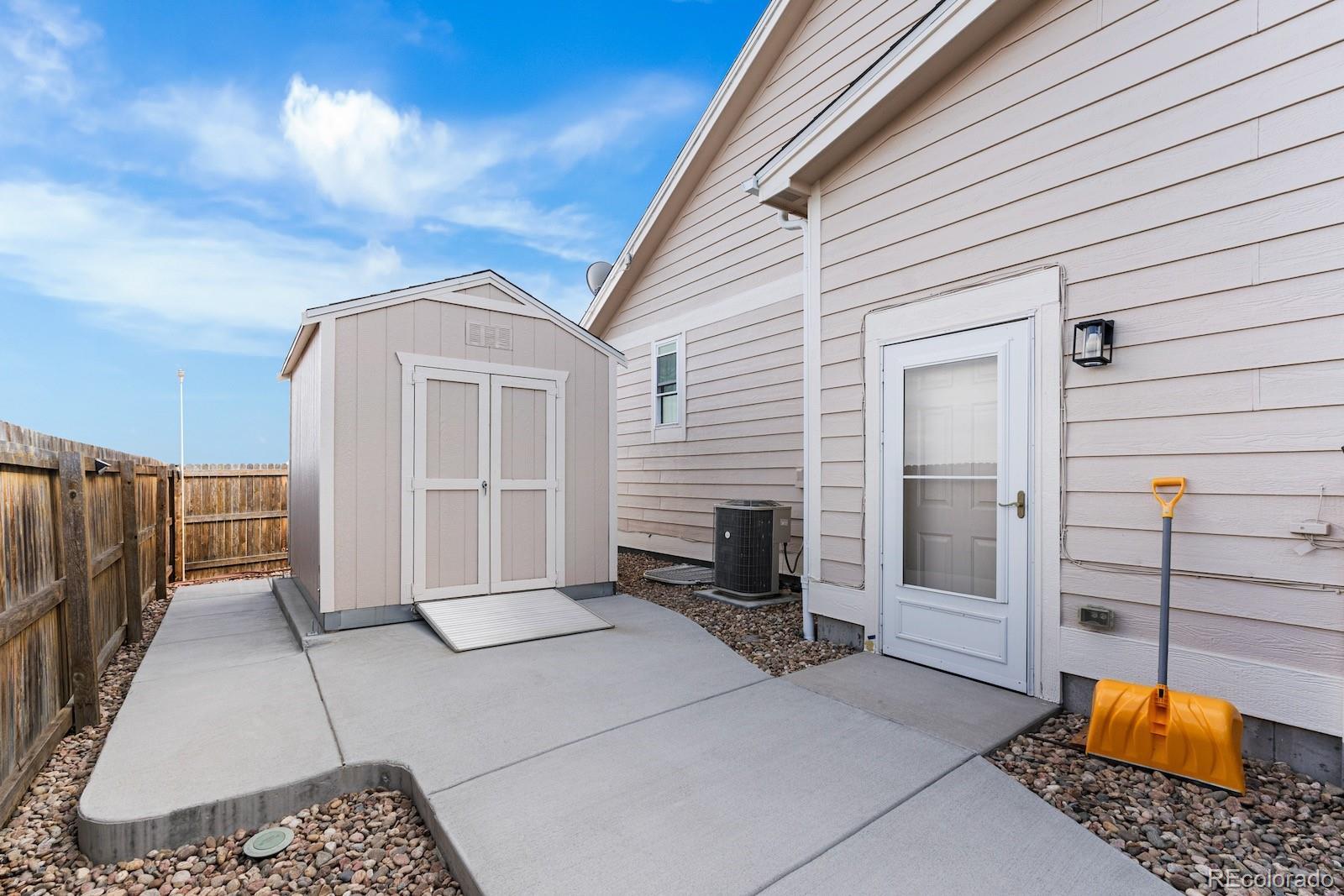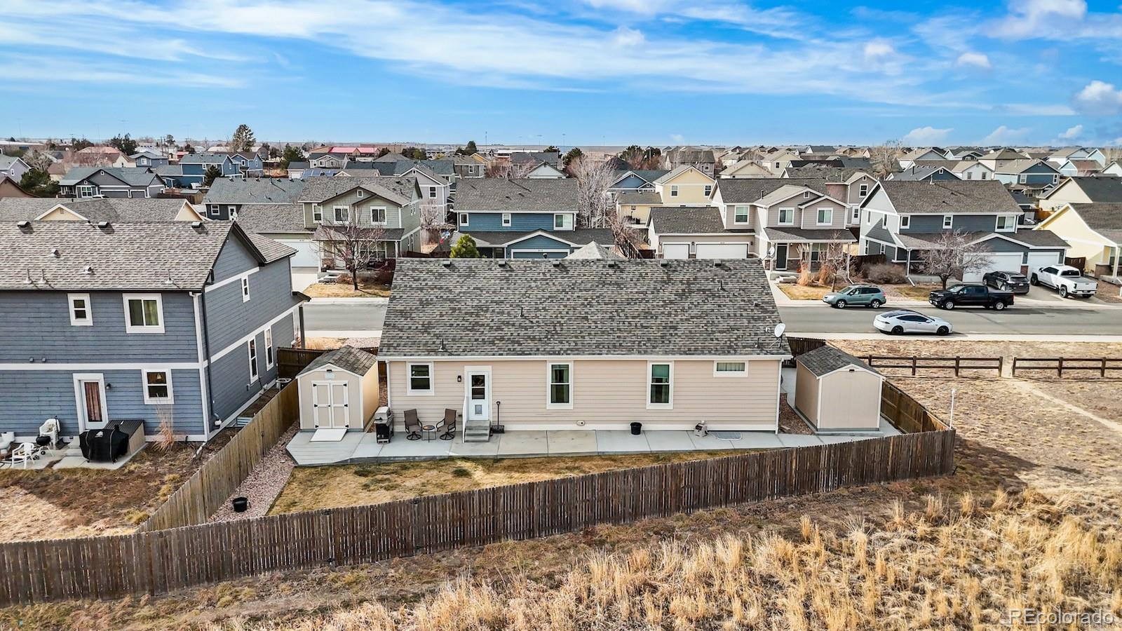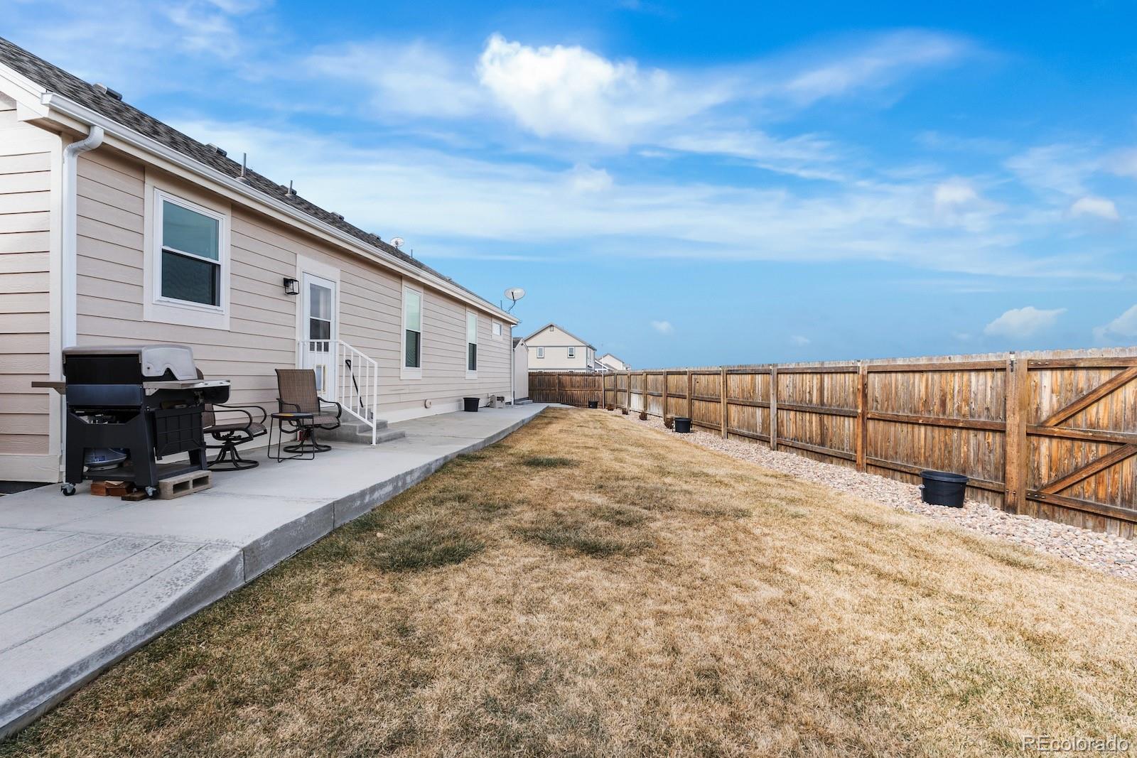 Welcome to this meticulously updated ranch-style home in the sought-after Coyote Ridge community of Strasburg, where small-town charm meets modern convenience. Situated on a premium lot with no neighbors on two sides, this property is uniquely positioned adjacent to peaceful open space both to the side and behind the home, offering rare privacy and expansive "big sky" views. From the moment you arrive, the pride of ownership is evident in the professional landscaping, concrete walkways that wrap around the entire house, and the high-end updates including a new roof and fresh exterior paint completed in 2023. Inside, the open-concept living area boasts vaulted ceilings, a cozy gas fireplace, and brand-new flooring that flows throughout the main level. The kitchen is a chef's delight with updated fixtures, a trash compactor, and a sophisticated reverse osmosis water filtration system serving both the sink and refrigerator. This home is designed for longevity and comfort, featuring energy-efficient Champion windows, a 50-gallon water heater, and a whole-home humidifier. The primary suite serves as a true retreat with a five-piece master bath and spacious walk-in closets, while all bedrooms include ceiling fans and wall-mounted TVs or mounts that stay with the home. For those who need space for hobbies or storage, the attached three-car garage is a standout with its epoxy-coated floors, upgraded R13/15 insulated doors, and premium LiftMaster side-mount openers, supplemented by two additional storage sheds in the fully fenced backyard. While the 1,270-square-foot basement remains mostly unfinished and ready for your custom touch, it already includes a fully finished bathroom, providing a significant head start on future equity. Located just a short commute from Denver and DIA, this home offers a quiet escape with low HOA dues that cover trash and snow removal, and because it is eligible for USDA financing, qualified buyers can move in with no money down.