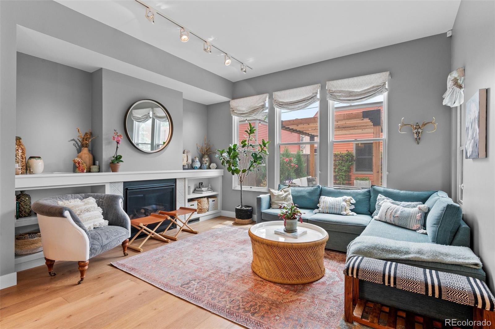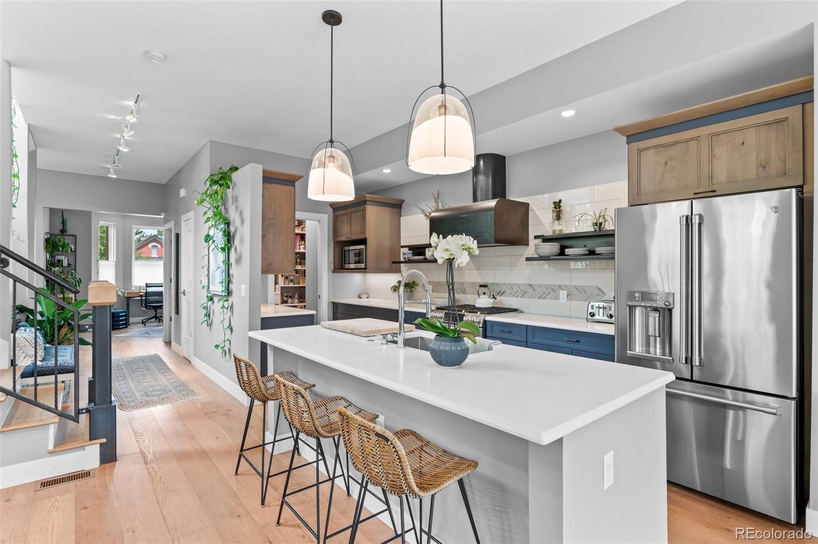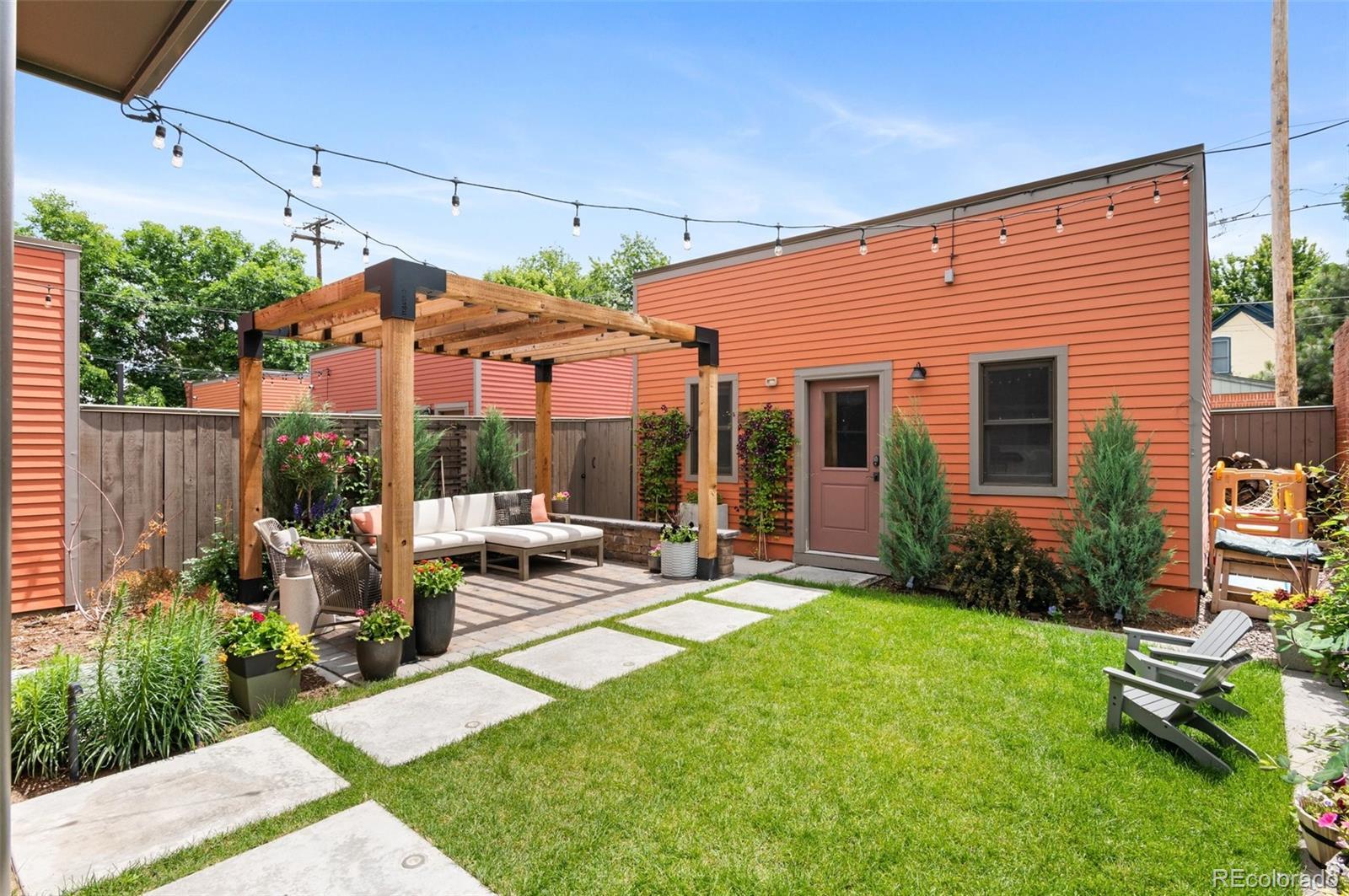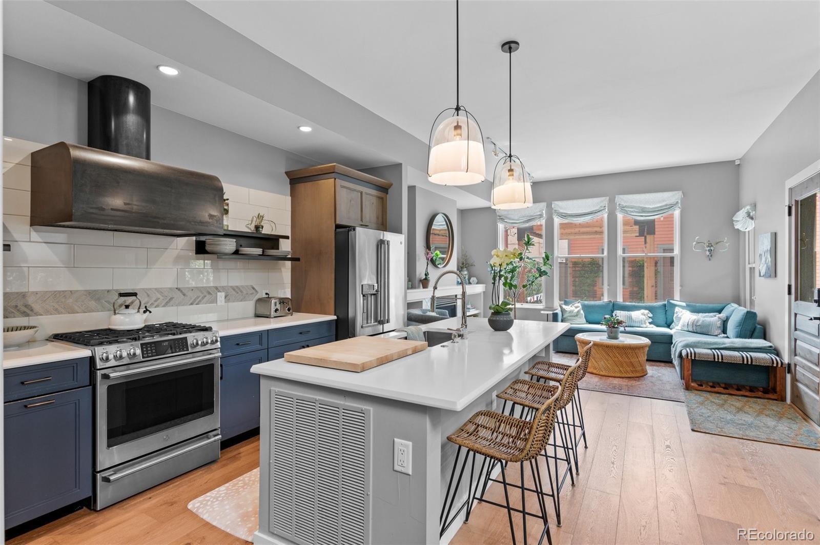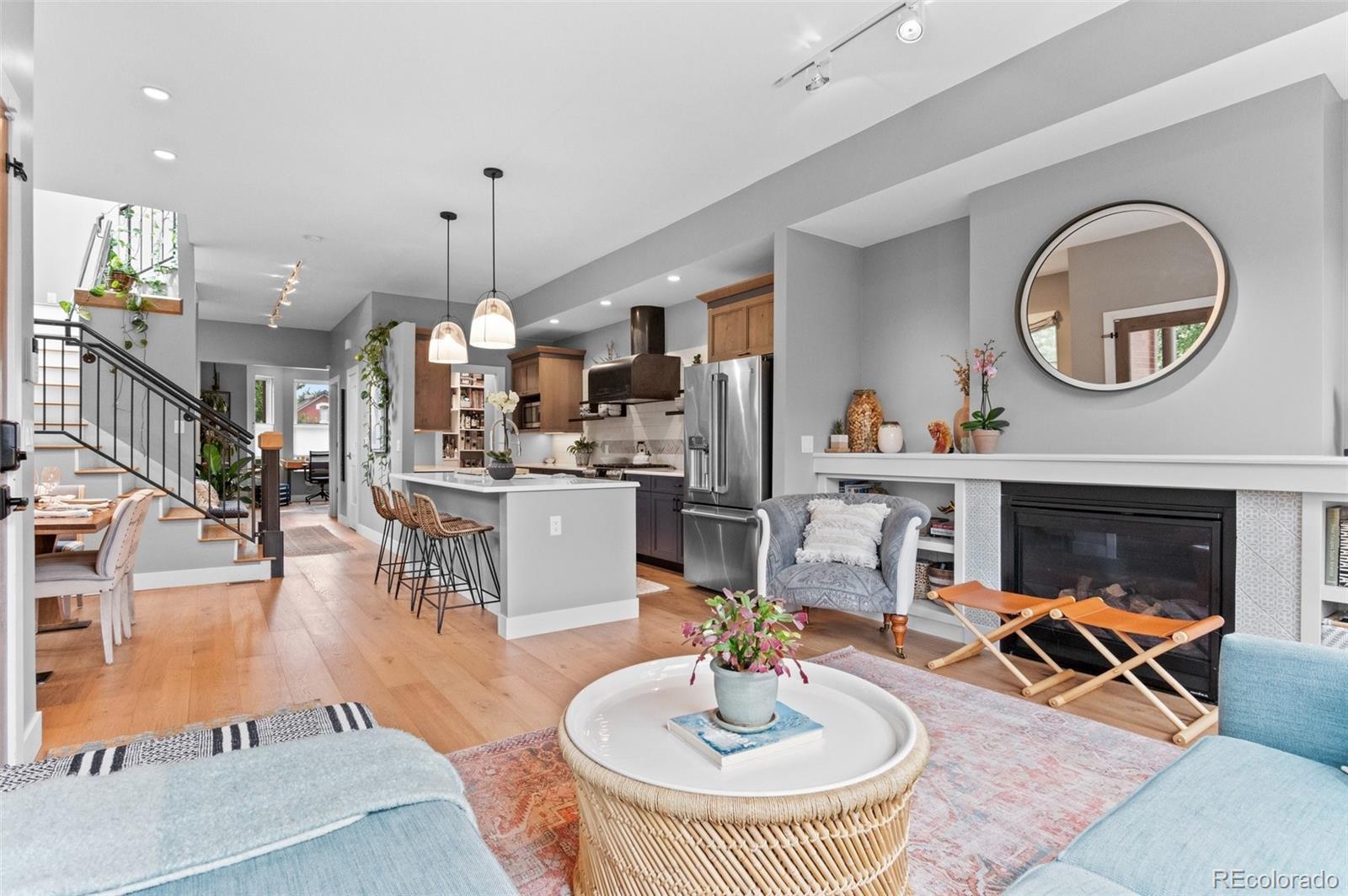 Welcome to this thoughtfully designed and elegantly appointed end-unit townhome located in the heart of historic Curtis Park. Constructed in 2018, this four-bedroom, four-bathroom residence harmoniously combines the charm of Curtis Street with its brick construction, covered front porch, and two-story bay windows, while simultaneously embracing the contemporary amenities sought by discerning buyers. The open floor plan, high ceilings, and three-story grand staircase that floods the basement with natural light create a spacious and inviting space. Upon entering the foyer, the main floor features an office, gourmet kitchen, dining area, and a great room. The chef-inspired kitchen boasts an expansive eat-in island, quartz countertops, stainless steel appliances, a six-burner gas stove with a custom Zephyr hood, walk-in California Closet designed butler pantry, and overlooks the dining area and great room with a gas fireplace. Ascending the light-filled staircase to the upper level, the primary en-suite bedroom offers a walk-in closet, electronically shaded skylight, and an attached five-piece bath with a soaking tub and large shower. It is conveniently separated from the other two bedrooms by a laundry room with task sink and a full bath. The fully-finished spacious lower level features a living room, office nooks, a fitness area with a children’s climbing wall and an oversized additional bedroom with a walk-in closet, egress, full bath and additional storage. The meticulously maintained landscaped grounds include an outdoor dining area, built-in Blaze gas grill, a paver patio with pergola, a smart sprinkler system with drip lines and architectural lighting. The oversized two-car detached garage with custom storage solutions is located off a recently paved wide alleyway. This well-constructed home is situated one block from Curtis Park, three blocks from RiNo’s Larimer Street, and four blocks from Five Point’s Welton Street corridor.