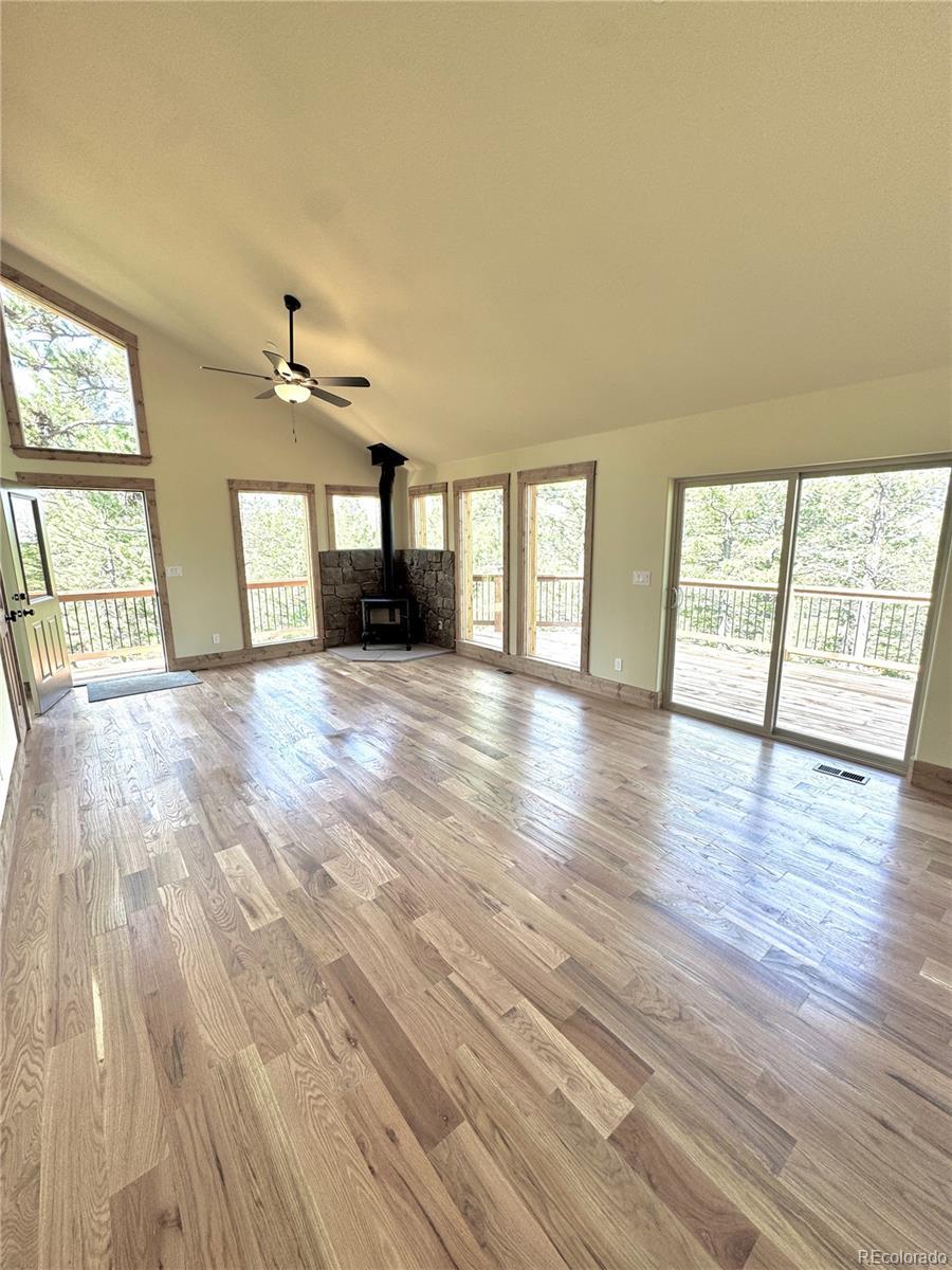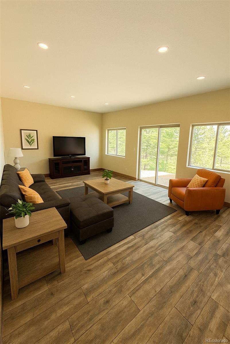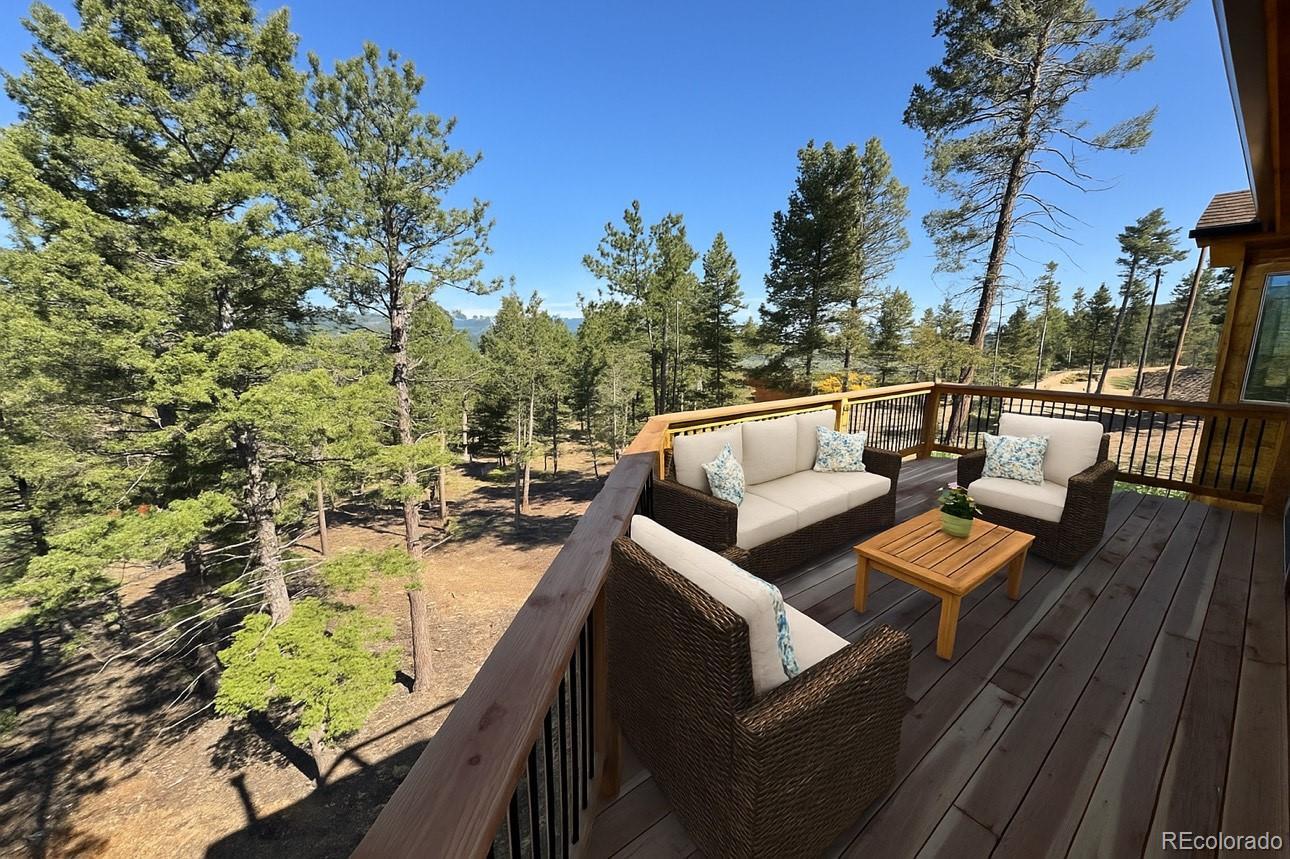 The ONLY NEW CONSTRUCTION home in Mountain Area! Featuring jaw dropping views and wonderful natural light from every angle of this feature rich home. The seamless open floor plan showcases beautiful hardwood floors, hickory self-closing cabinets complemented with granite countertops. The main floor hosts two spacious bedrooms with vaulted beam ceilings throughout, ceiling fans, and ample closet space. The bath features a dual sink vanity, large mirror, and tiled shower and floor. Enjoy outdoor entertaining on the red wood deck with views of Mt. Blue Sky and a private, local ski area. The finished walk-out garden level includes 10-foot ceilings, second bathroom with shower, washer/dryer hook up and a third bedroom, large office and family room. This home is the pinnacle of mountain living, tucked away in the foothills, minutes away from shopping and dining including King Soopers, Safeway and all three Conifer schools, and a short drive to Conifer, Evergreen and several Jefferson County Open Space parks as well as regional attractions such as Red Rocks. An effortless commute to Denver allows you to embrace mountain living with this very rare opportunity. Design vision unlocked ? Furniture shown is virtual staging to help you imagine the possibilities.