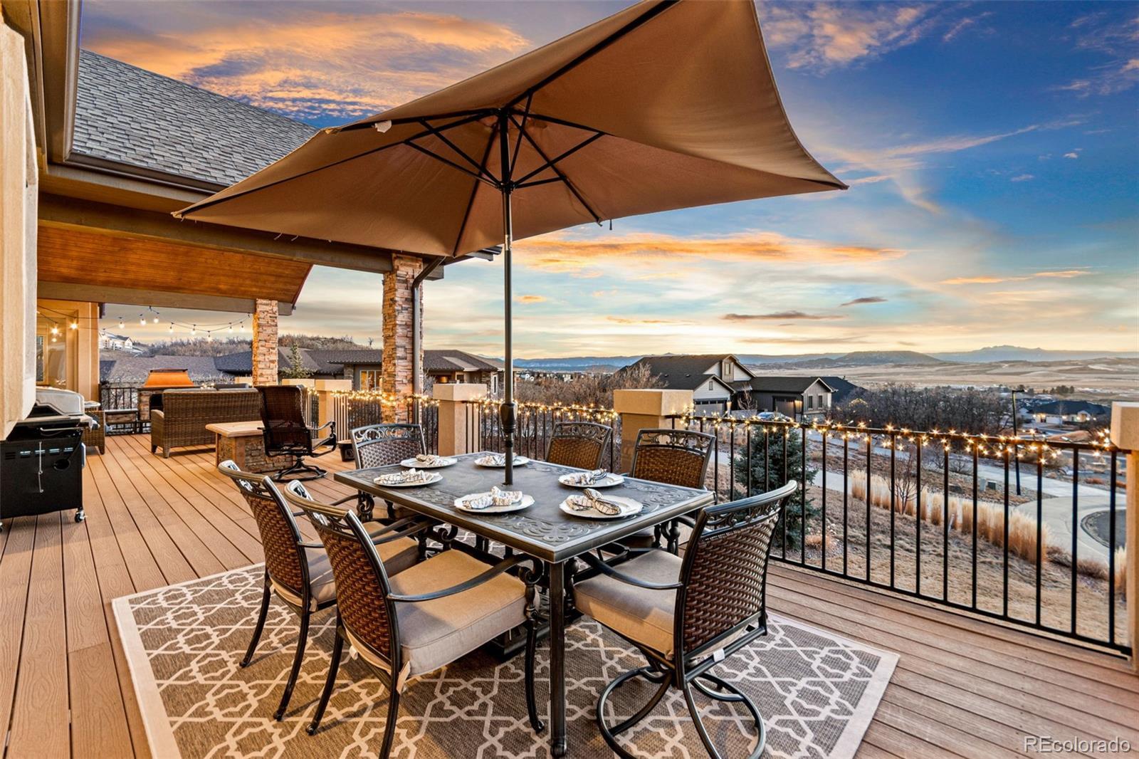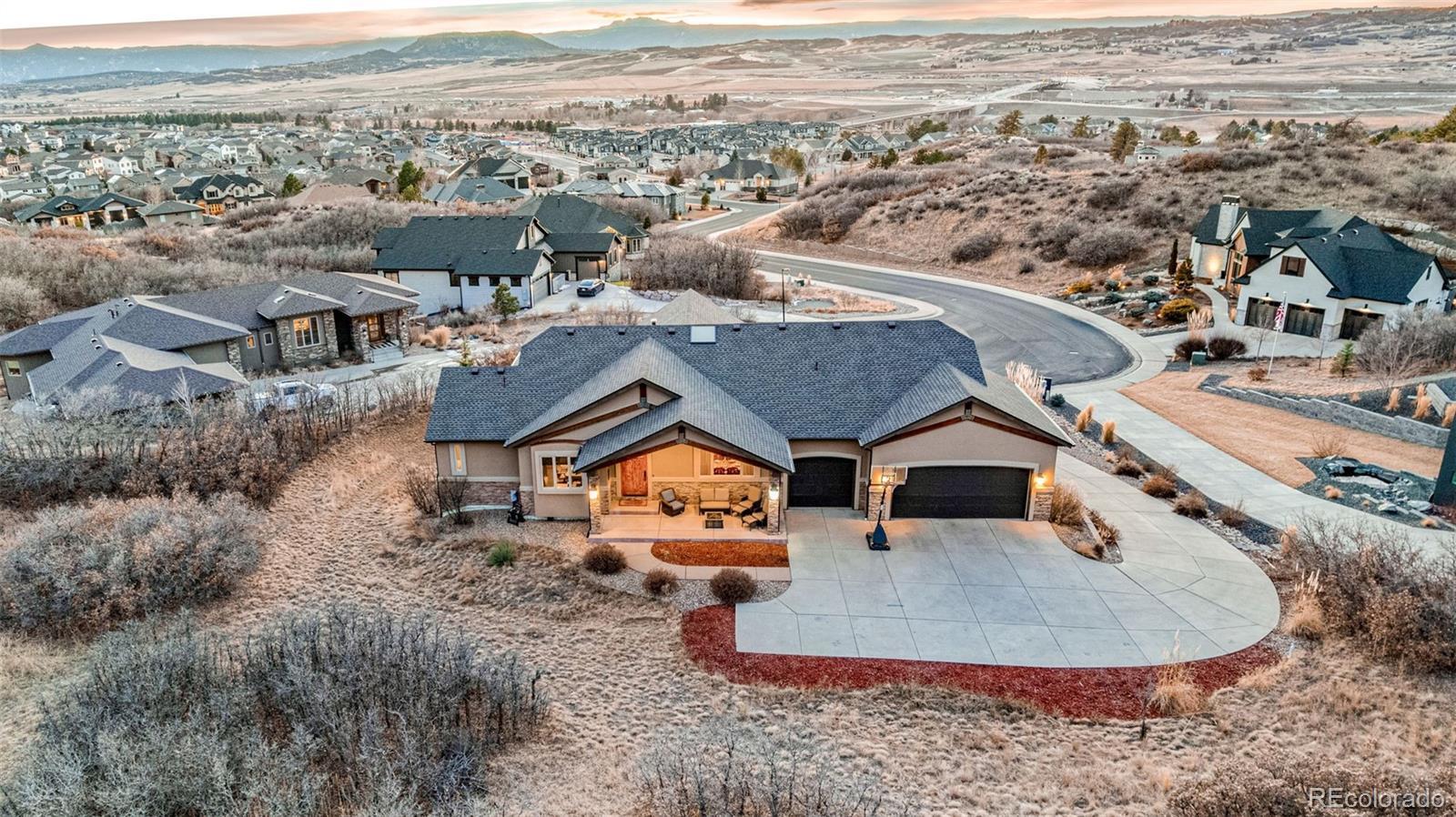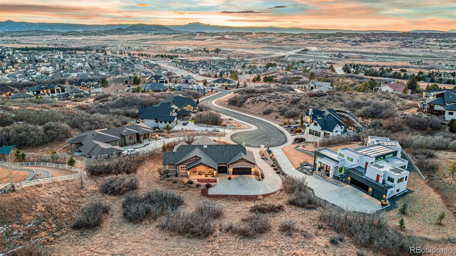Nestled at the end of a long private cul-de-sac, this extraordinary ranch is where refined luxury meets the quiet beauty of the Front Range. Set against a peaceful private mesa, the home captures sweeping mountain views—including iconic Pikes Peak—creating a breathtaking backdrop that defines quintessential CO living. The expansive rear deck is designed for year-round enjoyment, featuring a wood-burning fireplace, intimate seating, and space to dine beneath big skies. From sunrise coffee to evenings under the stars, the ever-changing landscape becomes part of daily life. Inside, warmth, natural light, and effortless flow create an inviting retreat. True single-level living centers around open sight lines connecting the kitchen, dining, & living areas, where expansive windows frame the views and a fireplace adds comfort and charm. The chef’s kitchen blends beauty and function with SS appliances, a generous island, counter space galore, pantry, & a cozy breakfast nook. A blissful primary bedroom with a spacious ensuite and walk-in closet along with a well-appointed office and 1/2 bath round out the main level. The walk-out finished lower level extends the lifestyle with three additional bedrooms, two baths, and a large family room anchored by a fireplace, wet bar, and a wine closet is perfect for hosting or multigenerational living. A handcrafted log-cabin playroom adds a one-of-a-kind touch designed for imagination and lasting memories. Geothermal heating & cooling provide exceptional efficiency and year-round comfort, complemented by whole-home air filtration for enhanced indoor quality. New roof 2024. Meticulously maintained and turnkey, this sanctuary offers the balance of serenity and convenience w/ no HOA - minutes from charming downtown Castle Rock, everyday amenities, dining, shopping, trails, I-25, & community connection. More than a home, it’s a CO lifestyle. Come experience the views, the privacy, and the feeling of living where the front range meets home.