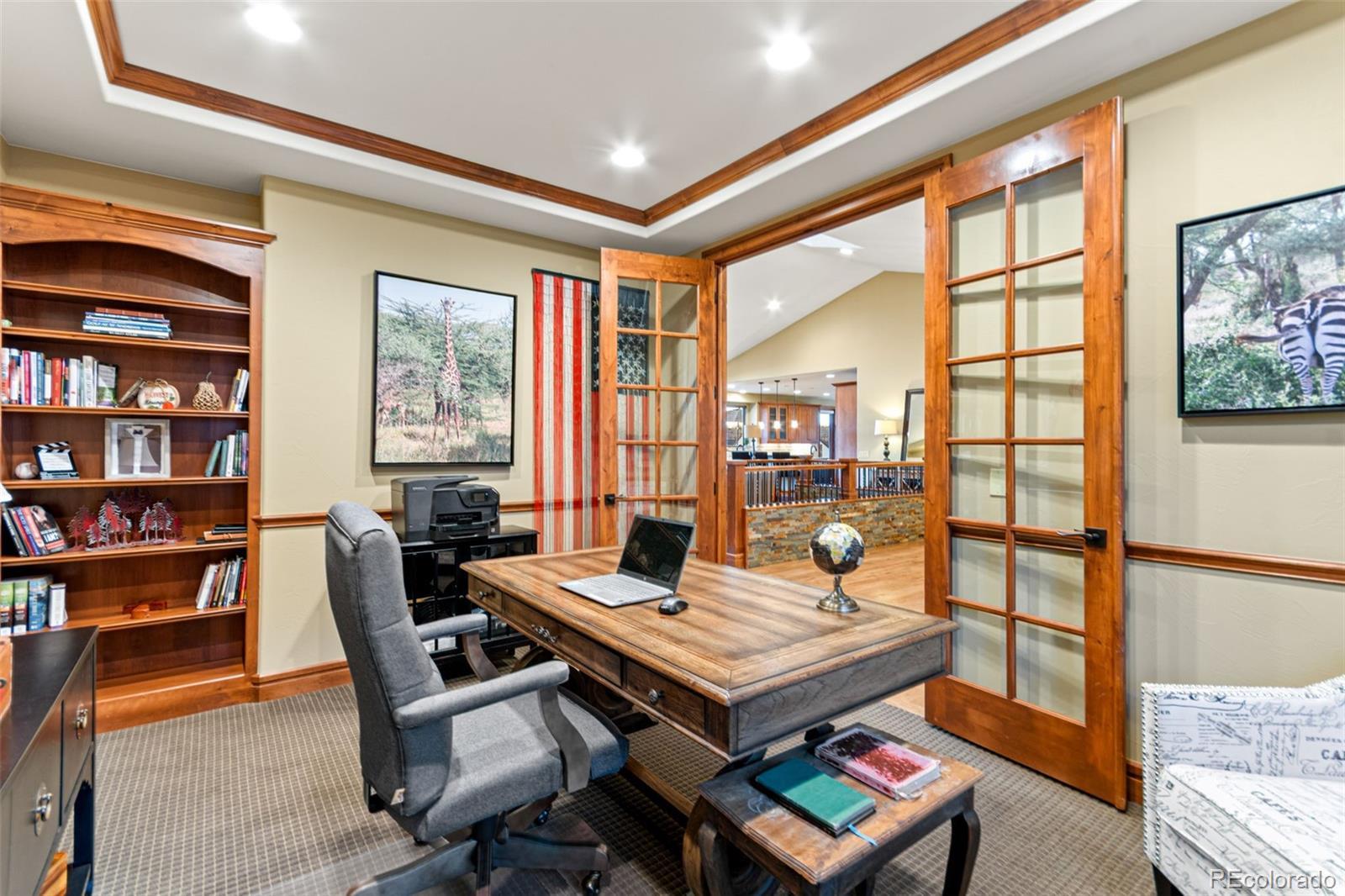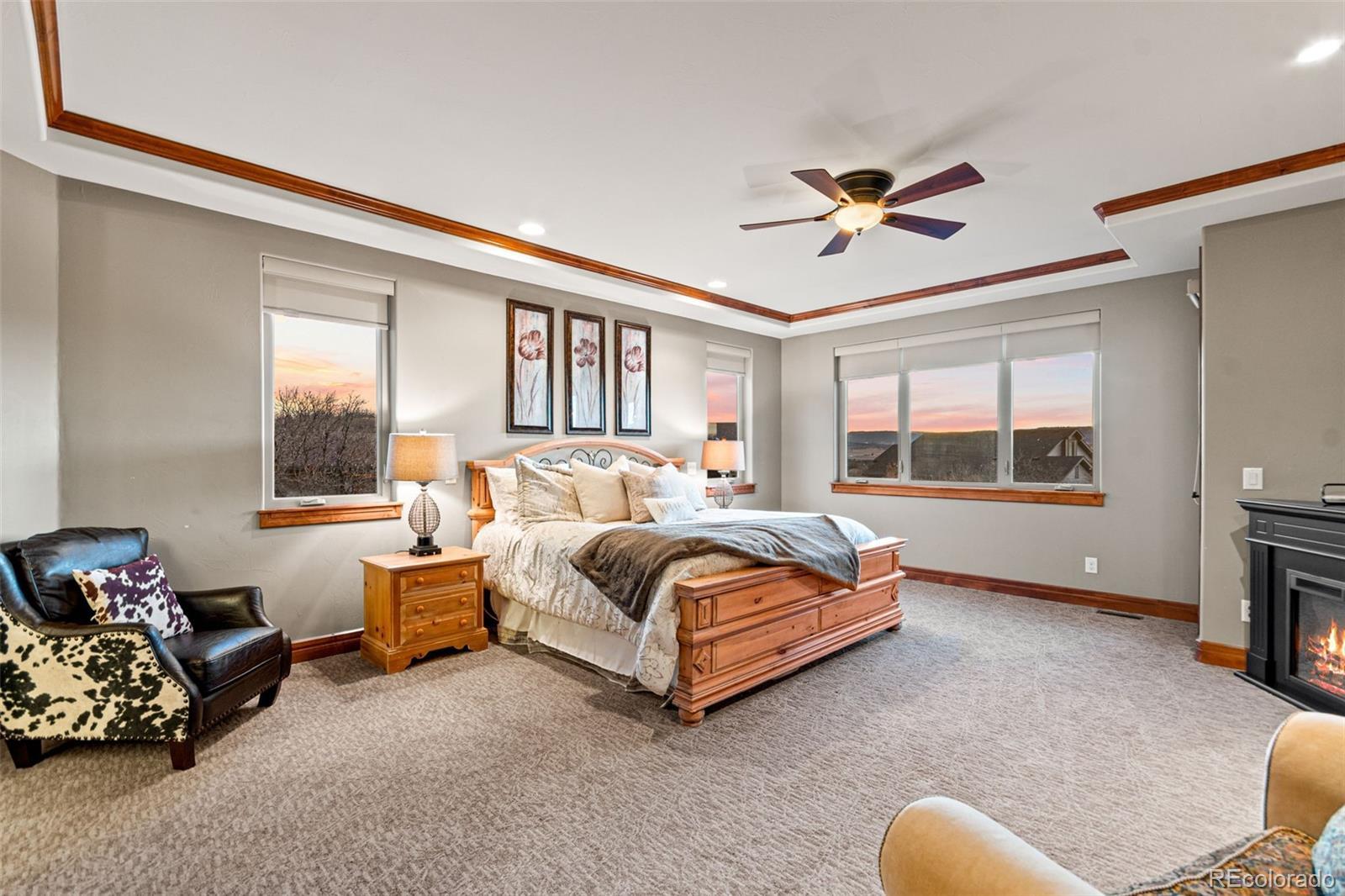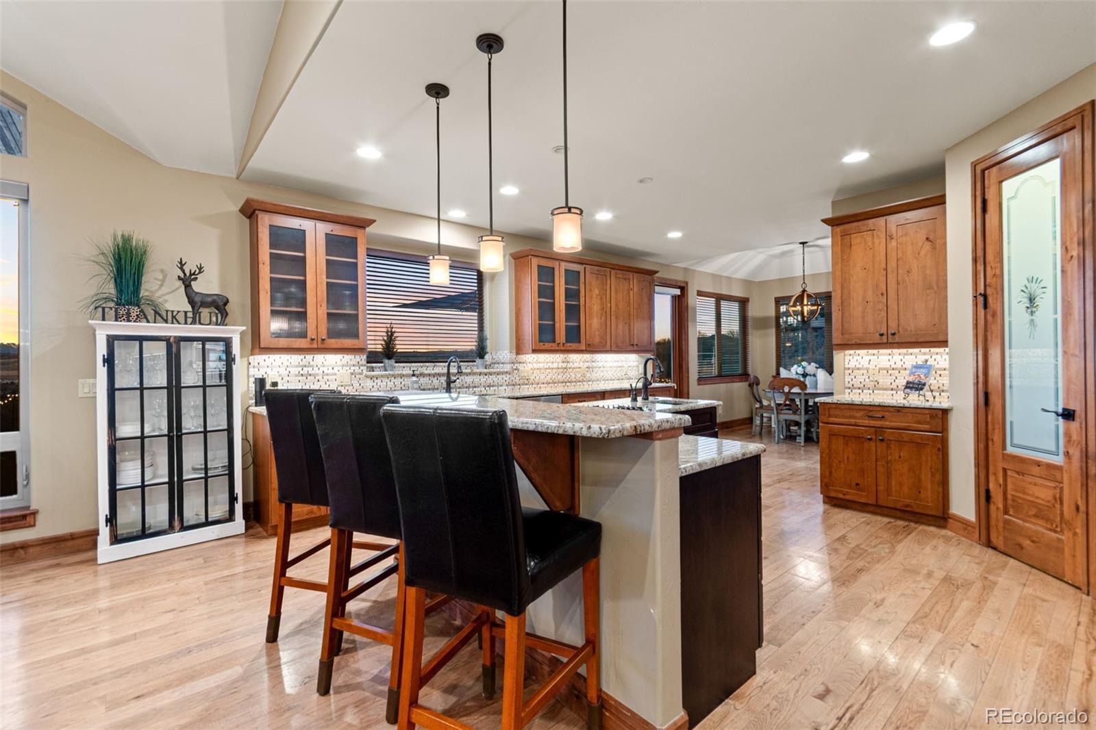 Nestled at the end of a long private cul-de-sac, this extraordinary ranch is where refined luxury meets the quiet beauty of the Front Range. Set against a peaceful private mesa, the home captures sweeping mountain views—including iconic Pikes Peak—creating a breathtaking backdrop that defines quintessential CO living. The expansive rear deck is designed for year-round enjoyment, featuring a wood-burning fireplace, intimate seating, and space to dine beneath big skies. From sunrise coffee to evenings under the stars, the ever-changing landscape becomes part of daily life. Inside, warmth, natural light, and effortless flow create an inviting retreat. True single-level living centers around open sight lines connecting the kitchen, dining, & living areas, where expansive windows frame the views and a fireplace adds comfort and charm. The chef’s kitchen blends beauty and function with SS appliances, a generous island, counter space galore, pantry, & a cozy breakfast nook. A blissful primary bedroom with a spacious ensuite and walk-in closet along with a well-appointed office and 1/2 bath round out the main level. The walk-out finished lower level extends the lifestyle with three additional bedrooms, two baths, and a large family room anchored by a fireplace, wet bar, and a wine closet is perfect for hosting or multigenerational living. A handcrafted log-cabin playroom adds a one-of-a-kind touch designed for imagination and lasting memories. Geothermal heating & cooling provide exceptional efficiency and year-round comfort, complemented by whole-home air filtration for enhanced indoor quality. New roof 2024. Meticulously maintained and turnkey, this sanctuary offers the balance of serenity and convenience w/ no HOA - minutes from charming downtown Castle Rock, everyday amenities, dining, shopping, trails, I-25, & community connection. More than a home, it’s a CO lifestyle. Come experience the views, the privacy, and the feeling of living where the front range meets home.