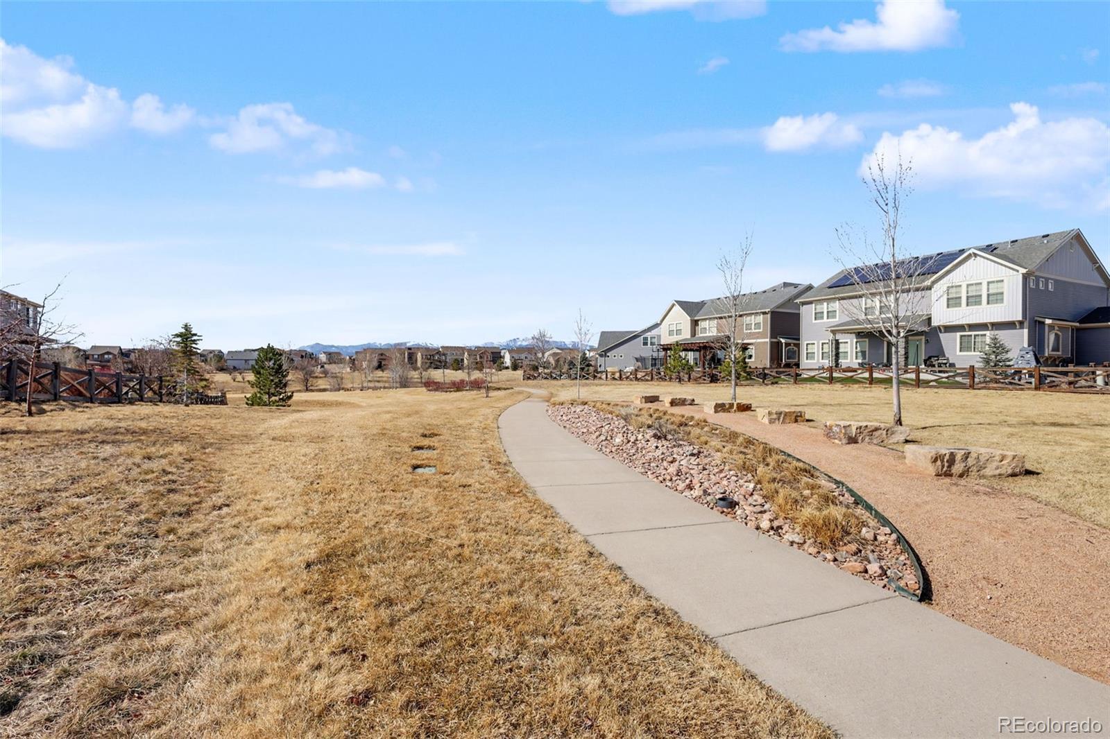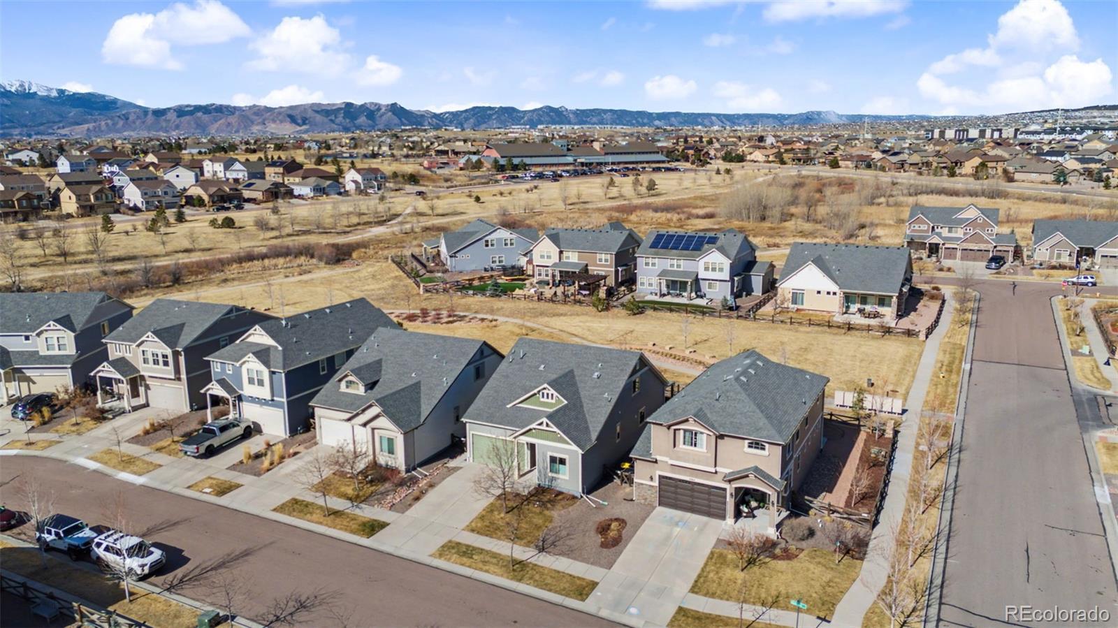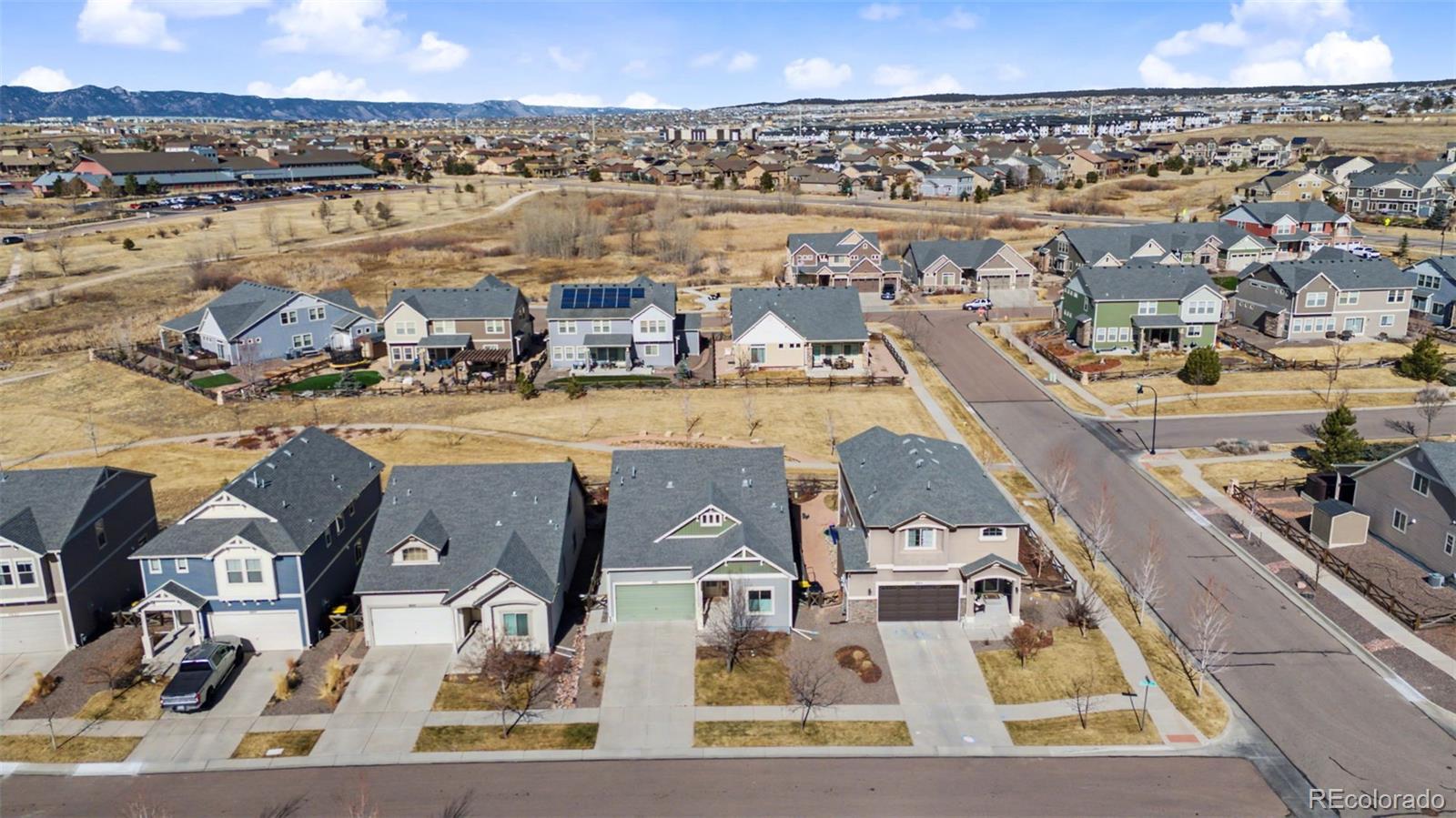 Darling home in the heart of Banning Lewis Ranch offering stunning Pikes Peak views and direct access to the community walking trail. A charming 6x13 covered front porch welcomes you into a bright, open layout featuring 9’ ceilings and beautiful hardwood floors. Just off the entry, a front bedroom with a spacious walk-in closet sits adjacent to a full bath with a deep soaking tub—ideal for guests or a home office. The hardwood floors continue into the expansive kitchen, thoughtfully designed with a large island with bar seating and under-cabinet storage, 3x8 walk-in pantry, JennAir induction range, built-in microwave, newer refrigerator, under-mount composite sink, pull-out drawers, and pendant lighting. The adjoining dining area showcases a tray ceiling and opens via sliding glass doors to a custom 8x30 covered patio—perfect for entertaining or relaxing year-round. Outdoor features shine with composite steps and iron railing, low-maintenance turf, roll-down winter blinds, honeysuckle vines, and a sprinkler-connected birdbath. Enjoy sweeping views of Pikes Peak and the Front Range from your private retreat. Main-level living includes a spacious primary suite with barn-door entry to a beautifully appointed ¾ bath featuring dual sinks, dual medicine cabinets, floor-to-ceiling tiled step-in shower with natural light, private water closet, and a 7x7 walk-in closet. Laundry room with built-in shelving is conveniently located on the main level. Upstairs offers a flexible loft space ideal for a gym, office, or second living area, along with a third bedroom featuring its own full bath and walk-in closet. Additional highlights include generous storage, crawl space access, and a garage faucet for added convenience. Thoughtfully designed, beautifully maintained, and perfectly positioned—this is Colorado living at its best. **MUST SEE PROPERTY!**