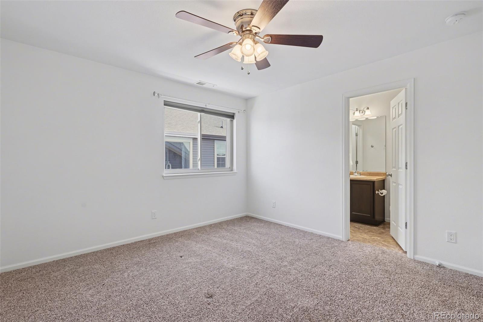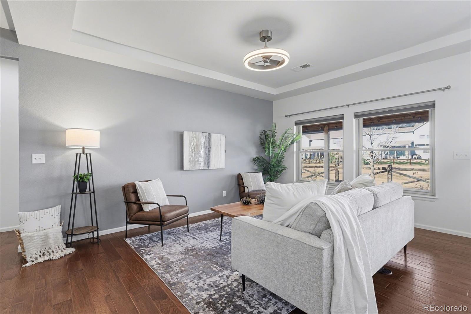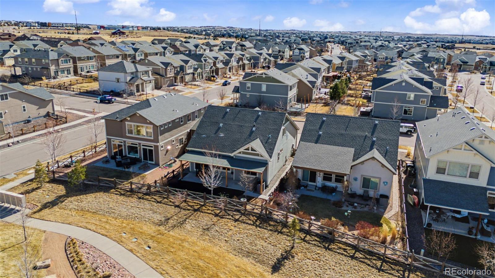 Darling home in the heart of Banning Lewis Ranch offering stunning Pikes Peak views and direct access to the community walking trail. A charming 6x13 covered front porch welcomes you into a bright, open layout featuring 9’ ceilings and beautiful hardwood floors. Just off the entry, a front bedroom with a spacious walk-in closet sits adjacent to a full bath with a deep soaking tub—ideal for guests or a home office. The hardwood floors continue into the expansive kitchen, thoughtfully designed with a large island with bar seating and under-cabinet storage, 3x8 walk-in pantry, JennAir induction range, built-in microwave, newer refrigerator, under-mount composite sink, pull-out drawers, and pendant lighting. The adjoining dining area showcases a tray ceiling and opens via sliding glass doors to a custom 8x30 covered patio—perfect for entertaining or relaxing year-round. Outdoor features shine with composite steps and iron railing, low-maintenance turf, roll-down winter blinds, honeysuckle vines, and a sprinkler-connected birdbath. Enjoy sweeping views of Pikes Peak and the Front Range from your private retreat. Main-level living includes a spacious primary suite with barn-door entry to a beautifully appointed ¾ bath featuring dual sinks, dual medicine cabinets, floor-to-ceiling tiled step-in shower with natural light, private water closet, and a 7x7 walk-in closet. Laundry room with built-in shelving is conveniently located on the main level. Upstairs offers a flexible loft space ideal for a gym, office, or second living area, along with a third bedroom featuring its own full bath and walk-in closet. Additional highlights include generous storage, crawl space access, and a garage faucet for added convenience. Thoughtfully designed, beautifully maintained, and perfectly positioned—this is Colorado living at its best. **MUST SEE PROPERTY!**