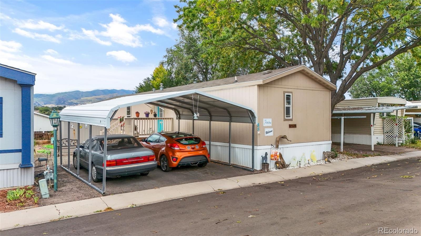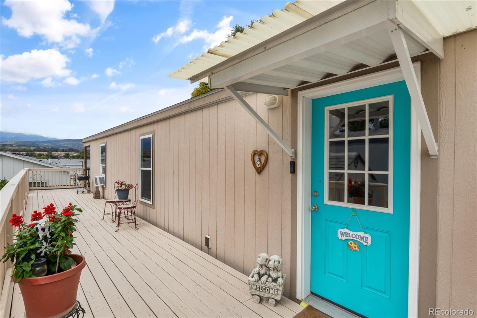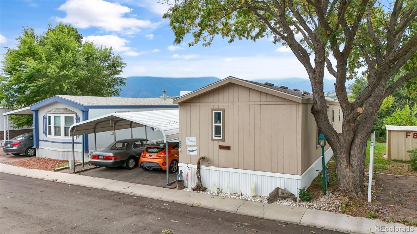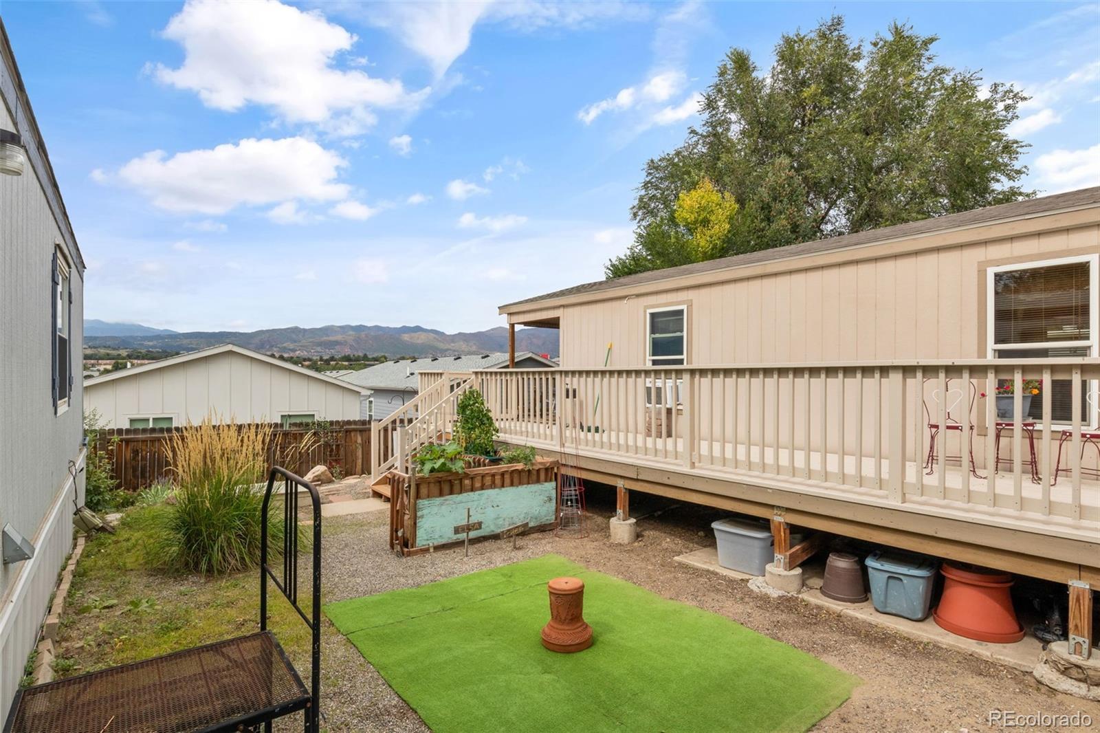 Massive unobstructed Pikes Peak views from this amazing home. Sit outside on your covered wrap-around deck and experience abundant wild life. Enjoy this 55+ community that offers easy access to shopping and entertainment. The floor plan is inviting and open. The entire home is very well maintained with beautiful flooring. The kitchen and living areas are open, great for entertaining, and lead to the back deck via sliding glass door. Quality roller shades included for added privacy and relaxation. Plenty of room to garden with two raised beds. One of the bedrooms is spacious and next to a full bath. The primary bedroom features, double closets and a 5pc adjoining master bath complete with a large tub, 2.5 x 4.0 ft by 24" deep, tiled shower and double vanity. The 6.5' x 7' lifetime molded storage shed on a concrete slab and 2 car covered carport are INCLUDED. Energy efficient 2x6 exterior walls. Insulation: R30 ceiling, R19 walls, R22 floor. Wall mount bracket for up to 55" TV included. Call today for your private showing!