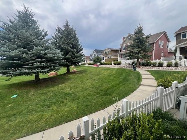 From the moment you enter this property you will feel right at home. To the left is a home office (that could easily be a third bedroom)with amazing mountain views. To the right is a spacious living room with a gas fireplace. Just above the fireplace is a built in area for the TV / Entertainment center. Adjacent to the living room is a formal dining area with a built in credenza that has added counter space and lost of extra cabinet space above and below. Next to the dining room is a galley kitchen with a center island. The kitchen includes a refrigerator, a built in microwave, a flat top stove with a self cleaning oven and a dishwasher. The primary bedroom is situated at the back of the home and has a full bath with a dual vanity. A second bedroom is also included with a full hall bath close by. The home also has a laundry room with washer and dryer hookups. The two car garage has an automatic door opener making it easy to get in and out on rainy or snowy days. The home fully fenced and the front, sides, and back yard are very low maintenance. No mowing required here. In front of the home is a beautiful park with incredible views of Pikes Peak and the front range.