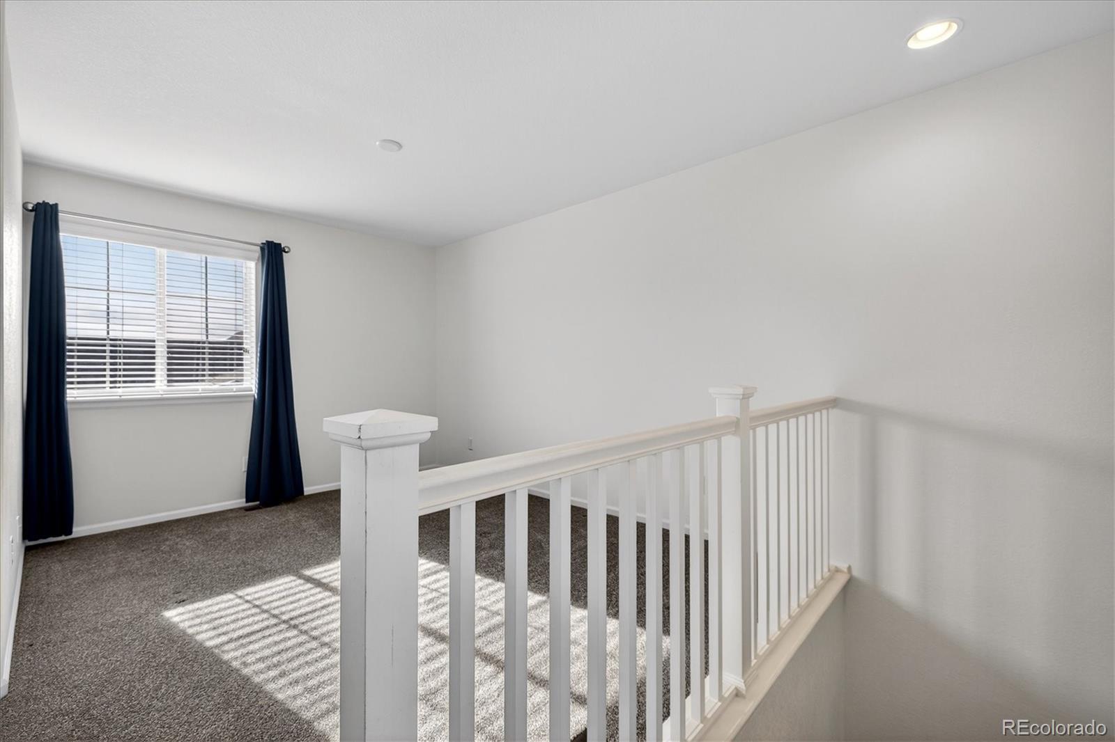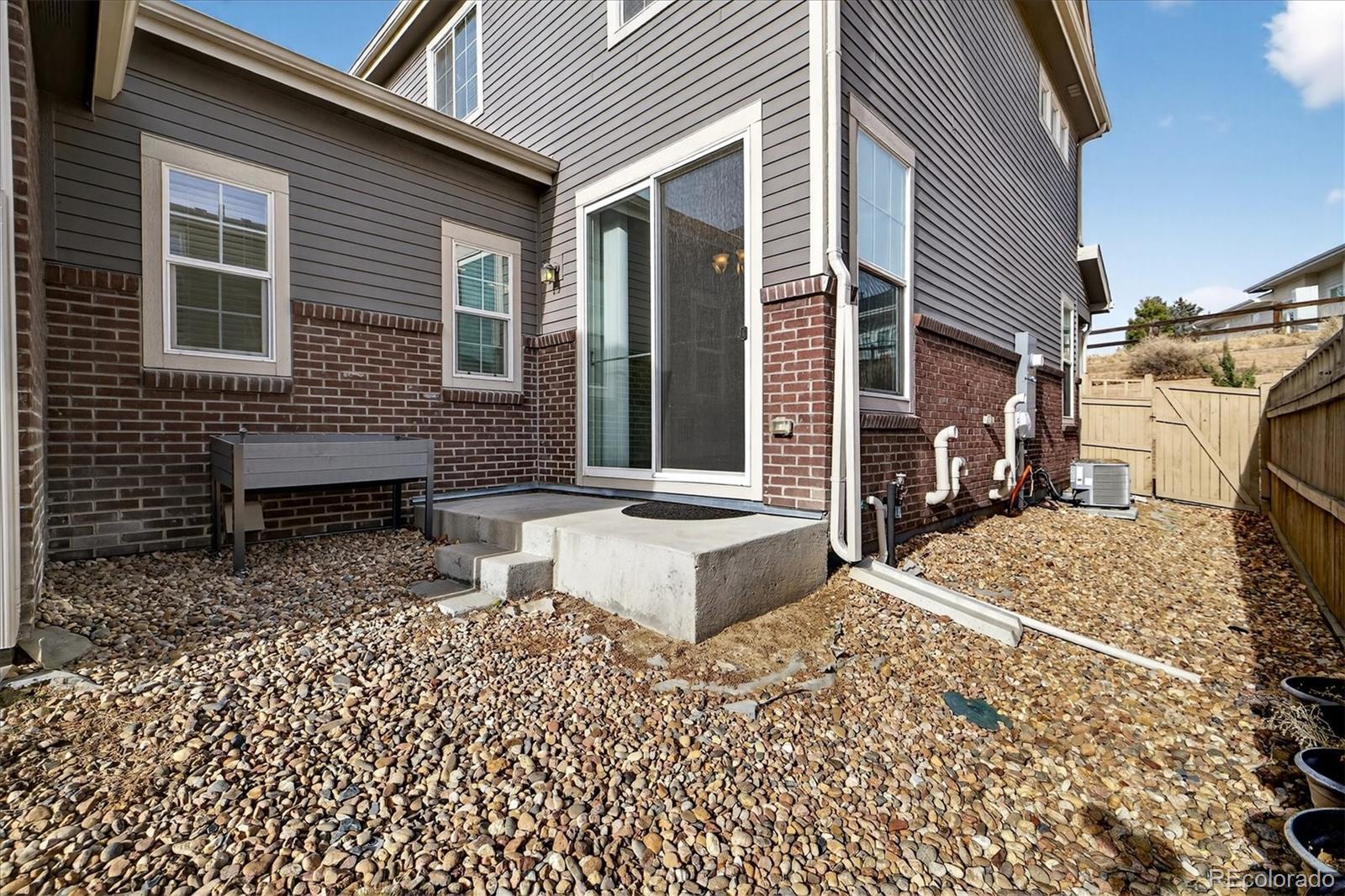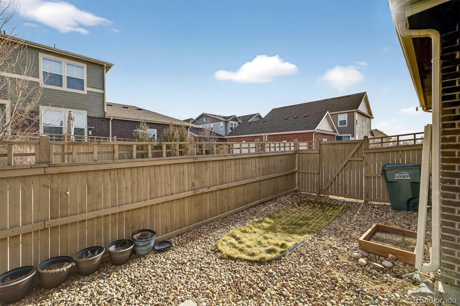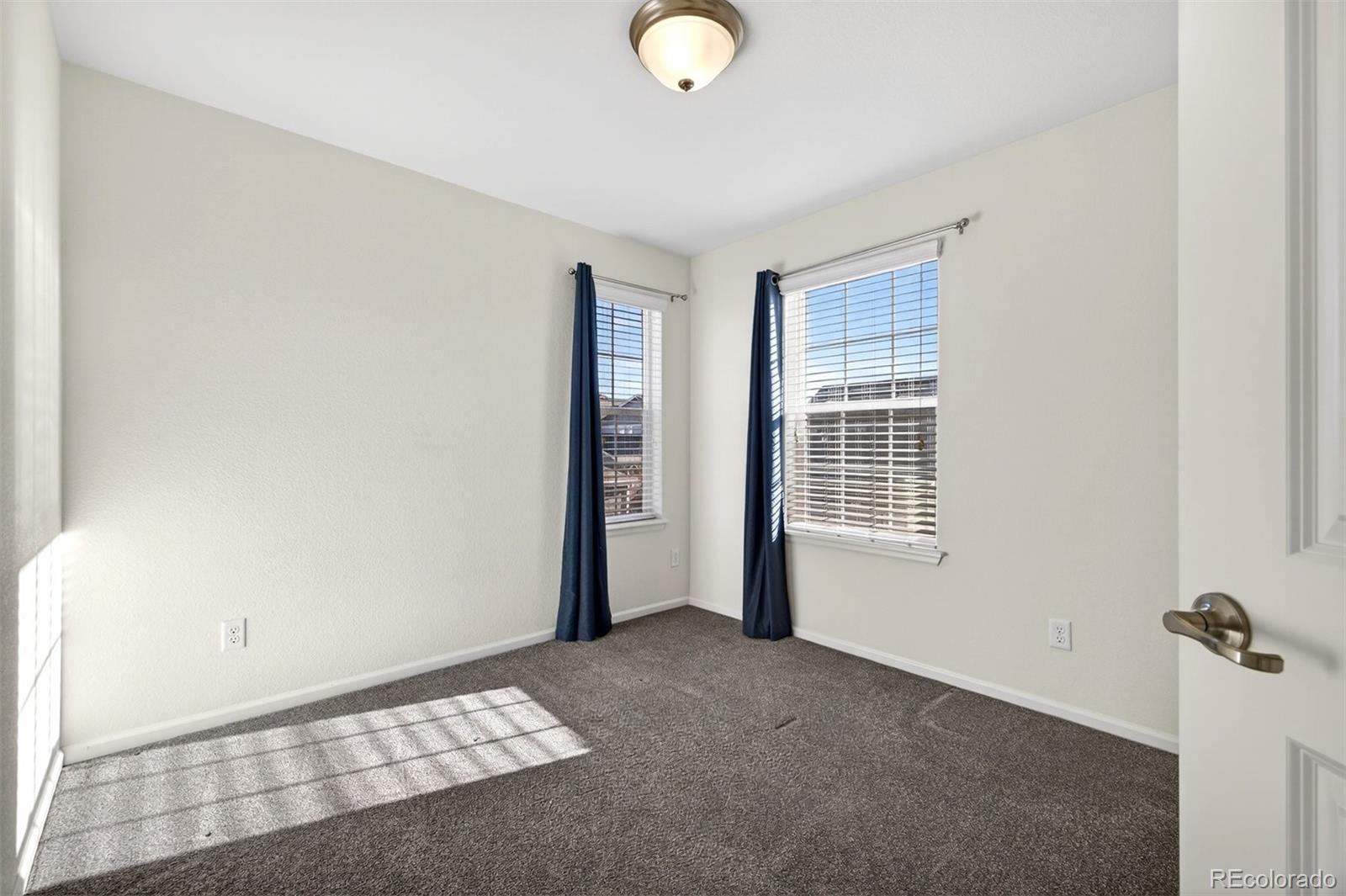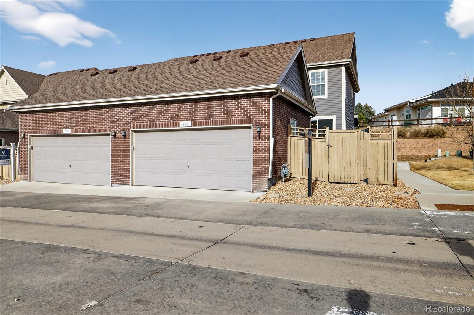 Welcome home to 14801 E Poundstone Dr, a beautifully maintained corner-unit paired home in the desirable Pioneer Hills community of Aurora. Surrounded by open green space on three sides, this home offers a rare sense of privacy and calm. The covered front porch faces a landscaped green area and private walkway, accented by a decorative retaining wall that adds charm and separation from neighboring communities. Inside, the open layout features 2 bedrooms, 3 bathrooms, and 1,500 finished square feet, plus an unfinished basement with storage, crawlspace access, and future expansion potential. Built by Lennar/CalAtlantic, this is the popular Sparkle model, known for its efficient design and open-concept living. The main level features 9-foot ceilings, wood flooring, and abundant natural light from south- and southeast-facing windows. The living room includes in-ceiling surround sound, enhancing everyday living and entertaining. The kitchen offers granite countertops, a subway tile backsplash, stainless steel appliances (all included), and a convenient office or computer nook. A main-floor laundry room and mud area provide added functionality and connect directly to the private two-car attached garage. Upstairs, a bright loft offers flexible living space. The vaulted primary bedroom features in-ceiling surround sound and a private bathroom with marble tile flooring and a decorative tiled shower. A second bedroom and an additional full bathroom complete the upper level. The fenced backyard includes grass and a garden area for outdoor enjoyment. A southwest-facing driveway benefits from sun exposure that helps with snow and ice melt. The HOA maintains landscaping and exterior elements and includes access to a community pool, playground, and green spaces. Meticulously maintained, professionally cleaned, and move-in ready.