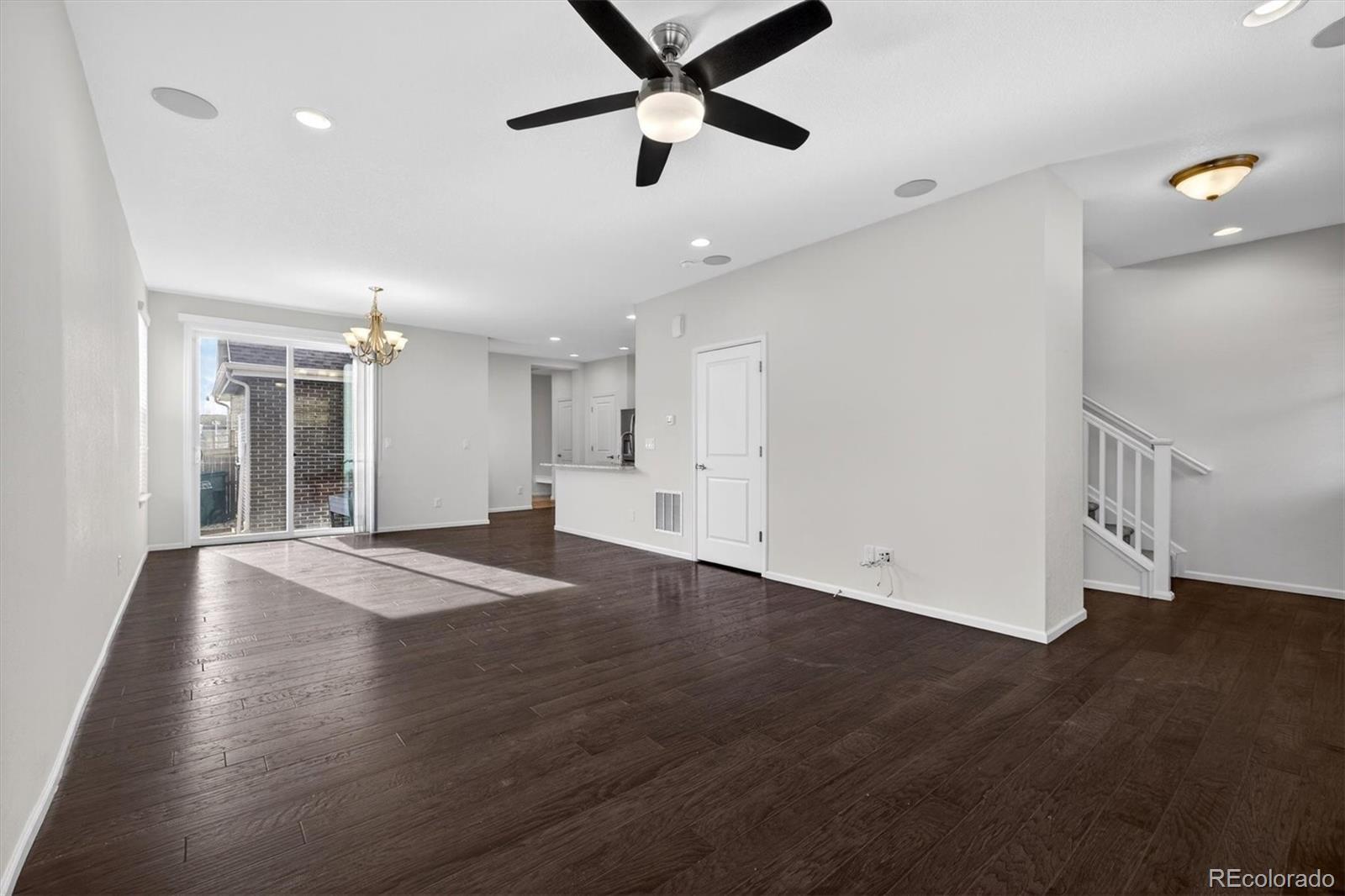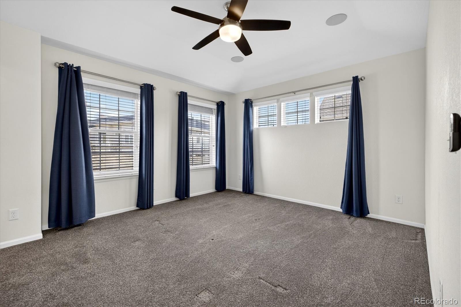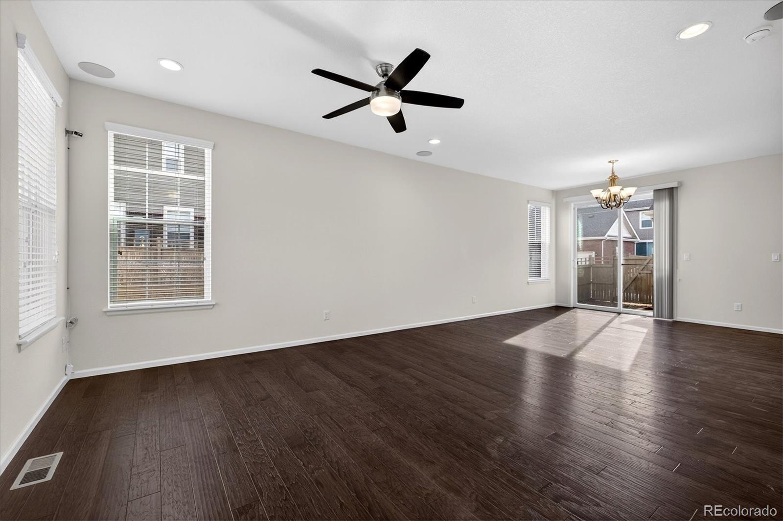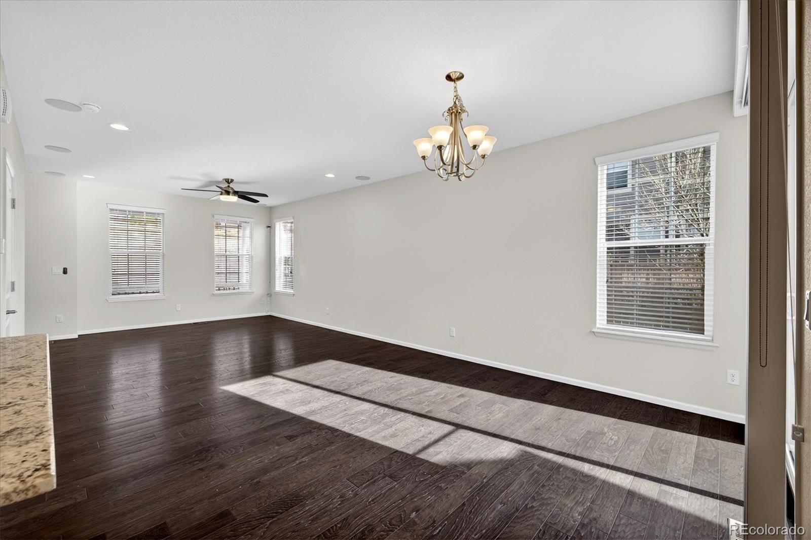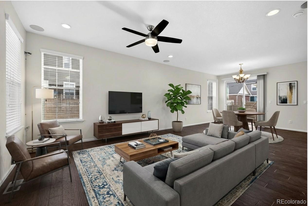 Welcome home to 14801 E Poundstone Dr, a beautifully maintained corner-unit paired home in the desirable Pioneer Hills community of Aurora. Surrounded by open green space on three sides, this home offers a rare sense of privacy and calm. The covered front porch faces a landscaped green area and private walkway, accented by a decorative retaining wall that adds charm and separation from neighboring communities. Inside, the open layout features 2 bedrooms, 3 bathrooms, and 1,500 finished square feet, plus an unfinished basement with storage, crawlspace access, and future expansion potential. Built by Lennar/CalAtlantic, this is the popular Sparkle model, known for its efficient design and open-concept living. The main level features 9-foot ceilings, wood flooring, and abundant natural light from south- and southeast-facing windows. The living room includes in-ceiling surround sound, enhancing everyday living and entertaining. The kitchen offers granite countertops, a subway tile backsplash, stainless steel appliances (all included), and a convenient office or computer nook. A main-floor laundry room and mud area provide added functionality and connect directly to the private two-car attached garage. Upstairs, a bright loft offers flexible living space. The vaulted primary bedroom features in-ceiling surround sound and a private bathroom with marble tile flooring and a decorative tiled shower. A second bedroom and an additional full bathroom complete the upper level. The fenced backyard includes grass and a garden area for outdoor enjoyment. A southwest-facing driveway benefits from sun exposure that helps with snow and ice melt. The HOA maintains landscaping and exterior elements and includes access to a community pool, playground, and green spaces. Meticulously maintained, professionally cleaned, and move-in ready.