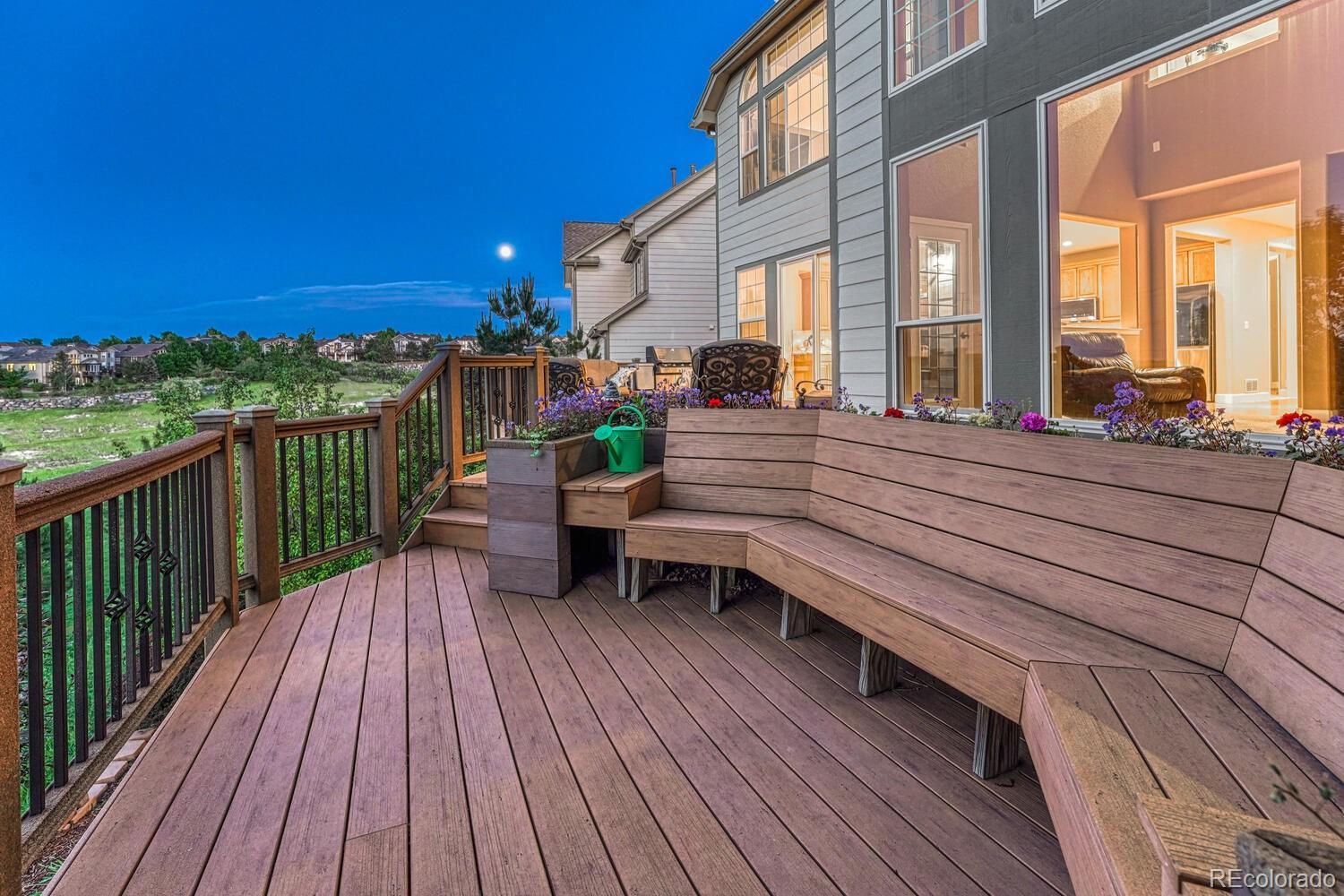 Welcome to this stunning home in Castle Pines, offering incredible mountain & city views!. 1 Year Home warranty included ! South-facing lot that backs to open space and a park, this property is a haven for wildlife viewing and peaceful outdoor living. With over 4,200 finished sq ft, this 5-bed, 5-bath home (plus a main floor office that can serve as a 6th bed) blends modern updates with functional design, ideal for both everyday living and entertaining. The main floor features a beautifully updated kit w brand-new granite countertops, new stainless steel appliances, fresh paint, an eat-in area and breakfast bar. The formal dining room offers plenty of space for meals and gatherings, while the spacious great room with a gas log fireplace creates a warm and welcoming atmosphere. A private office and a full 3/4 bath round out the main level. Step outside onto the custom, oversized deck with built-in planters—a perfect spot to entertain or relax. Upstairs, you’ll find four generously sized bedrooms and three full baths, including a convenient Jack-and-Jill setup. A small loft area provides the perfect nook for a homework station or home office. The laundry room is thoughtfully located on this level for added convenience. The primary suite showcases great views, dual closets, and a spacious 5 pc bath. A private guest suite with its own bathroom and walk-in closet offers excellent privacy for visitors . The fin walkout basement includes a large media or rec room, a home gym area, an additional bedroom and 3/4 bath, plus a large storage room. New Class 4 Impact resistant roof!This home is just minutes from Daniel’s Park, scenic trails, the community pool, schools, and The Ridge at Castle Pines Golf Course—one of the area's finest. Easy access to I-25, you’re only 20 minutes from the Denver Tech Center and just a short drive to Castle Rock’s vibrant shops and restaurants.This home offers the perfect combination of luxury, comfort, and Colorado beauty.