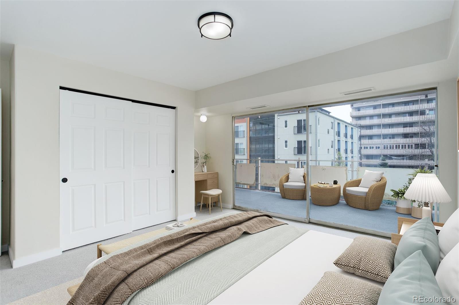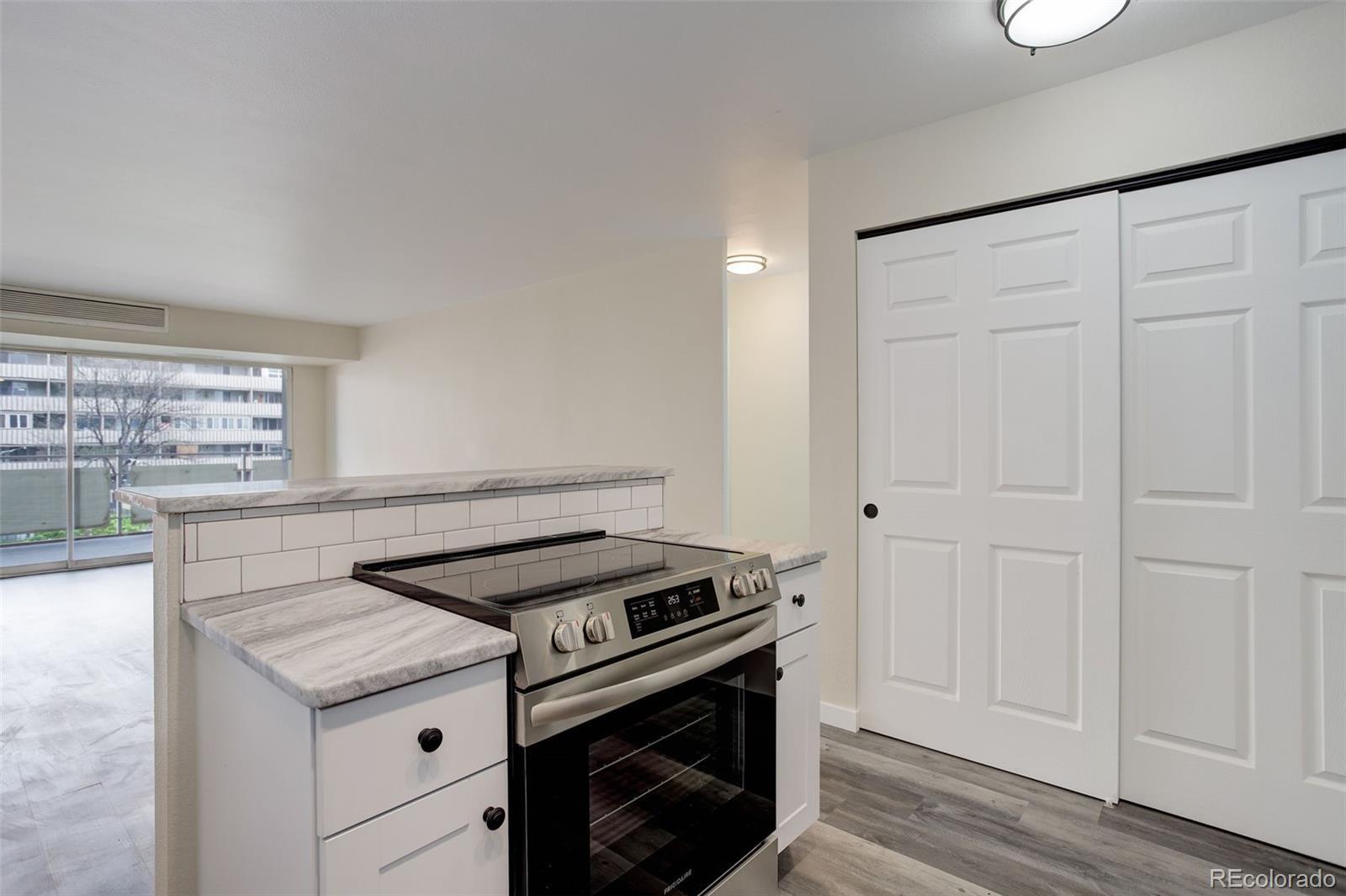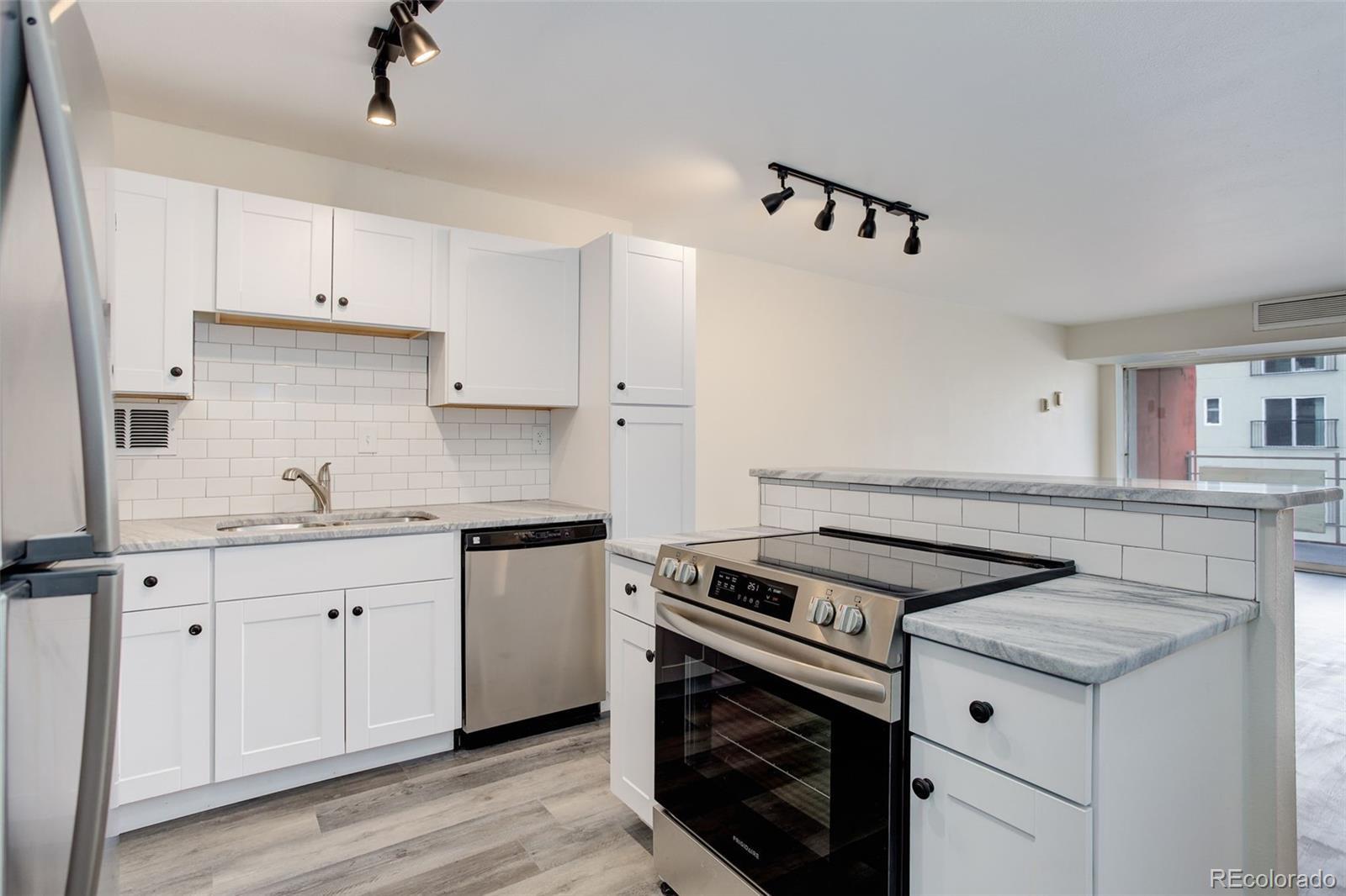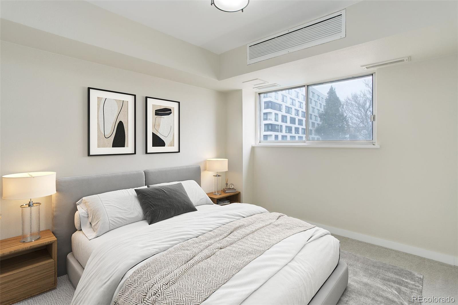 This spectacular corner two-bedroom unit is in an unbeatable location close to restaurants, shopping, and all that Denver has to offer. This recently remodeled sunny unit features an open floor plan with a gourmet kitchen outfitted with new appliances and granite countertops. You will love the eat-in breakfast bar and eye-catching backsplash. New luxury vinyl flooring extends throughout the main living area. A wall of glass provides an abundance of natural light and leads to a tremendous covered deck. It is the perfect spot to spend quiet afternoons and offers plenty of room for indoor/outdoor living. The primary suite is highlighted by new carpet, a luxurious ensuite bath, and access to the deck. The secondary bedroom is spacious and bright. The building is secure and offers a sparkling pool, underground parking, extra storage, and a laundry room. Check out the newly renovated 10th floor community room with home working hub! With its convenient location and designer remodel, this property is prime for the discerning investor or home buyer.