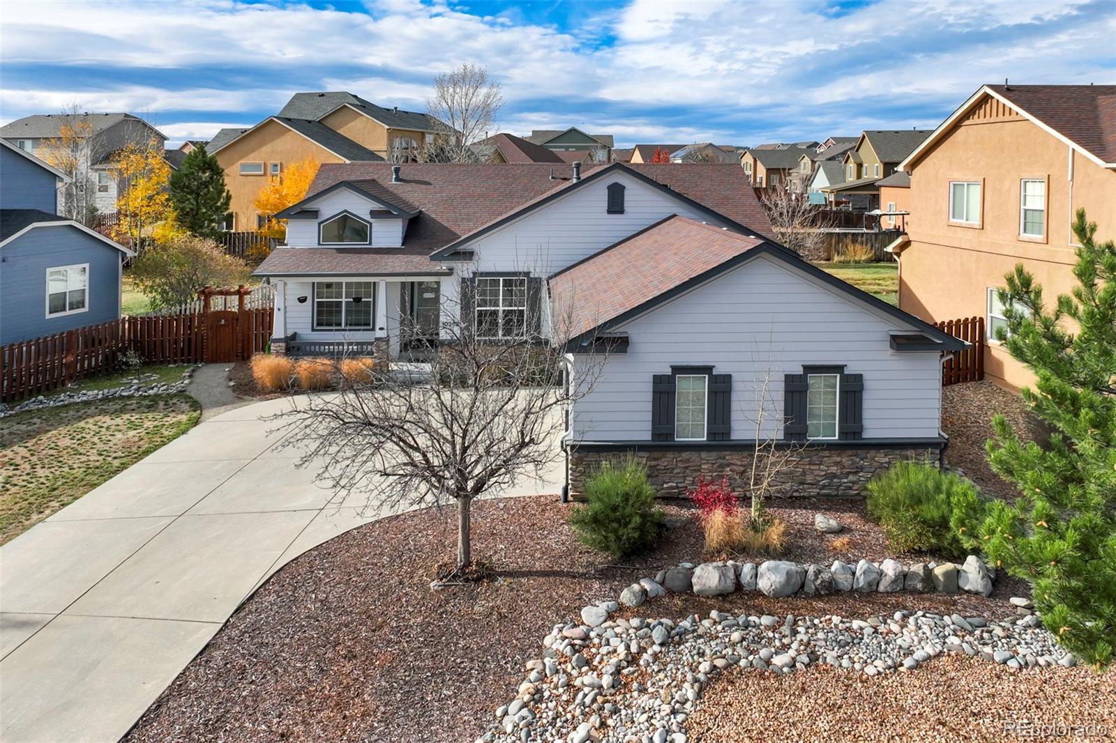 Stunning 5 bed, 4 bath ranch home in the prestigious Flying Horse community- offering breathtaking views of Pikes Peak & the Front Range, the essence of a ‘million dollar view’! Situated in a quiet cul-de-sac, this home expertly blends function, style & comfort. The main level is light-filled, features an open concept with hardwood floors, gorgeous gas fireplace & clean lines that showcase the mesmerizing views. An airy kitchen with a bonus hall for hosting, island with bar seating & an inviting dining space are ideal for gathering. The primary suite features a 5-piece bath, walk-in closet & access to the spacious covered deck. A guest room, full bathroom, office/flex space, laundry room and added storage complete the main level, offering the ease and comfort of true main level living. A spacious lower level boasts 10 ft ceilings, a generous recreation room wired for surround sound & pre-plumbed for a wet bar. Two additional bedrooms, a full bathroom, & a guest suite featuring a private bath & walk-in closet, complete the lower level- providing an abundance of space for entertaining family, guests, and more! Outside, enjoy the professionally landscaped yard & covered deck, expertly designed for taking in serene nights, sunshine, and endless mountain views. A hot tub is nestled to the side of the covered porch. Thoughtful landscaping, paired with this impressive lot, provides privacy while highlighting the views & beauty of this location. A 3 car garage includes a 220V outlet for electric vehicle charging and additional storage. Residents of the community can elect to enjoy membership with Flying Horse Resort & Club, with access to championship golf courses, athletic club, and more. The Flying Horse Steakhouse & luxury lodging located in the community (just minutes away from this property!) are open to the public, adding convenience for residents & guests alike. This home is a must-see with functional design, renowned community location, and unmatched scenery!