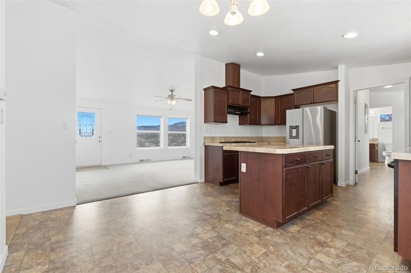 Ceiling Fan(s), Eat-in Kitchen, Kitchen Island, No Stairs, Primary Suite, Smoke Free, Tile Counters, Vaulted Ceiling(s), Walk-In Closet(s)