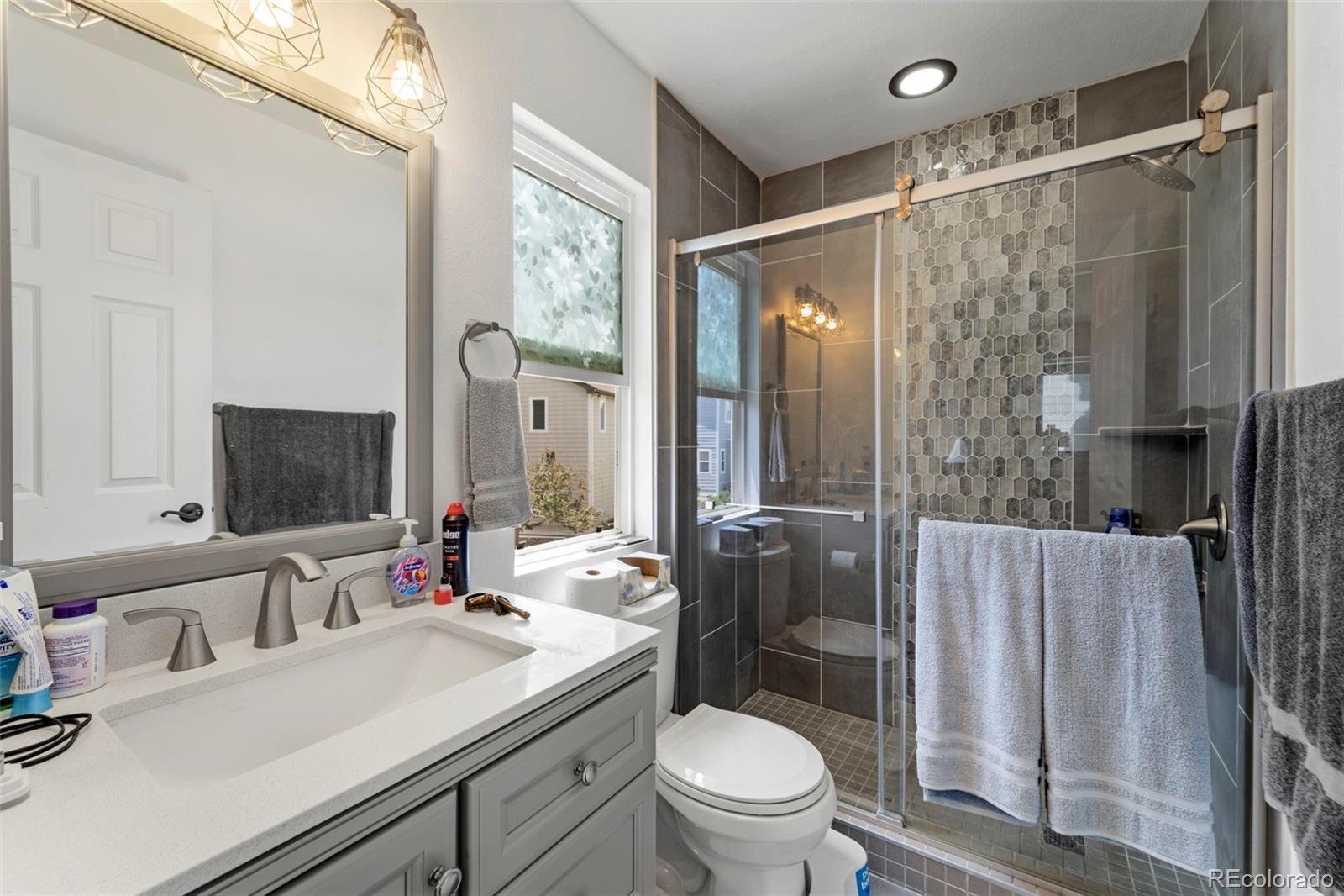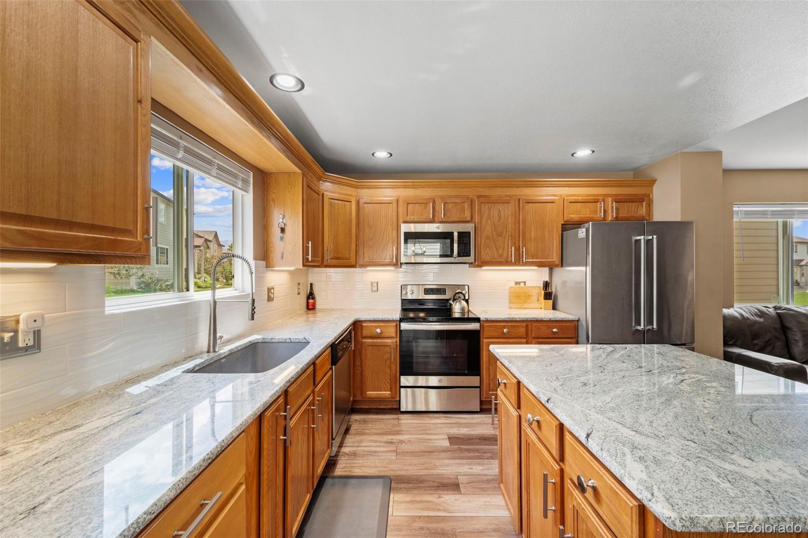 Stylish, Renovated & Move-In Ready! This beautifully kept 4-bedroom home offers a rare opportunity in a prime location— just a short walk to Interquest’s shopping, dining, and entertainment, with easy access to I-25 and located in highly desired School District 20. Step inside to a bright, open floor plan and a fully updated kitchen featuring granite countertops, bar seating, a Blanco sink with chef’s faucet and disposal, under-cabinet lighting, new electric range, microwave, dishwasher, and more! The spacious primary suite includes a large walk-in closet and a custom luxury bathroom. Upstairs, you’ll find 4 bedrooms, 2 baths, and a convenient laundry area. The private, zero-maintenance yard is perfect for relaxing or entertaining on the large covered patio—ideal for alfresco dining. The community offers extensive walking paths and HOA-covered yard maintenance (mowing, trimming, irrigation, and plantings) plus trash service—giving you low-maintenance living in a prime spot. Quick closing available—this one won't last!