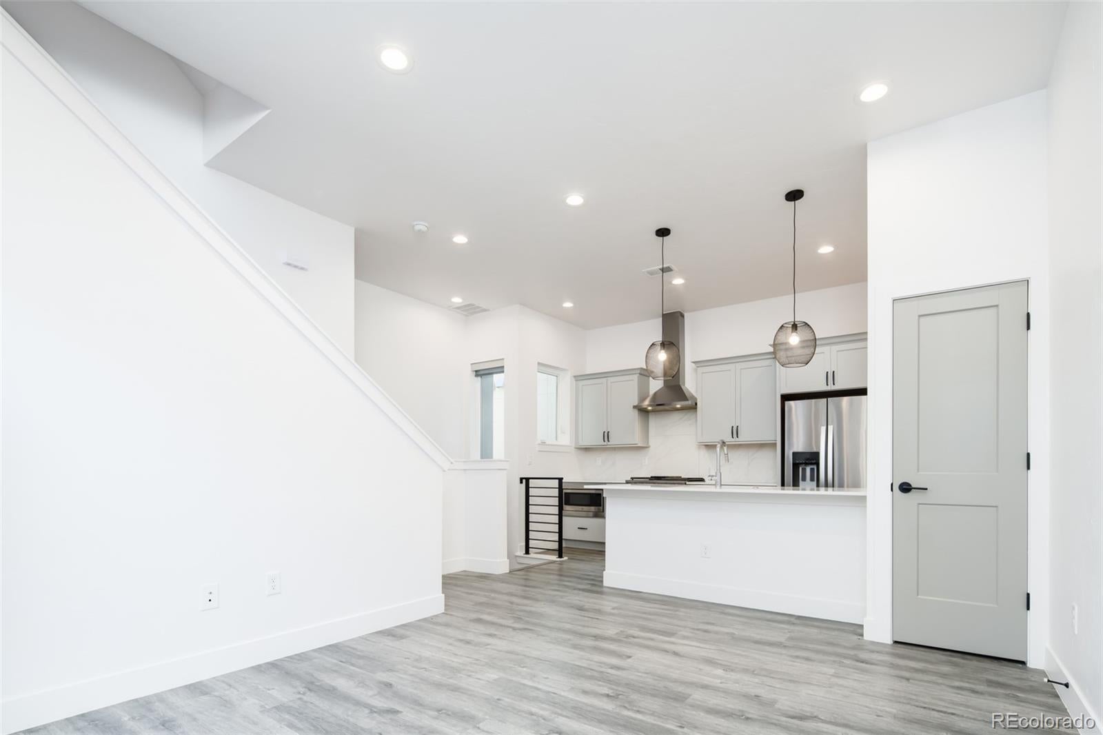Centrally located in Englewood’s Health and Wellness District, this quiet townhome features a fabulous private roof deck! Residence D is a two-bedroom, one and one-half bathroom townhome. The entry level features a one-car garage, entry foyer, and half-bath powder room. Upstairs the open kitchen and living area makes for seamless entertaining. The kitchen is outfitted with stainless steel appliances and features a five-burner gas range. Under the staircase you will find additional storage space. Upstairs are two equally sized bedrooms, separated by a full bathroom and a laundry closet with a stacked washer and dryer. The roof deck offers additional entertaining space with a great view of the mountains.