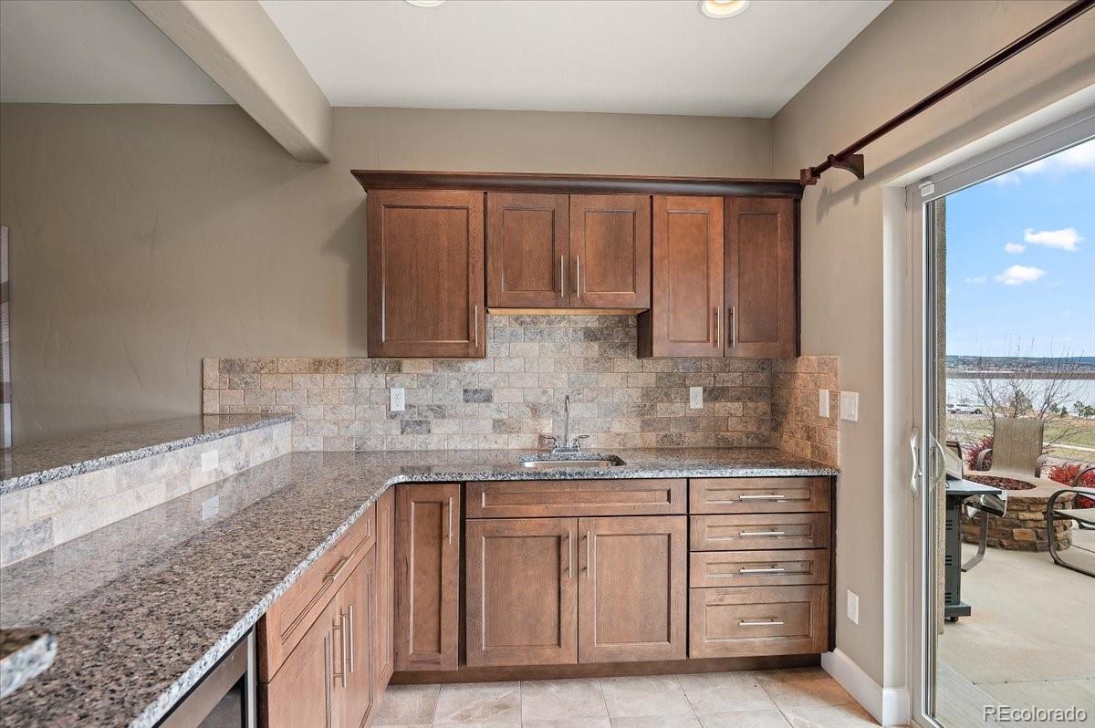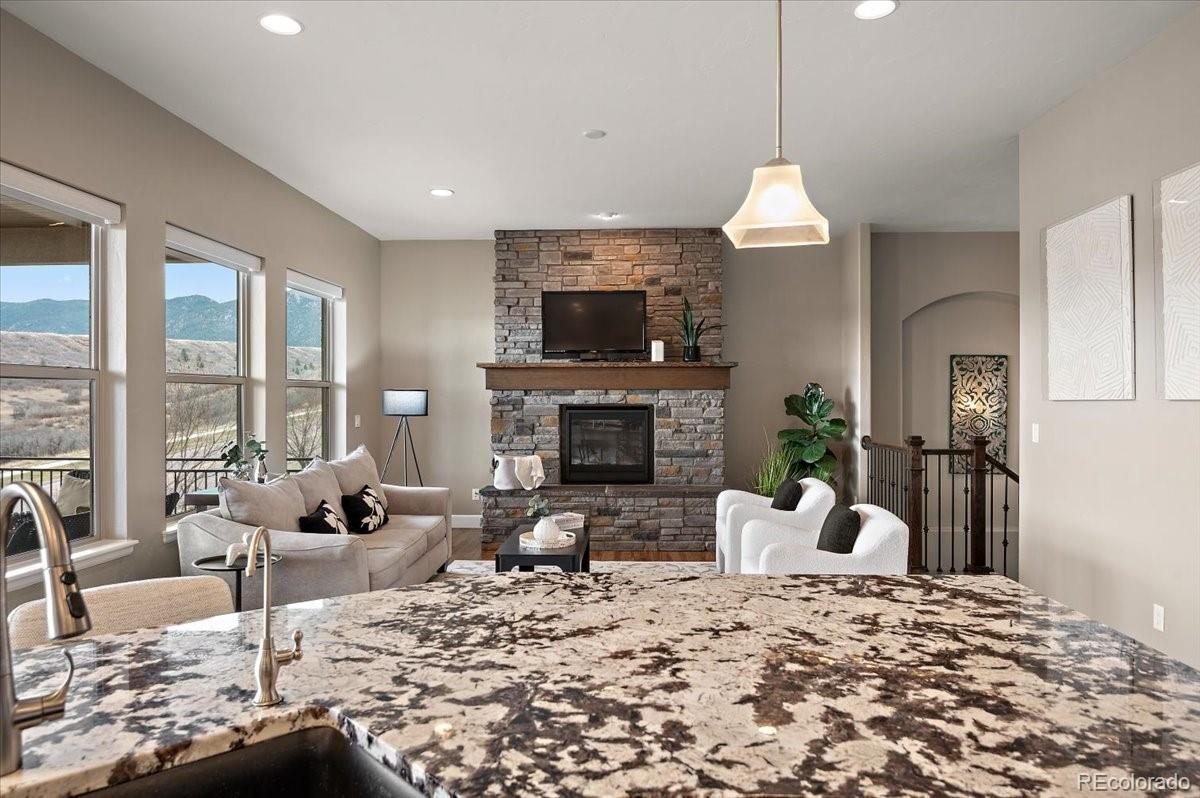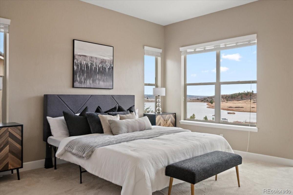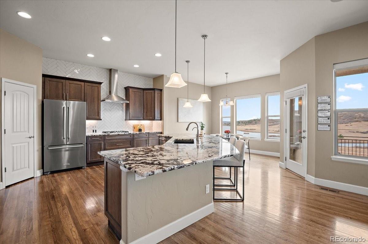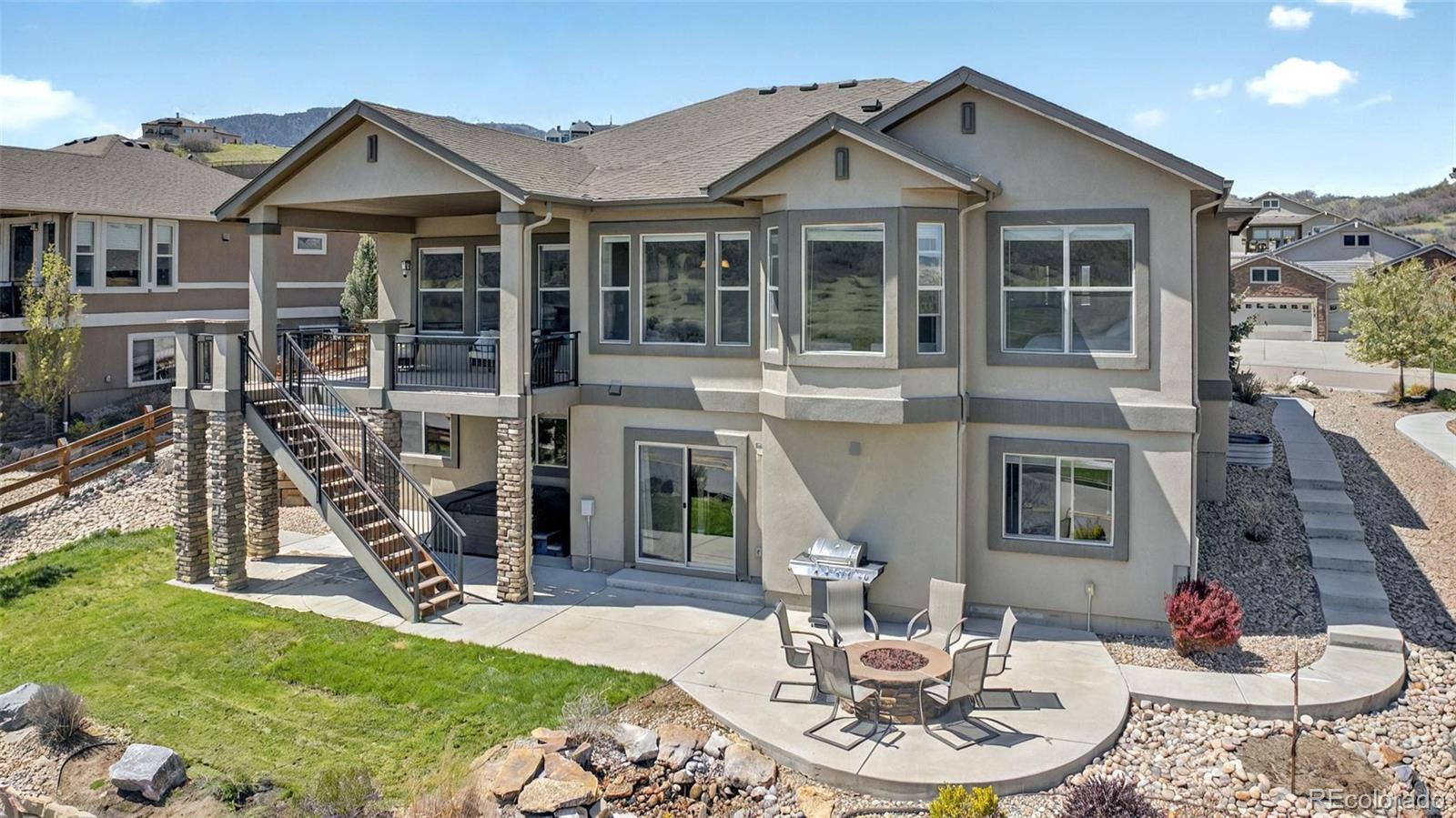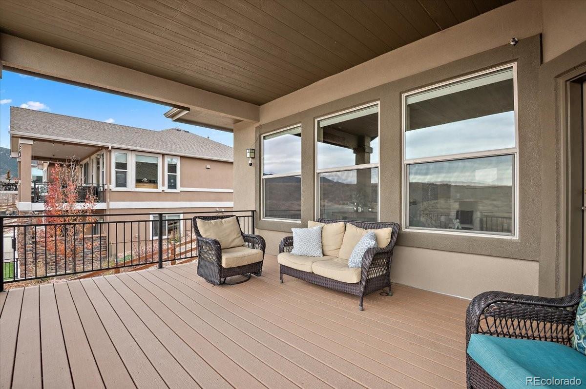 This Stratford walkout rancher is perfectly situated on a premium lot that backs to a serene lake and open space in one of the most coveted neighborhoods in all of Monument. From top to bottom, no detail was overlooked in the thoughtful design and high-end upgrade selections throughout from instant hot water to a reverse osmosis water system. A covered front porch and a formal entry opens into a beautifully designed formal dining room with custom arches, leading seamlessly into the expansive great room and gourmet kitchen. The great room concept is both open and inviting, featuring millrun hickory floors, a dramatic stacked stone fireplace, and a wall of windows with motorized bluetooth blinds that frame unmatched lake and mountain views, allowing natural light to pour in. The chef’s kitchen is a showstopper, complete with a massive solid granite slab island, premium appliances, a bright breakfast nook, and direct access to the covered custom deck—perfect for enjoying the panoramic scenery. The main level offers a spacious secondary bedroom and a luxurious master suite with stunning views and a spa-like 5-piece bath. Entering from the oversized garage, you'll find a convenient mudroom/laundry room outfitted with matching cabinetry and a functional folding area. A custom extra-wide stairwell with wrought iron balusters and hardwood railing leads you to the fully finished walkout lower level, where a large rec/media room awaits, complete with a wet bar featuring granite counters, tumbled marble backsplash, and a built-in wine fridge. From here, step outside to a massive 49' x 19' patio with a beautiful water feature, fire pit, outside gas stout, hot tub, and breathtaking views, making this level ideal for entertaining and wired for surround sound inside and out (over $75k in outside landscaping). The garage is oversized with a 4 ft extension and a backyard access door. This home is a rare gem and an extraordinary find—and truly feels practically brand new.
