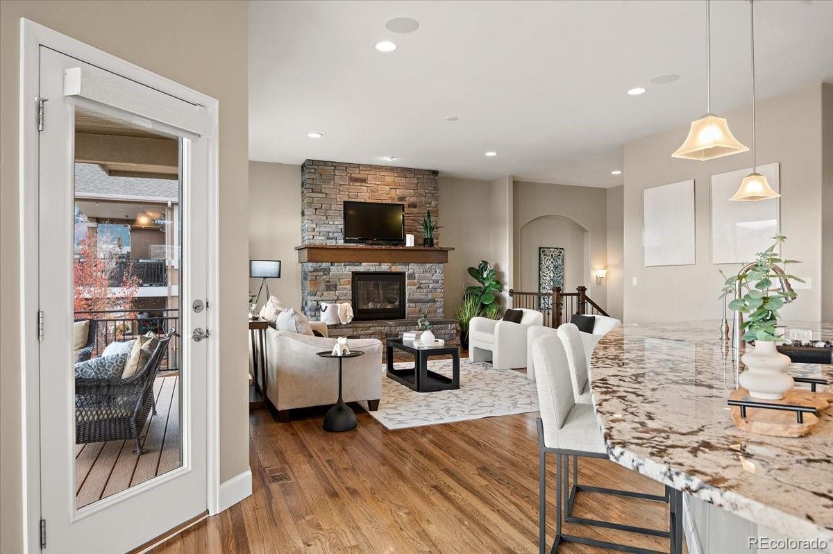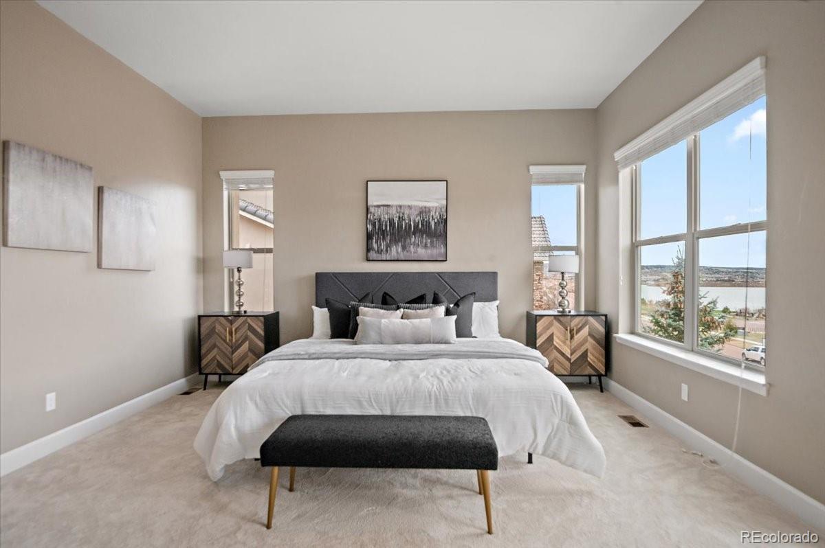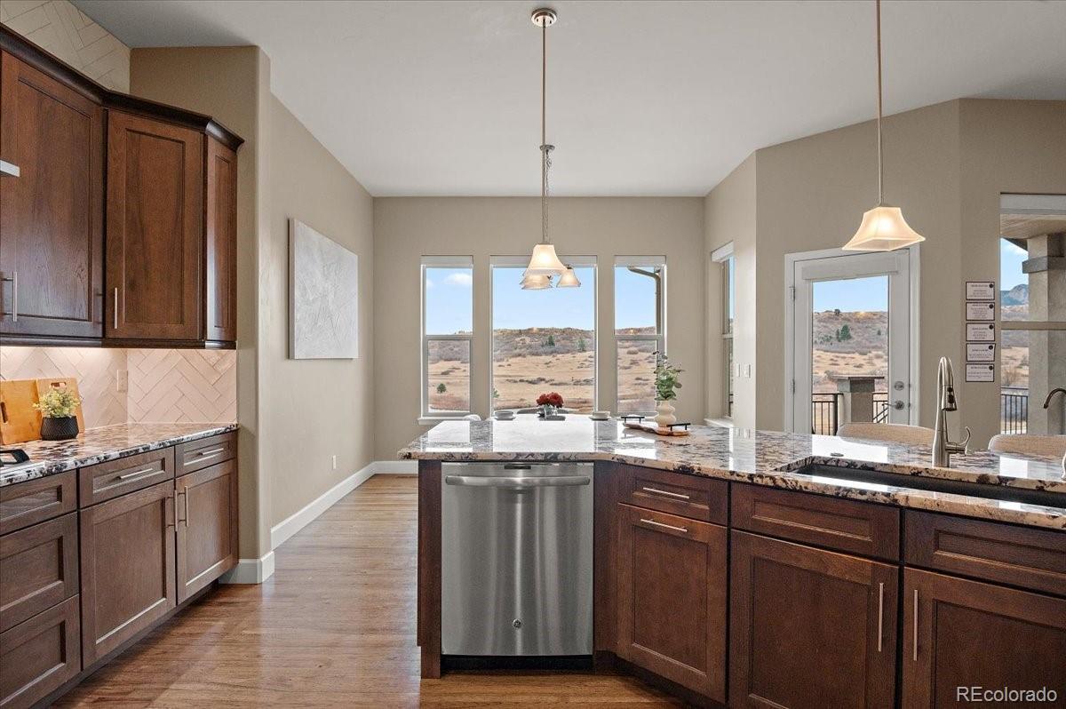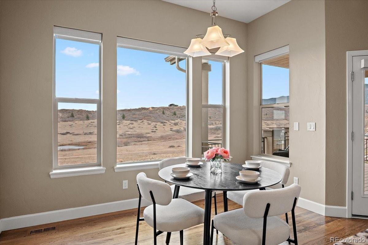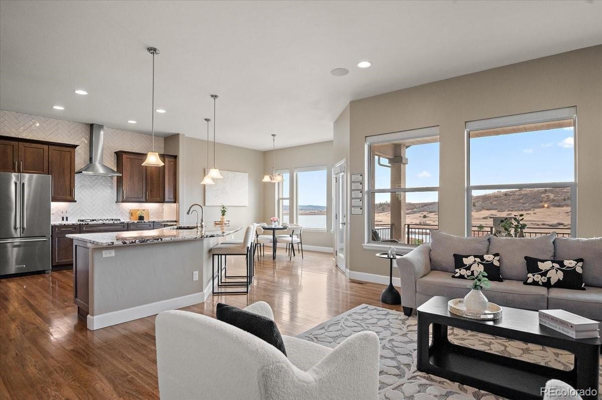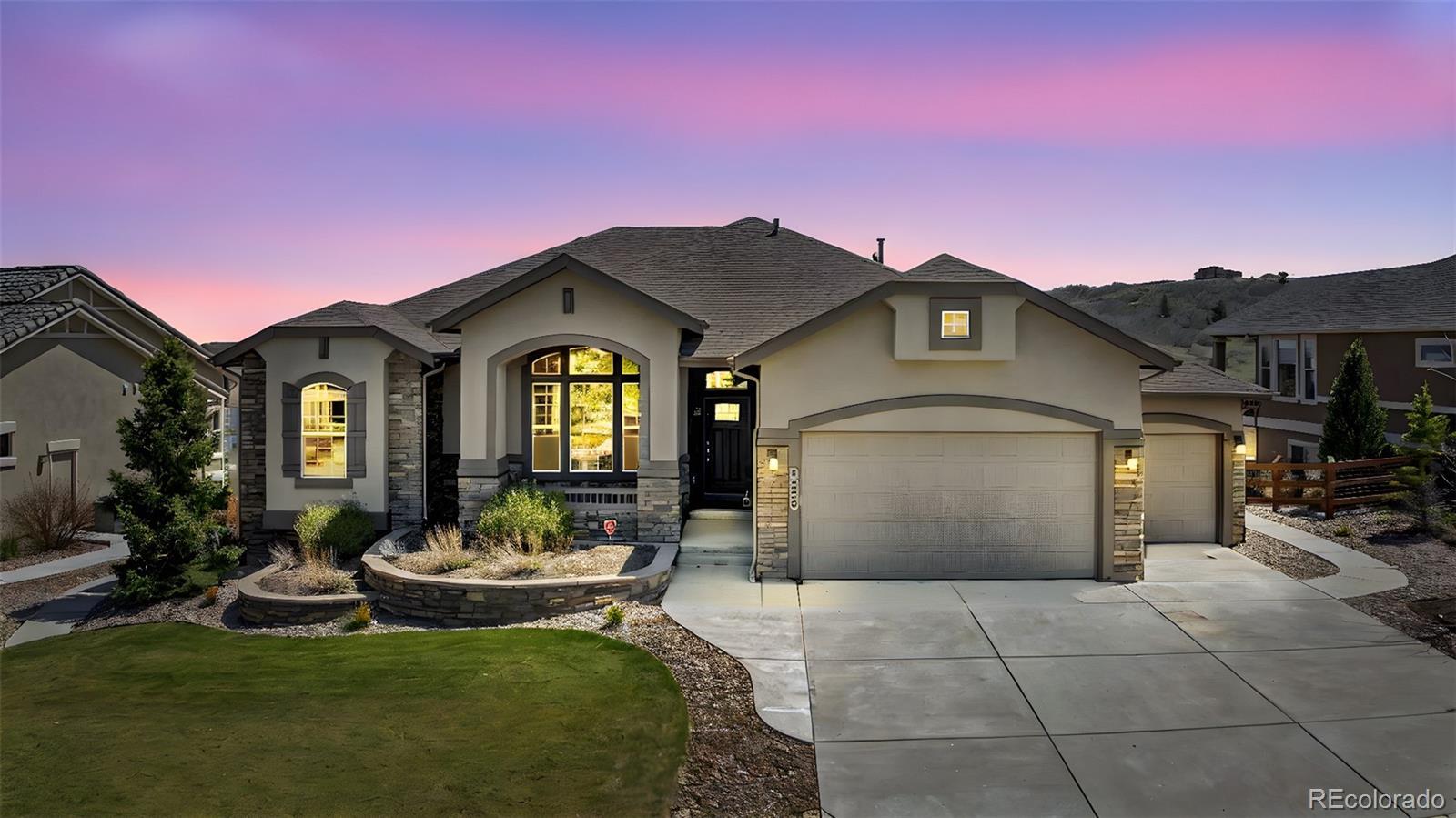 This Stratford walkout rancher is perfectly situated on a premium lot that backs to a serene lake and open space in one of the most coveted neighborhoods in all of Monument. From top to bottom, no detail was overlooked in the thoughtful design and high-end upgrade selections throughout from instant hot water to a reverse osmosis water system. A covered front porch and a formal entry opens into a beautifully designed formal dining room with custom arches, leading seamlessly into the expansive great room and gourmet kitchen. The great room concept is both open and inviting, featuring millrun hickory floors, a dramatic stacked stone fireplace, and a wall of windows with motorized bluetooth blinds that frame unmatched lake and mountain views, allowing natural light to pour in. The chef’s kitchen is a showstopper, complete with a massive solid granite slab island, premium appliances, a bright breakfast nook, and direct access to the covered custom deck—perfect for enjoying the panoramic scenery. The main level offers a spacious secondary bedroom and a luxurious master suite with stunning views and a spa-like 5-piece bath. Entering from the oversized garage, you'll find a convenient mudroom/laundry room outfitted with matching cabinetry and a functional folding area. A custom extra-wide stairwell with wrought iron balusters and hardwood railing leads you to the fully finished walkout lower level, where a large rec/media room awaits, complete with a wet bar featuring granite counters, tumbled marble backsplash, and a built-in wine fridge. From here, step outside to a massive 49' x 19' patio with a beautiful water feature, fire pit, outside gas stout, hot tub, and breathtaking views, making this level ideal for entertaining and wired for surround sound inside and out (over $75k in outside landscaping). The garage is oversized with a 4 ft extension and a backyard access door. This home is a rare gem and an extraordinary find—and truly feels practically brand new.