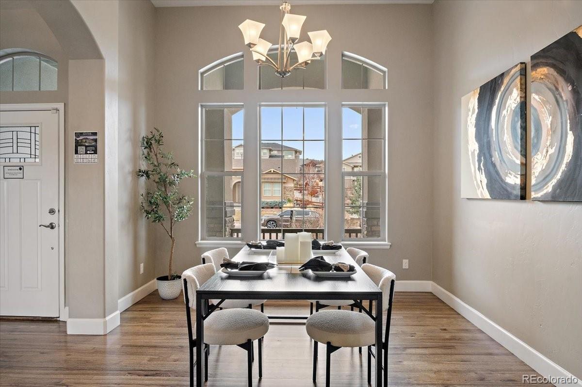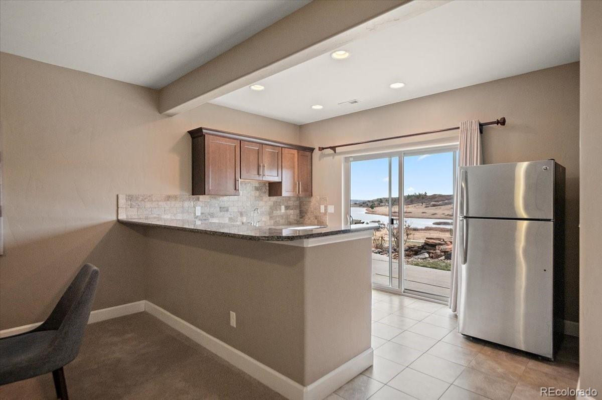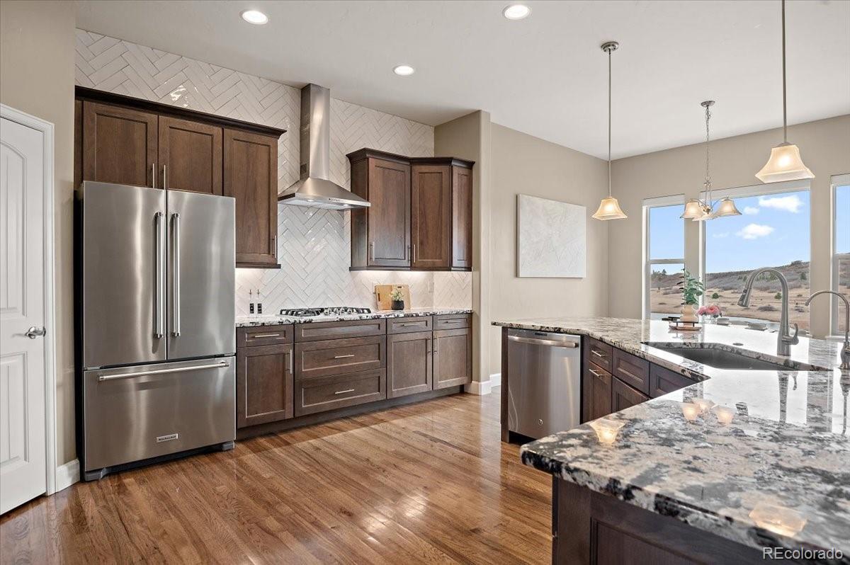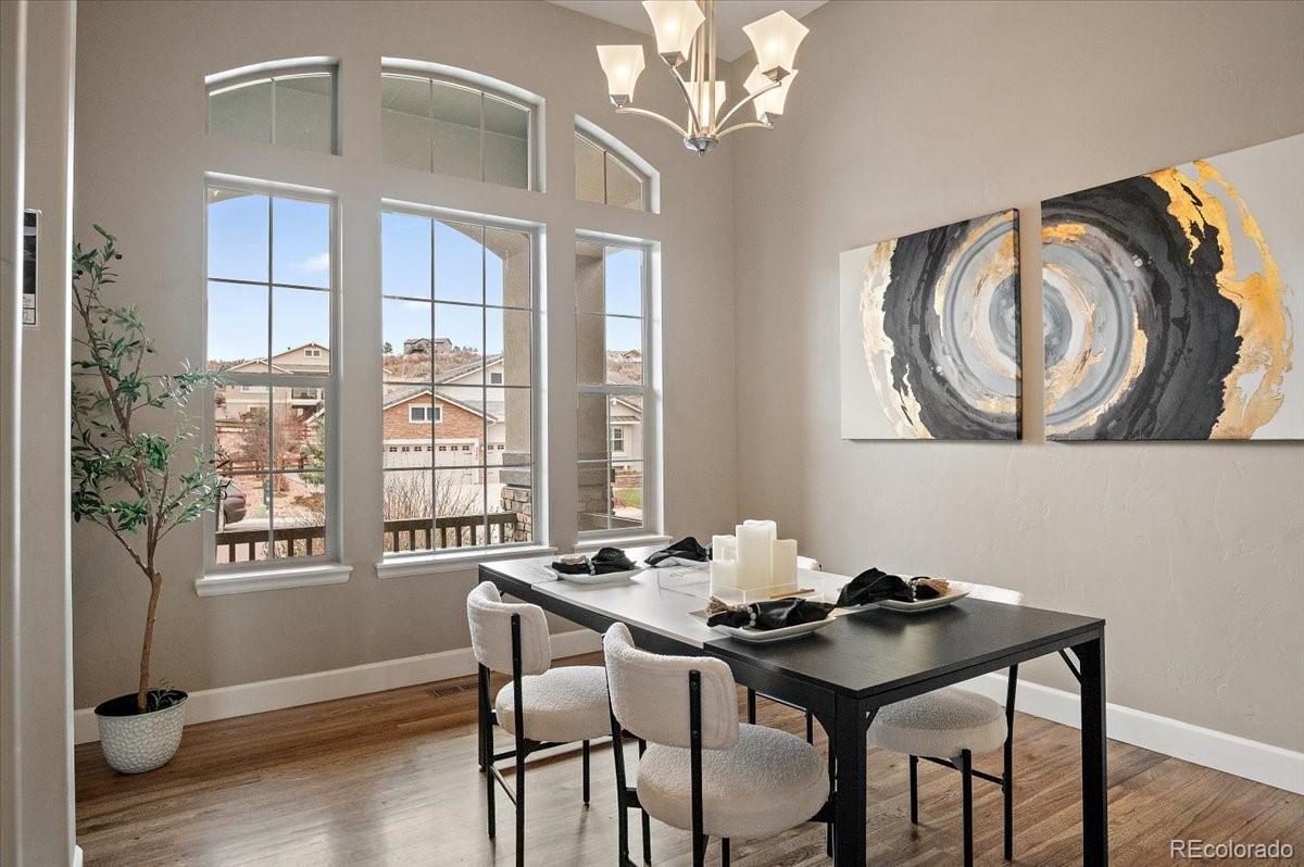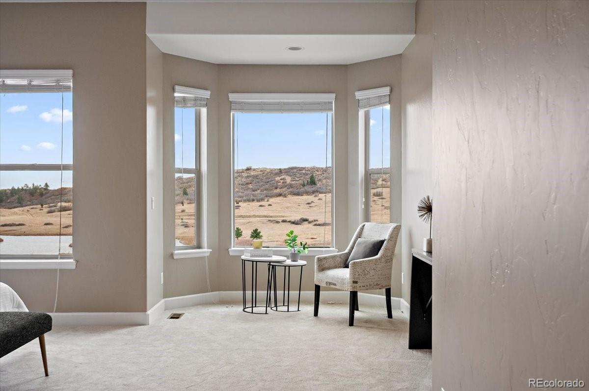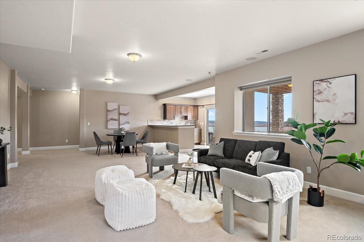 This Stratford walkout rancher is perfectly situated on a premium lot that backs to a serene lake and open space in one of the most coveted neighborhoods in all of Monument. From top to bottom, no detail was overlooked in the thoughtful design and high-end upgrade selections throughout from instant hot water to a reverse osmosis water system. A covered front porch and a formal entry opens into a beautifully designed formal dining room with custom arches, leading seamlessly into the expansive great room and gourmet kitchen. The great room concept is both open and inviting, featuring millrun hickory floors, a dramatic stacked stone fireplace, and a wall of windows with motorized bluetooth blinds that frame unmatched lake and mountain views, allowing natural light to pour in. The chef’s kitchen is a showstopper, complete with a massive solid granite slab island, premium appliances, a bright breakfast nook, and direct access to the covered custom deck—perfect for enjoying the panoramic scenery. The main level offers a spacious secondary bedroom and a luxurious master suite with stunning views and a spa-like 5-piece bath. Entering from the oversized garage, you'll find a convenient mudroom/laundry room outfitted with matching cabinetry and a functional folding area. A custom extra-wide stairwell with wrought iron balusters and hardwood railing leads you to the fully finished walkout lower level, where a large rec/media room awaits, complete with a wet bar featuring granite counters, tumbled marble backsplash, and a built-in wine fridge. From here, step outside to a massive 49' x 19' patio with a beautiful water feature, fire pit, outside gas stout, hot tub, and breathtaking views, making this level ideal for entertaining and wired for surround sound inside and out (over $75k in outside landscaping). The garage is oversized with a 4 ft extension and a backyard access door. This home is a rare gem and an extraordinary find—and truly feels practically brand new.