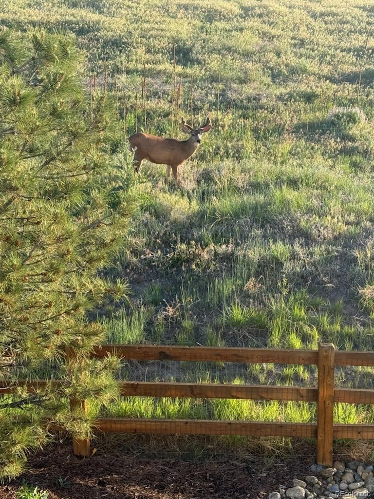 Ranch living at its finest in an exquisite Castle Pines home with a modern farmhouse elevation, backing to open space with mountain views. Live in this newer home with all the custom upgrades and designer finishes already added. From high-end flooring to elegant fixtures, wood trim accents, marble backsplash and mont blanc quartz counters. The spacious, open floor plan with 10 foot ceilings allows for seamless flow and natural lighting flooding the space. The main floor has 2 bedrooms with two ensuite baths, including the the primary with an oversized stunning glass enclosed marble shower. In addition, a large modern office space with black steel modern French doors, mudroom with custom built-ins. The living room has a statement chandelier & modern black fireplace. The stunning kitchen features a 9 ft mont blanc quartz island, gourmet appliances, white shaker soft close tongue and groove cabinetry, striking gold pendant & sconce lights & white carrera marble backsplash to the ceiling. The dining space is just off the kitchen and overlooks the greenspace. All of the windows are shaded with custom Restoration Hardware drapery/window coverings. The large elegant master bedroom overlooks the private backyard and connects to the primary bathroom. Dual vanities, a built-in makeup counter, upgraded tile in the large walk-in shower with dual showerheads. The spacious walk in closet connects you to the laundry room, which showcases black and tan checkered tile. The walk out finished basement houses 2 additional bedrooms, a full bath, a living room with a beautifully designed dry bar, black shiplap, beverage fridge, & quartz counters. The most unique feature of all is the hidden additional basement space you’ll discover behind the armoire doors. Step outside into the landscaped yard with 15 ft pine trees, 2-tiered deck, large brick patio oasis. Throughout the year, large elk herds/deer gather in this open space, creating a remarkable sight paired with breathtaking sunrises.
