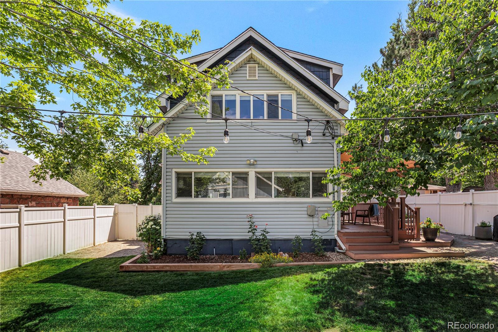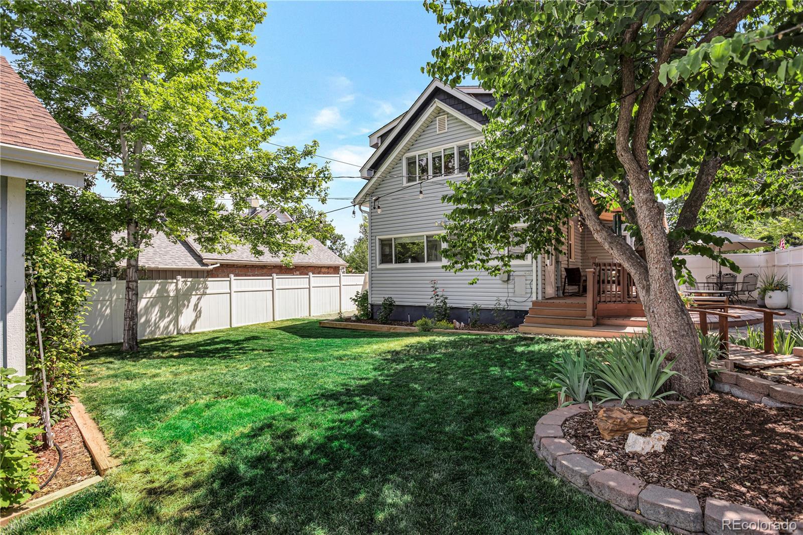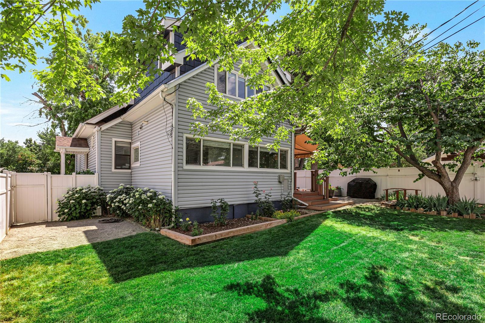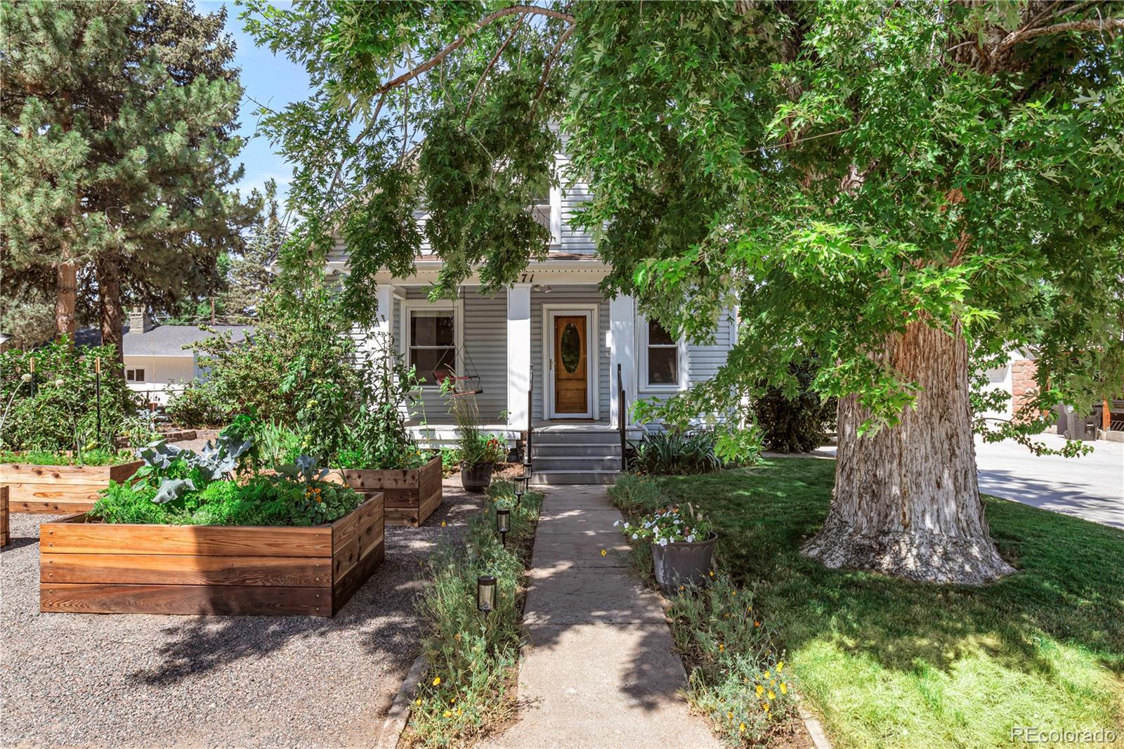 Meet your next great chapter in this beautifully updated 1911 classic—full of charm, character, and modern vibes. From the moment you arrive, the big covered front porch sets the tone. Picture lazy afternoons on the porch swing, coffee in hand, waving to neighbors as they stroll by. Step inside through the oval-glass front door and feel right at home. The main floor is warm and welcoming, with a cozy living room, a spacious dining room with a bay window overlooking the patio, a flexible corner office or bonus (non-conforming) bedroom, and a stylish full bath with exposed brick. There’s also a generous laundry/mudroom—because real life happens. And yes, the chef’s kitchen delivers: custom cabinetry with smart pullouts, a gas stove, and under-cabinet lighting that makes cooking (or takeout plating) feel next-level. Solid oak floors throughout the main level are a treasure! Upstairs, you’ll find two seriously spacious bedrooms. The front bedroom features a sweet nook tucked under the eaves—perfect for reading, relaxing, or creative play. The back bedroom is the dreamy primary suite, complete with vaulted ceilings, a wall of windows framed by trees, a walk-in closet, and a truly gorgeous en-suite bath. Outside, the front yard is xeriscape done right, with self-watering raised beds ready for flowers, herbs, or your summer veggie grow-up. The private backyard is a year-round favorite, featuring perennial blooms, shady trees, and a brand-new awning over the large patio—ideal for outdoor dinners, weekend lounging, or casual gatherings. Bonus points for smart, future-forward upgrades like a tankless water heater and an EV charging station in the oversized garage. And the location? Absolute gold. Tucked away on a quiet street, yet perfectly positioned between Downtown and DTC, with easy access to light rail and bus lines. Honestly—it doesn’t get better than this.