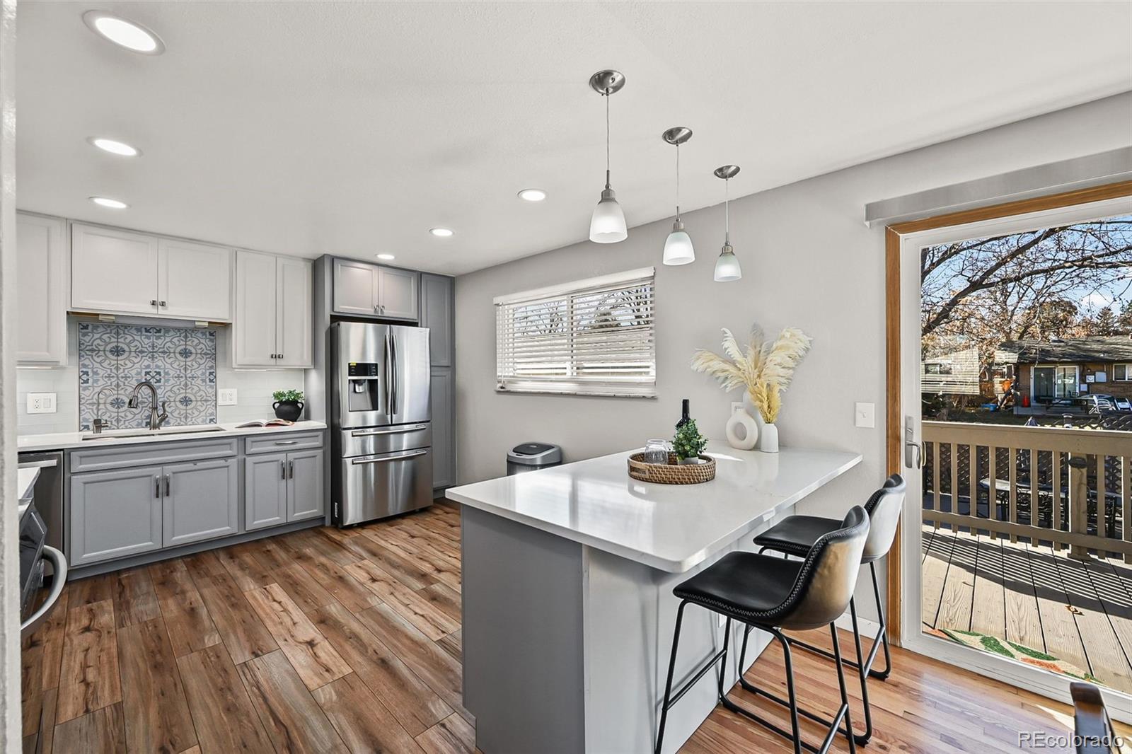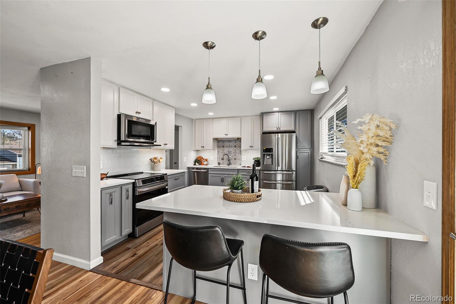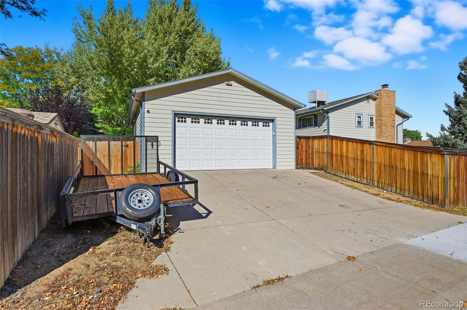 Discover this beautifully remodeled and move-in ready Littleton gem on a spacious corner lot! Offering 1,893 finished sq. ft., 3 bedrooms, and 3 baths, this home blends style, function, and rare garage space. The main level features gorgeous wood floors throughout, newer lighting, accent paint, and Champion windows for wonderful natural light. The updated kitchen is a showpiece with quartz countertops, custom cabinetry, stainless appliances, pendant lighting, custom tile backsplash, and an eat-up island. The primary bedroom offers wood floors, accent paint, great windows, and an updated 3/4 bath with fresh paint, nice lighting, and a glass shower door. Two additional bedrooms share a newly painted full bath with tile floors, a modern vanity, and great lighting. The lower level impresses with brand-new carpet, a brick-surround wood-burning fireplace with mantel, wood accents, an updated powder bath, laundry area, utility space, and convenient under-stair storage. A major standout is the garage space—an attached oversized 2-car garage with work-space, storage and shelving PLUS a detached, heated 24x36 4+ car garage with vaulted ceilings and a refrigerator—perfect for hobbyists, car enthusiasts, or extra storage needs. The fully fenced, landscaped corner lot offers a large shed and an expansive 3-tier deck ideal for outdoor entertaining. Fantastic location close to amenities, parks, and more. This one is truly special—don’t miss it! Roof was replaced in 2019/2020, resided with hardy board siding, fiber quantum available, Eco bee thermostat, entire house was re-wired with copper, all permitted! Brand new electrical panel, no popcorn ceilings, all new recessed lighting, fire suppression all wired together, Kitchen was remodeled and the cabinets are soft close, offer rollouts, pantry with tons of pull outs, EVP for tesla in garage, water heater replaced in 2019 (12 year warranty), chimney and ducts cleaned! Move-in ready!!