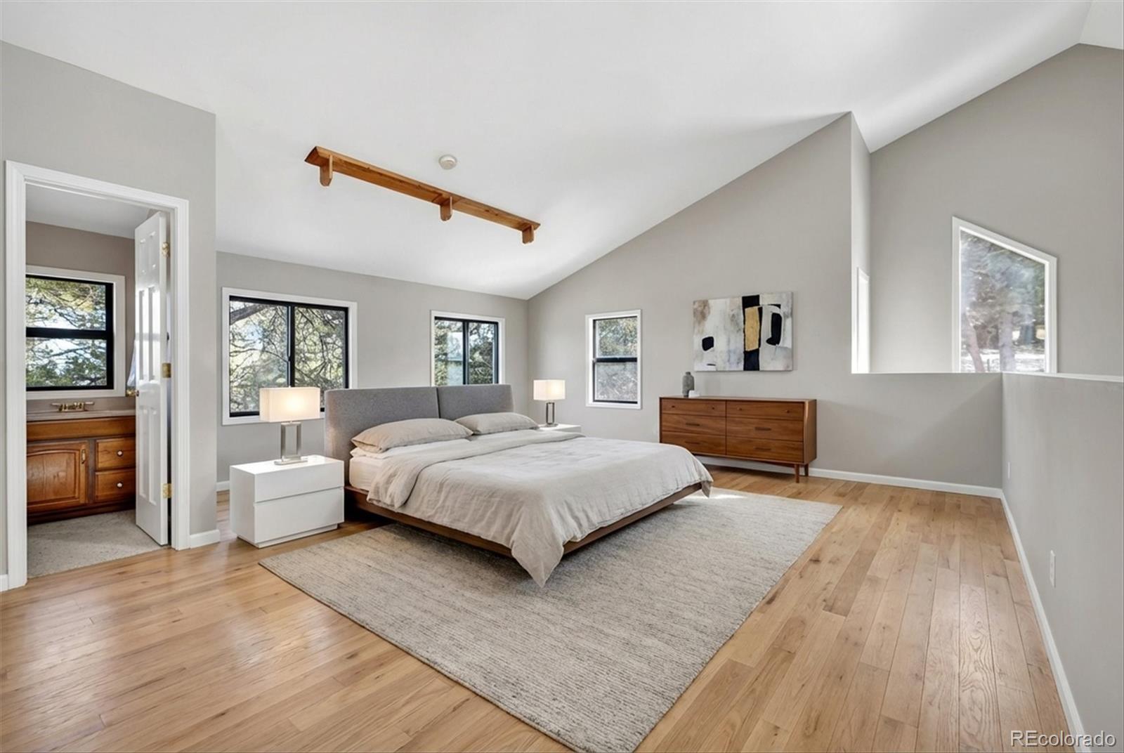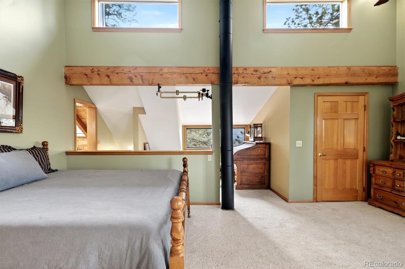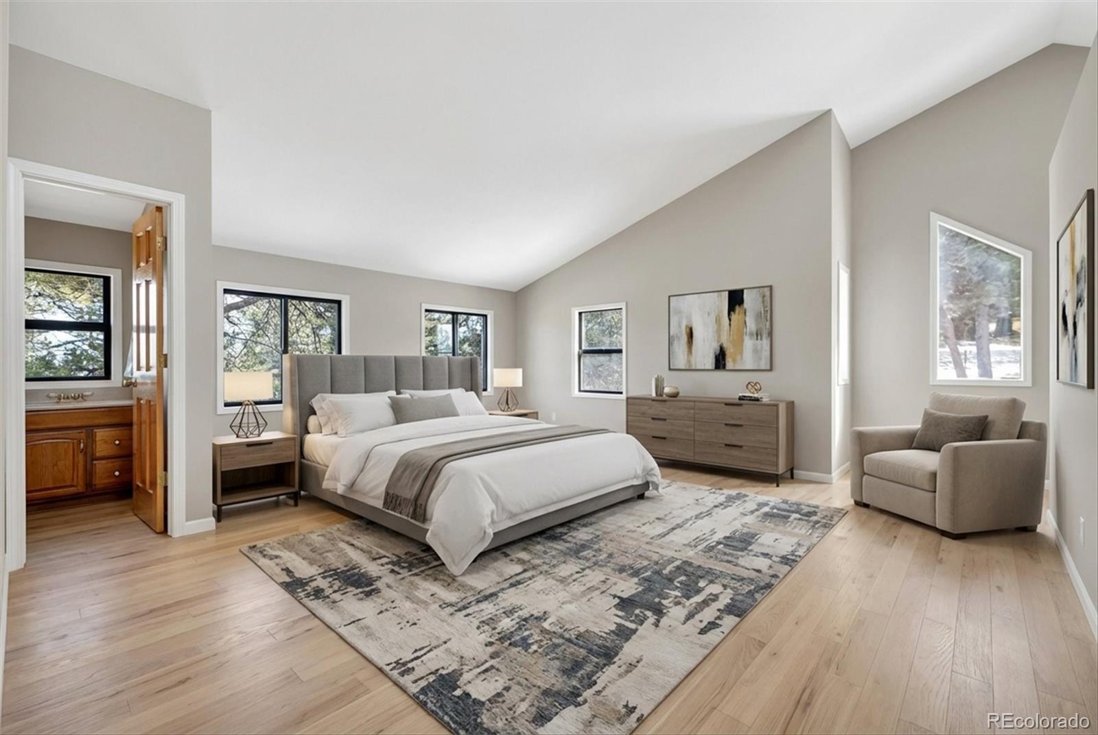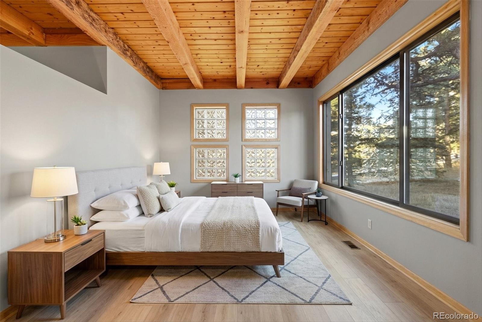 **Stunning mountain retreat with sweeping views and exceptional privacy.** This light-filled home features an open floor plan designed to capture the scenery from every angle. The kitchen and dining area are anchored by a charming wood-burning stove and feature durable, stylish LVP flooring that flows through the kitchen, dining space, and remodeled main-floor bathroom creating a cohesive and low-maintenance living area. The remodeled kitchen showcases stainless steel appliances, quartz countertops, and modern finishes, while the updated main-floor bathroom adds both style and convenience. The expansive living room offers a dramatic entertainment area complete with a wet bar perfect for hosting gatherings or relaxing after a day outdoors. The primary suite includes a private deck to take in the peaceful surroundings and breathtaking sunsets. Enjoy spa-like amenities with a hot tub and sauna, plus upstairs washer and dryer hookups for added flexibility. The home also offers excellent potential to add one or two additional bedrooms, making it ideal for future expansion. Recent improvements include a new well pump and piping and a newer hot water heater. A $7,500 carpet allowance and $7,500 deck allowance allow buyers to personalize the space to their taste. Surrounded by abundant wildlife and close to miles of hiking trails, this private setting feels worlds away while remaining just 10 minutes from Home Depot and Walmart and only 15 minutes to Lakewood. A rare blend of tranquility, views, and convenience this is Colorado living at its best. **Some photos AI enhanced. Some photos are AI generated to show possible additional bedroom configuration. Furniture size and scale may not be accurate.** Buyers are advised to independently verify all information, including but not limited to; sq. ft., features, specs, condition, inclusions, taxes, utilities, lot size, permits, zoning requirements, septic system, wells and any specific use considerations.