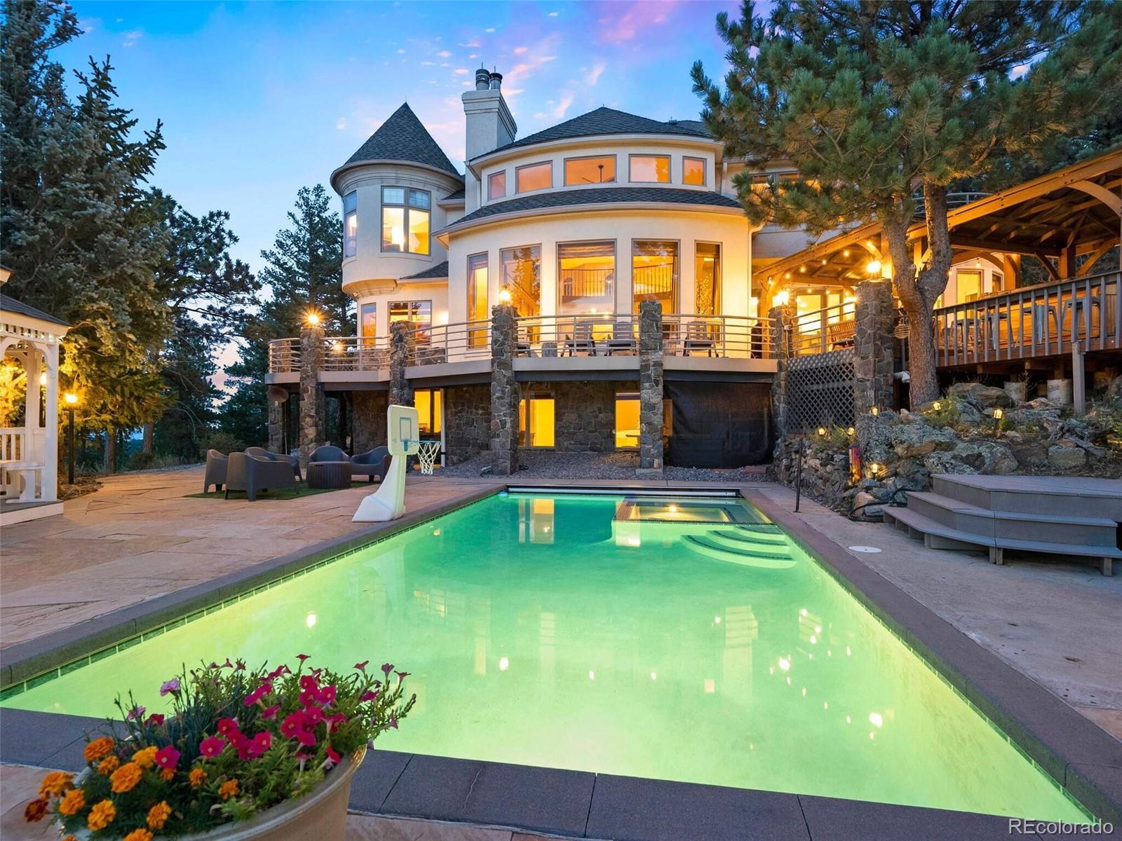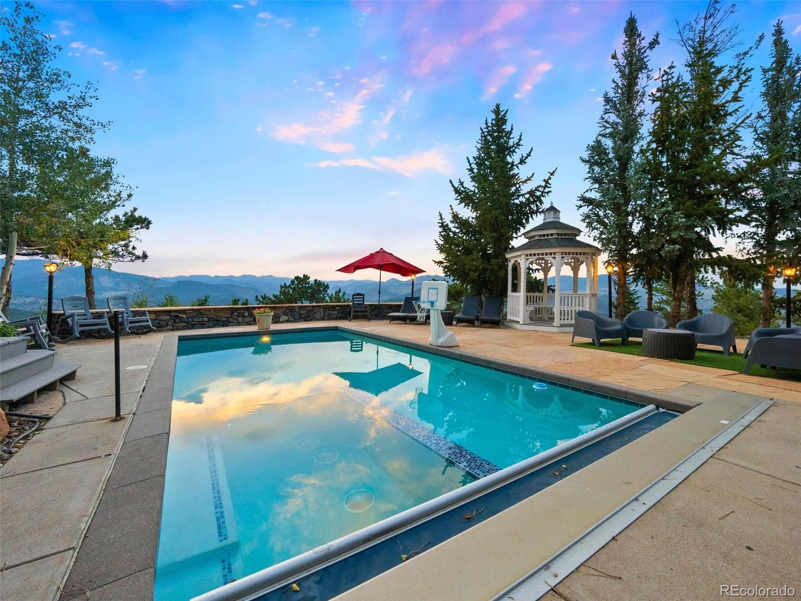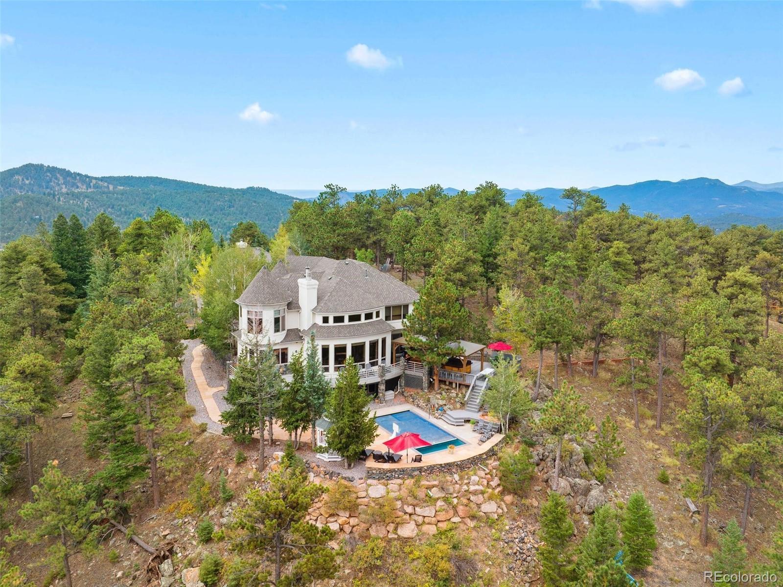 Imagine waking up to the most stunning views of the Rocky Mountain Continental Divide, right from the comfort of your back patio and pool. This exquisite home, nestled on over 4 acres of pristine land, offers not just a place to live but a lifestyle of serenity and elegance—all just 25 minutes from downtown Denver. Your own private, gated mountain retreat, where every day feels like a vacation, and the breathtaking, forever views will leave you in awe. Step inside, and you’re greeted by an open-concept floor plan designed to capture the beauty of the mountains from every angle. The great room, with its dramatic fireplace and curved wall of windows, is perfect for cozy evenings or grand gatherings. For the culinary enthusiast, the upscale gourmet kitchen boasts a Wolf Oven, complemented by a sunroom ideal for growing fresh herbs, promises a delightful cooking experience that meets the highest standards. Every inch of this estate exudes sophistication—from the formal dining room with its custom molding and ceiling to the rich wood-paneled den, complete with its own fireplace. With all bedrooms featuring ensuite bathrooms and multiple common areas, there’s ample space for everyone to relax and enjoy. And then there’s the outdoor oasis—a sparkling pool with an inset spa, surrounded by a spacious patio, where you can entertain guests, unwind, and soak in those spectacular mountain views. This is more than just a home; it’s a lifestyle, waiting for you to embrace it. The home boasts 3 laundry rooms, dog spa, workout room, pool table room and rec areas.
