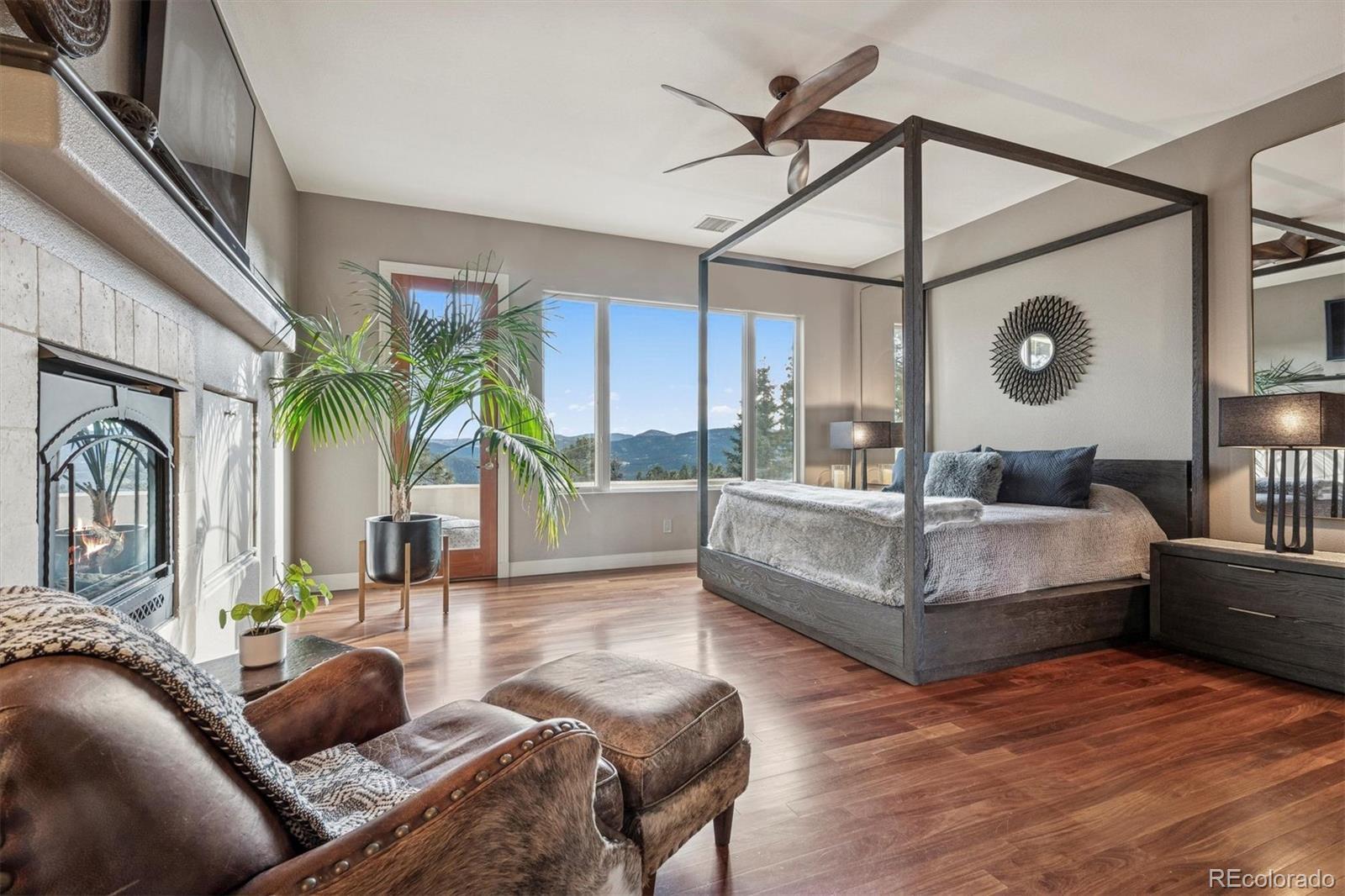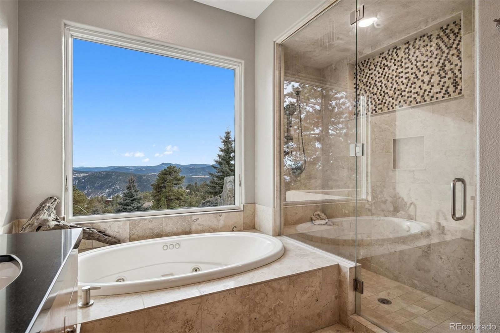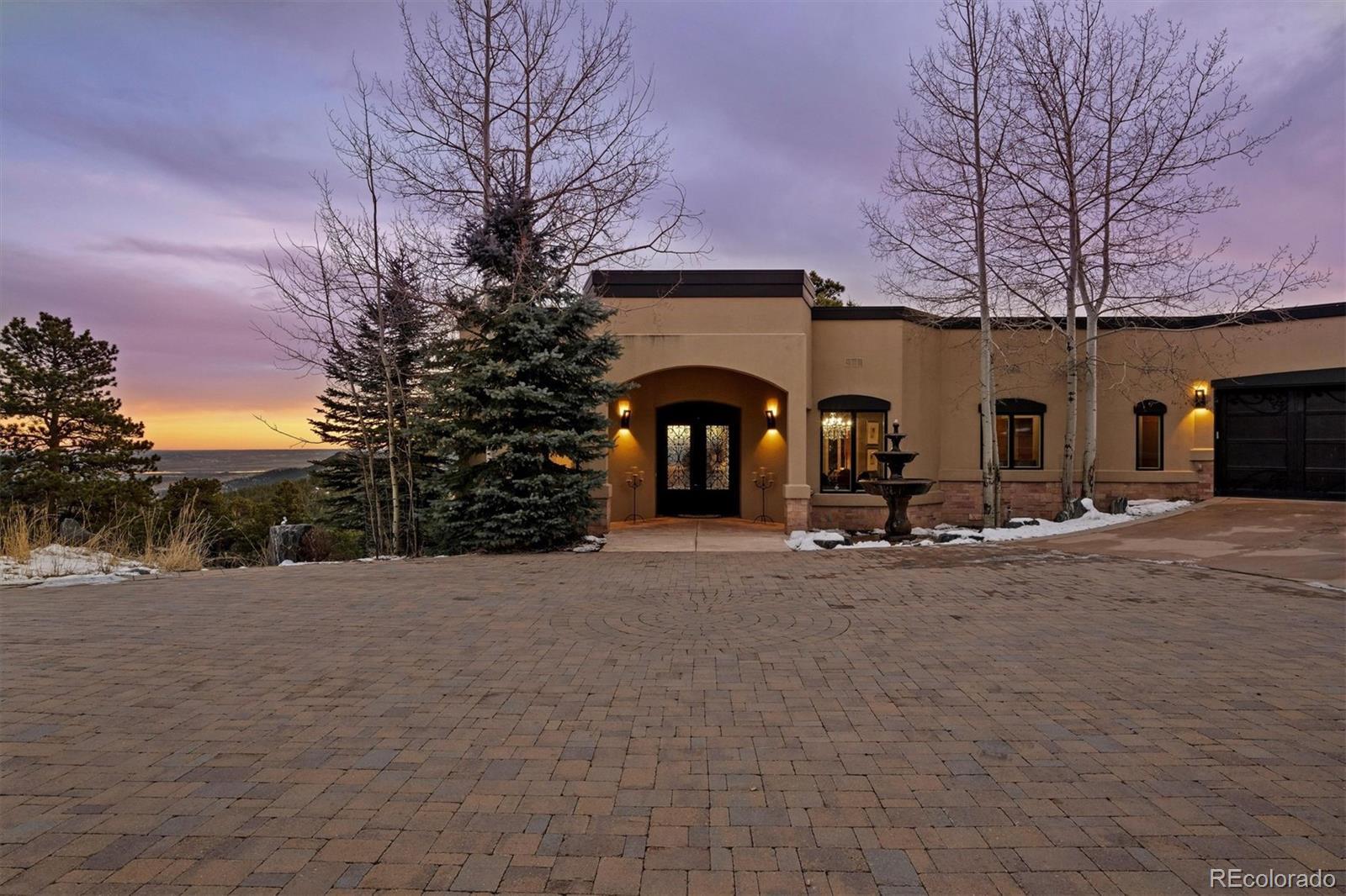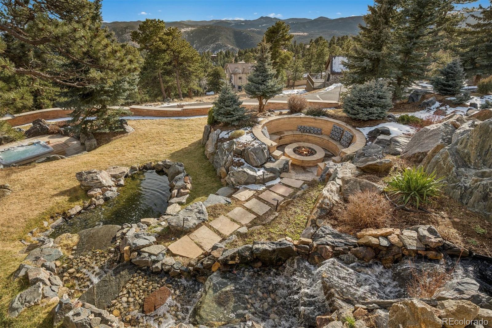 Years in its creation, this quiet premier turnkey property is situated on a south-facing site to take advantage of far reaching views from city lights, to Pikes Peak, the Bear Creek Basin and Mt. Blue Sky, yet is 40 minutes to skiing, DIA and a half hour to downtown Denver. Everyday is a new experience with all day sun from blood red sunrises that fade to pale pink, thundering elk herds traveling through, lightening shows and sensational sunsets. Supremely landscaped with 500 tons of mammoth rocks, a cascading waterfall, pond, firepit, hot tub, swing, herb garden and stone patios, living outside is integral to this property's private enjoyment and allure. Contemporary main level living home is screened by a sentry of mature pines. Wide paver driveway welcomes guests with lit boulders, fountain and custom double iron entry gates. Cherry wood and travertine floors create a canvas for the home's many octagonal shaped rooms including the formal dining room, glass enclosed living room, study and walk-out level space. Walls of glass slide back to showcase Colorado skies and dramatic sun-filled mountain vistas. Chef's kitchen delights with interior LED lit quartzite countertops, walk-in pantry, breakfast nook and Dacor/GE Monogram appliances. Main level primary suite has a private deck, walk-in closet with organizers and sleek 5-piece bath including steam shower and jetted tub. Powder bath and laundry complete the main level. Downstairs is a large glass framed family room with wet bar/kitchenette and accordion doors that open to a heated covered patio; en-suite bedroom; 2 Jack 'n Jill bedrooms with full bath, rubber floored exercise room - gym equipment included, and storage/utility room with shelving for all your gear. Oversized garage has glass wall to the multi-purpose heated workshop/studio with 1/2 bath and dog shower. Glass enclosed bonus room has a wet bar and makes a great hang-out space for entertaining and relaxing! Bedroom under bonus room has hidden entrance.