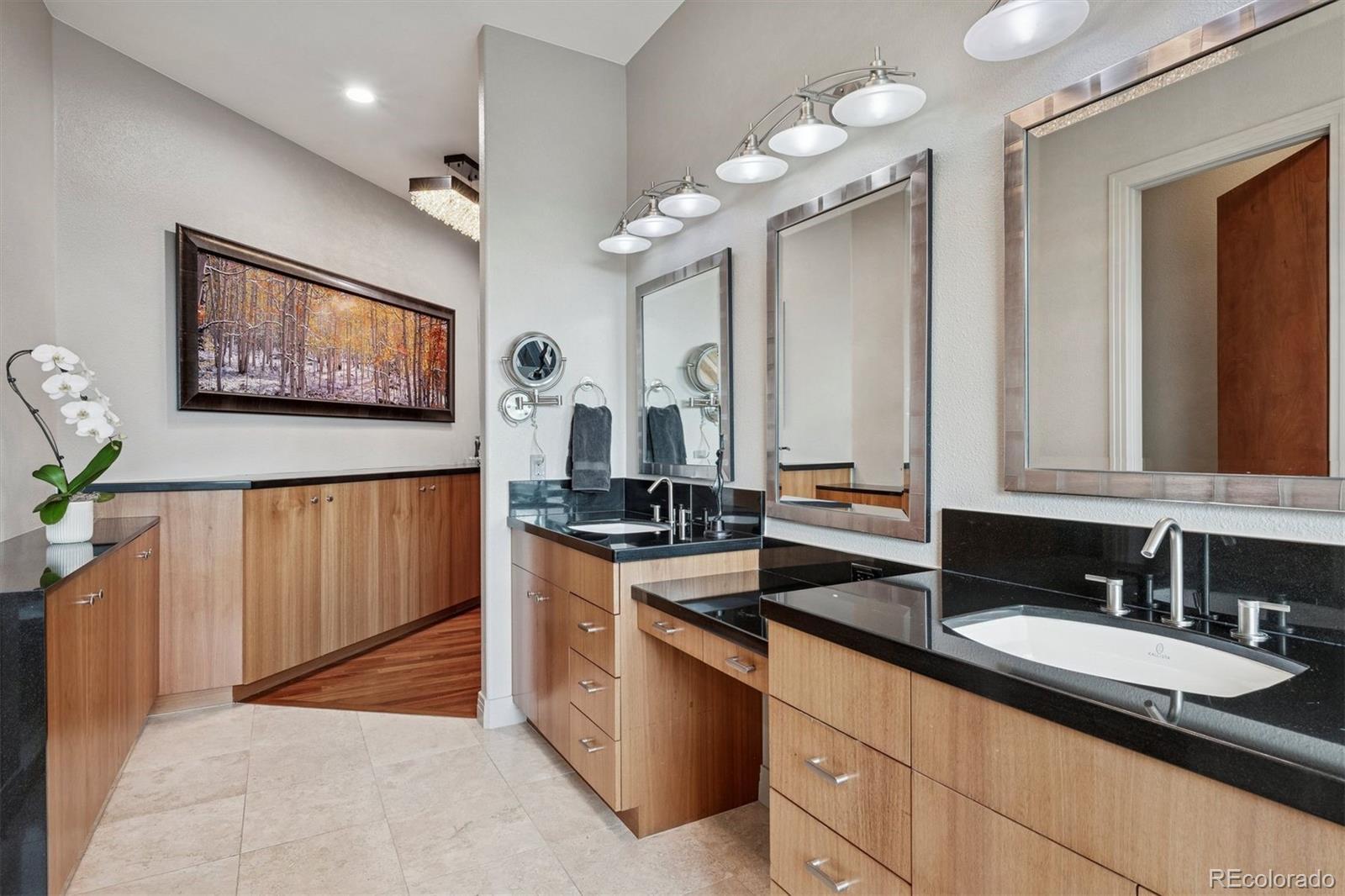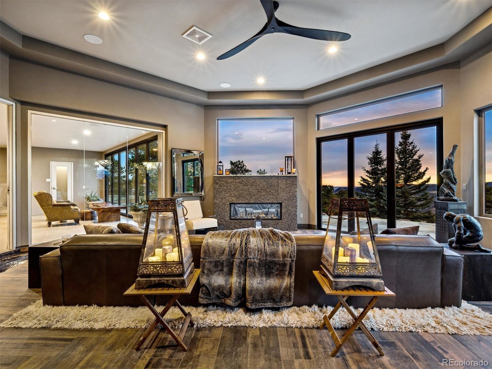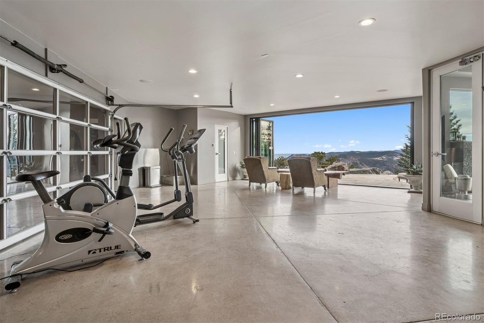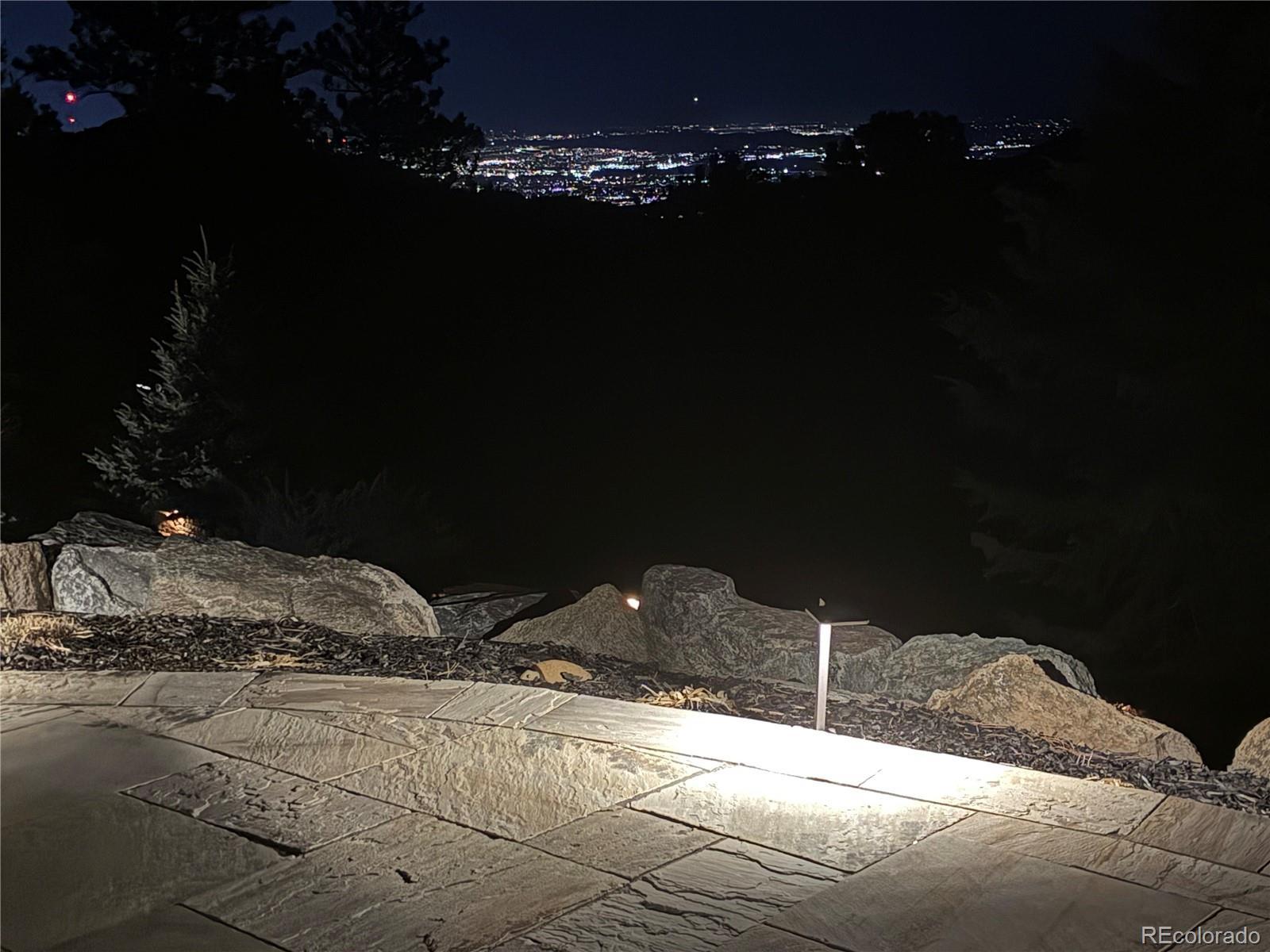 Years in its creation, this quiet premier turnkey property is situated on a south-facing site to take advantage of far reaching views from city lights, to Pikes Peak, the Bear Creek Basin and Mt. Blue Sky, yet is 40 minutes to skiing, DIA and a half hour to downtown Denver. Everyday is a new experience with all day sun from blood red sunrises that fade to pale pink, thundering elk herds traveling through, lightening shows and sensational sunsets. Supremely landscaped with 500 tons of mammoth rocks, a cascading waterfall, pond, firepit, hot tub, swing, herb garden and stone patios, living outside is integral to this property's private enjoyment and allure. Contemporary main level living home is screened by a sentry of mature pines. Wide paver driveway welcomes guests with lit boulders, fountain and custom double iron entry gates. Cherry wood and travertine floors create a canvas for the home's many octagonal shaped rooms including the formal dining room, glass enclosed living room, study and walk-out level space. Walls of glass slide back to showcase Colorado skies and dramatic sun-filled mountain vistas. Chef's kitchen delights with interior LED lit quartzite countertops, walk-in pantry, breakfast nook and Dacor/GE Monogram appliances. Main level primary suite has a private deck, walk-in closet with organizers and sleek 5-piece bath including steam shower and jetted tub. Powder bath and laundry complete the main level. Downstairs is a large glass framed family room with wet bar/kitchenette and accordion doors that open to a heated covered patio; en-suite bedroom; 2 Jack 'n Jill bedrooms with full bath, rubber floored exercise room - gym equipment included, and storage/utility room with shelving for all your gear. Oversized garage has glass wall to the multi-purpose heated workshop/studio with 1/2 bath and dog shower. Glass enclosed bonus room has a wet bar and makes a great hang-out space for entertaining and relaxing! Bedroom under bonus room has hidden entrance.