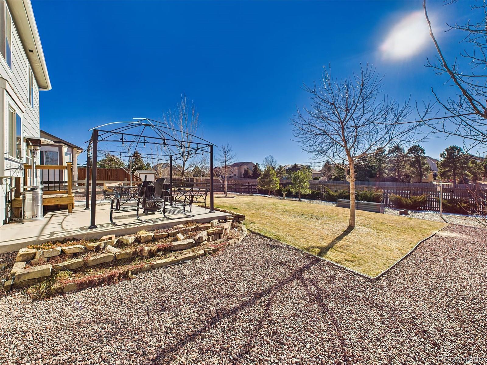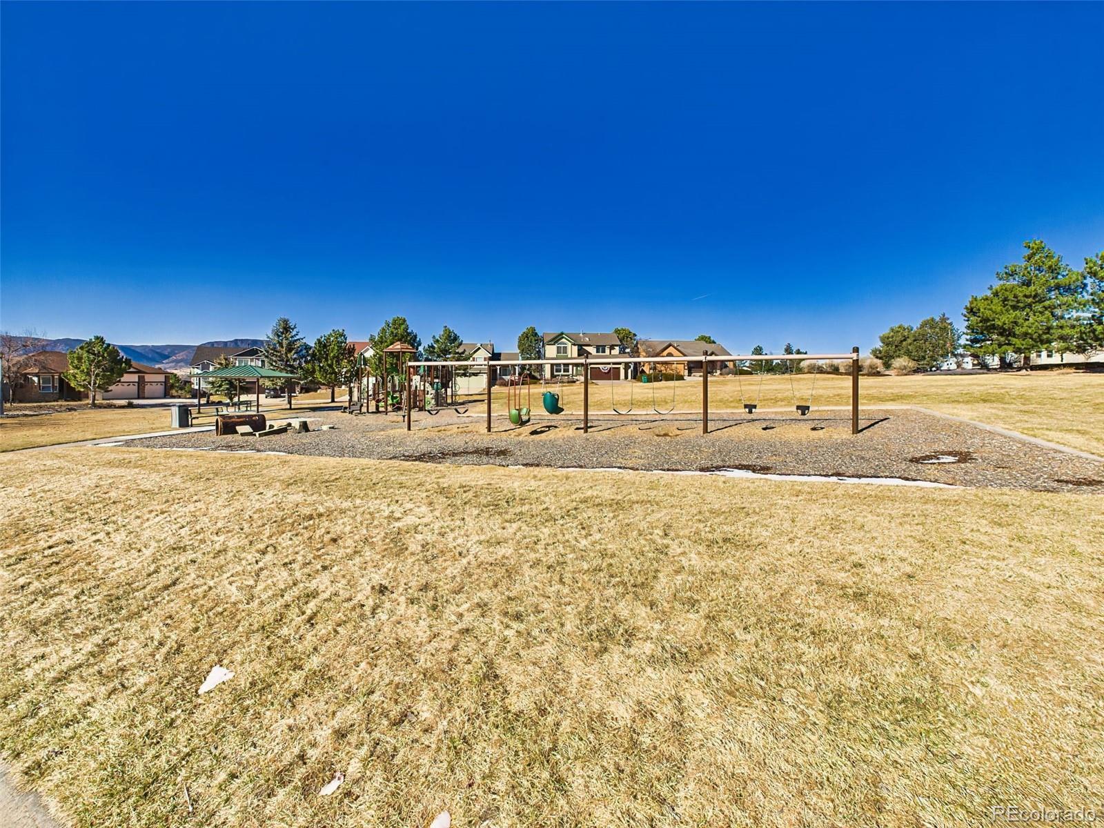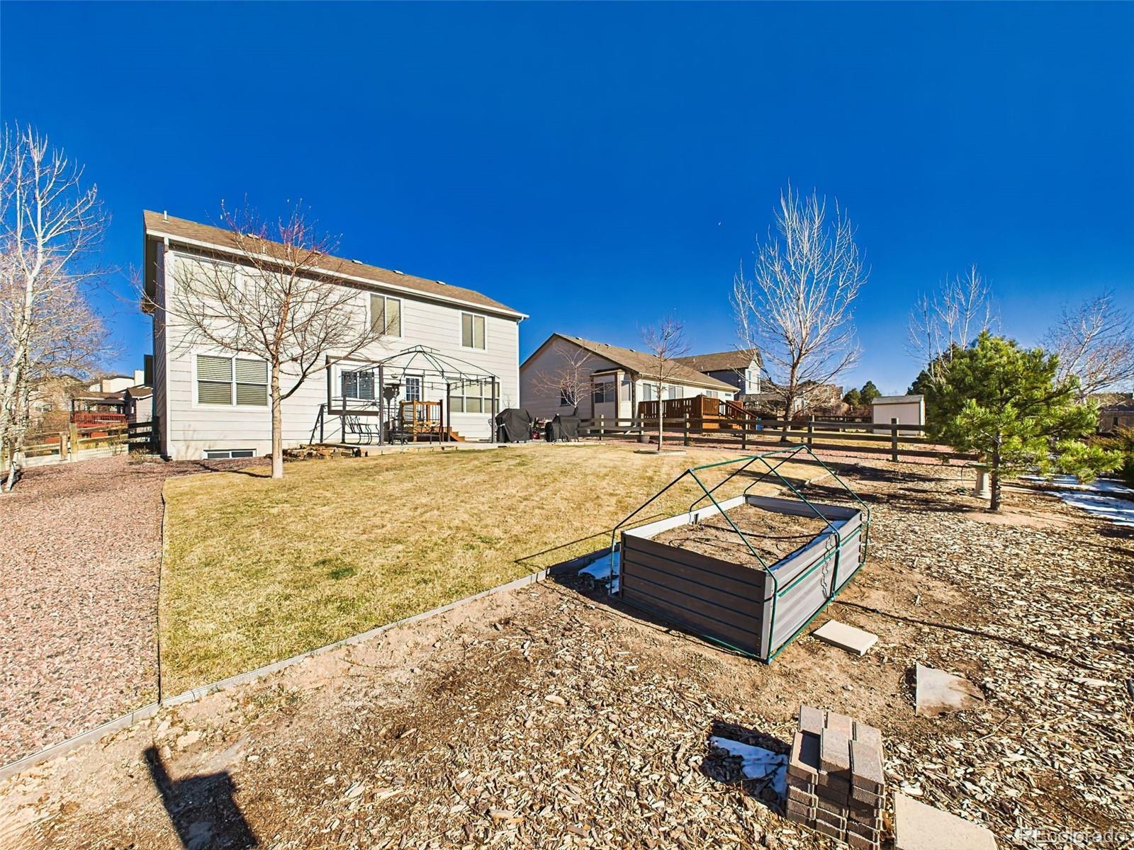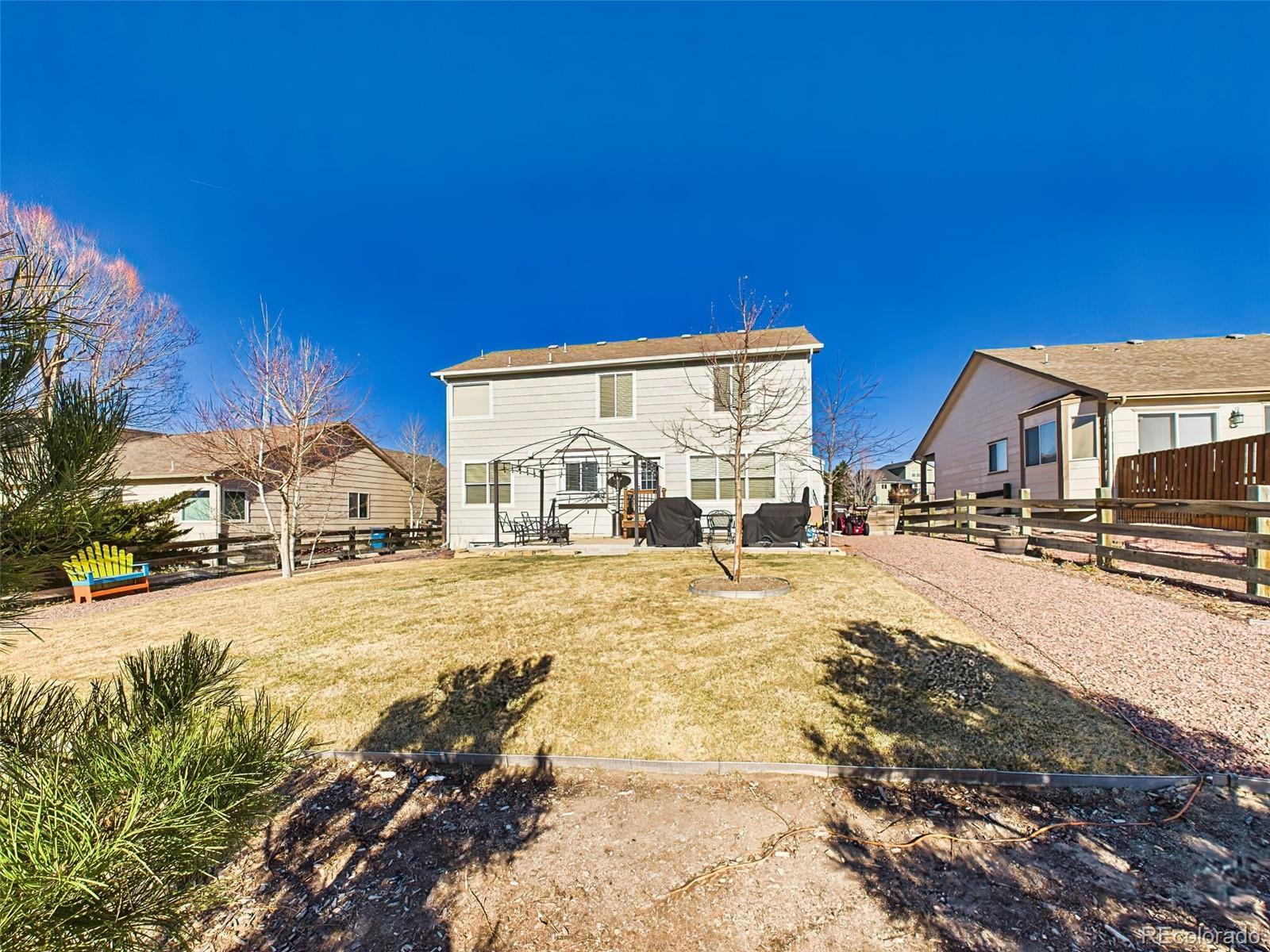 Beautifully maintained and thoughtfully updated, this two-story home offers breathtaking views of Pikes Peak and a layout designed for comfort and function. A welcoming front porch leads into a bright main level featuring hardwood flooring, a spacious living room, and a formal dining area—perfect for hosting. The kitchen boasts granite countertops, a center island with bar seating, ample cabinetry, and direct access to the extended backyard patio. Adjacent, the cozy family room features a whitewashed brick fireplace and large windows for natural light. Upstairs, the expansive primary suite includes vaulted ceilings, a bay window with seating, and a five-piece ensuite bath. Three additional bedrooms and a full bath provide flexible space for family, guests, or home office needs. The unfinished basement offers endless potential with rough-in plumbing for a future bath. Enjoy outdoor living in the fully landscaped backyard, complete with a large concrete patio, metal gazebo, and a raised garden bed—ideal for relaxing or entertaining with panoramic mountain views. Located in The Heights at Jackson Creek, this home is just steps from parks, trails, and a playground, and minutes from shopping, dining, and schools.