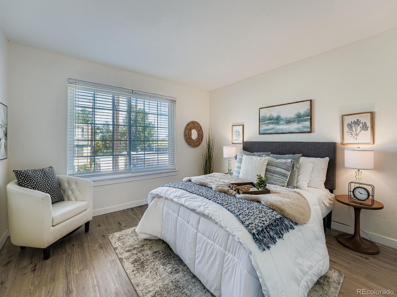 Fresh, bright, and fully renovated, this second-floor 1 bed/1 bath condo in the fully gated Hampden Court community delivers turnkey living in a prime central location. An open layout welcomes you with new LVP flooring and interior paint throughout. The kitchen shines with brand new white cabinetry, beautiful new butcher block counters, stainless appliances, and a breakfast bar — perfect for cooking and entertaining. The spacious bedroom offers two generous closets with built-in shelving, and the full bath has been completely updated with gorgeous matte black accents. Thoughtful upgrades include newer windows and blinds, brand new electrical panel/lighting, and stylish hardware throughout. Enjoy convenient on-site laundry and an exclusive use reserved parking space, accessible only by a gate remote. Ideally positioned just minutes to I-25/I-225, bus routes, light rail, parks, trails, DTC, and Cherry Creek. Well-kept community living with low maintenance — HOA includes water, trash, landscaping, exterior maintenance, and amenities such as a clubhouse, pool, and hot tub. Move right in and start enjoying Denver living today!