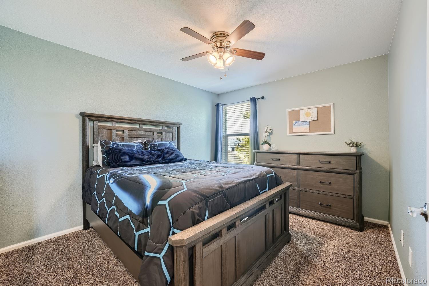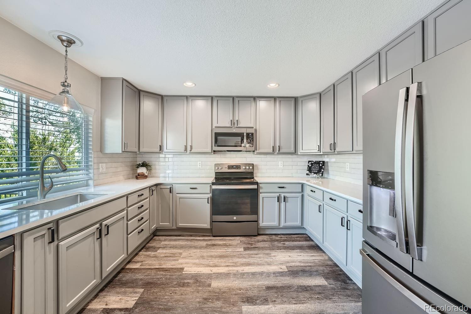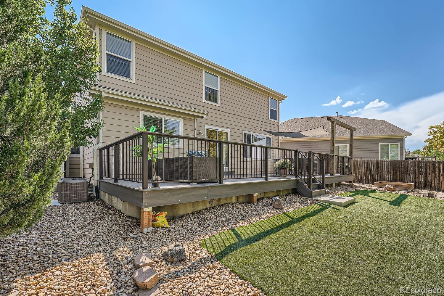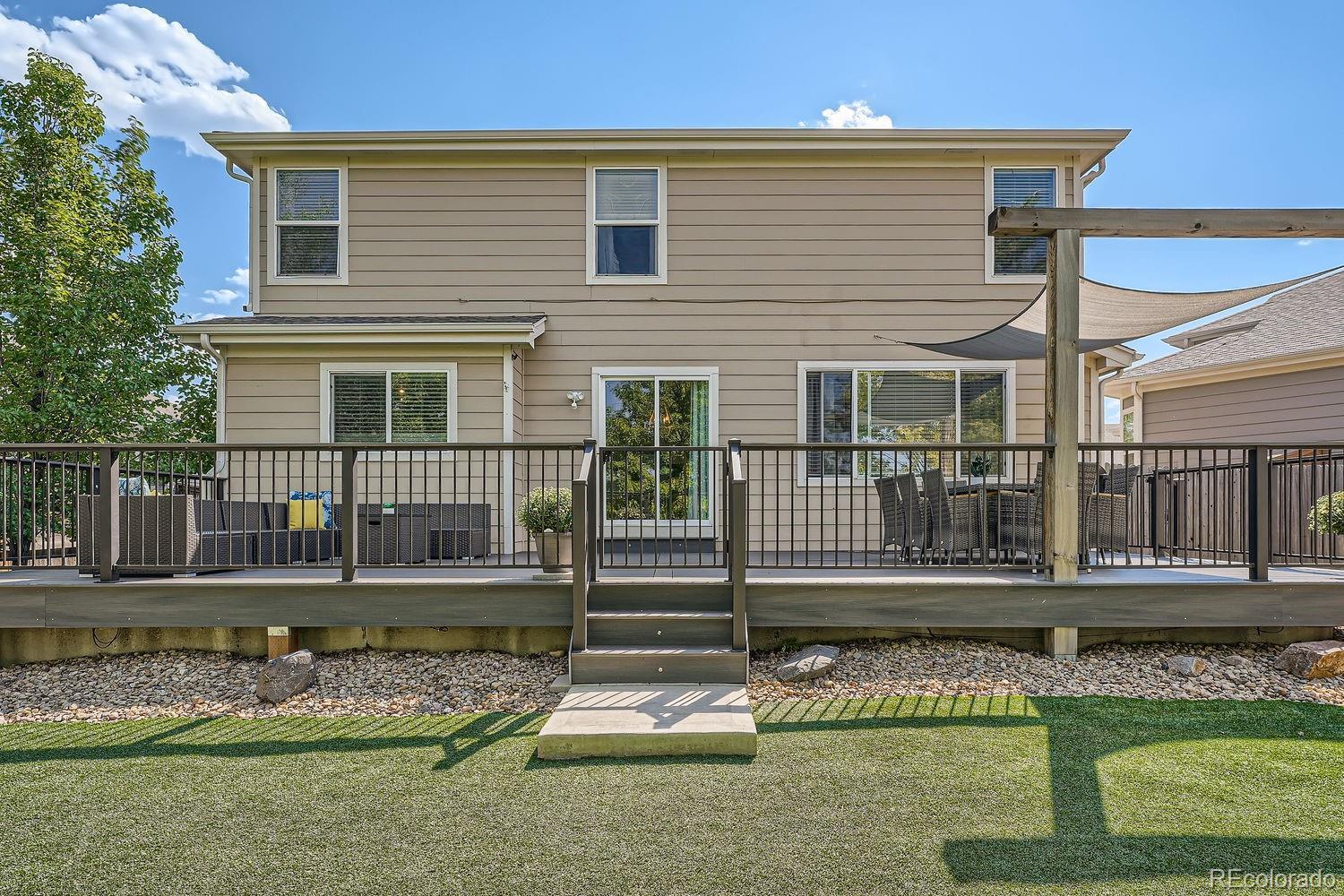 Imagine a home where every detail has been thoughtfully designed to nurture memories for years to come. Located in the beautiful Bradbury Ranch community, this two-story residence offers the perfect balance of comfort, lifestyle, and convenience. As you step through the front door, you’re greeted by a warm, inviting space where sunlight flows through large windows, highlighting the new wide-plank floors that span the entire main level. The heart of the home, the kitchen, is both functional and beautiful. Abundant cabinetry, stainless steel appliances, and expansive countertops make meal prep a breeze. This kitchen is where busy mornings begin and peaceful family dinners end. Adjacent, the cozy family room ensures that no one is ever far from the action, whether it's the kids playing or guests enjoying coffee and conversation. Step outside to a backyard oasis, complete with a newly built Trex deck. String lights twinkle above, creating a magical atmosphere for warm summer evenings. The low-maintenance turf and dedicated pet space make this yard as practical as it is beautiful, all while offering breathtaking mountain views. The fully finished basement offers endless entertainment possibilities. Whether you’re hosting a movie night in the spacious rec room, crafting at the built-in bar, or letting little ones explore their private playroom hideaway, the basement adapts to all needs. A second laundry room, additional bedroom, and bathroom add convenience, perfect for guests or family expansion. The home’s location is unbeatable—just a block from the community pool and a short drive to shopping, dining, and top-rated schools. With easy access to E-470 and I-25, commutes to DTC or DIA are a breeze. This Bradbury Ranch home offers everything you need to build a life of joy, and lasting memories.