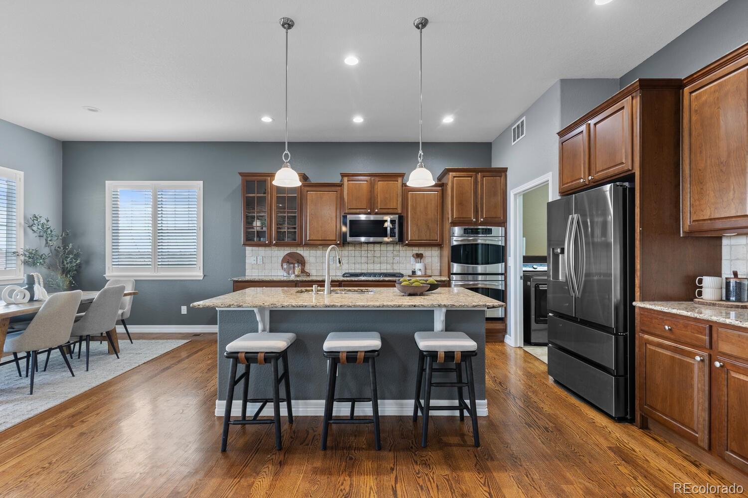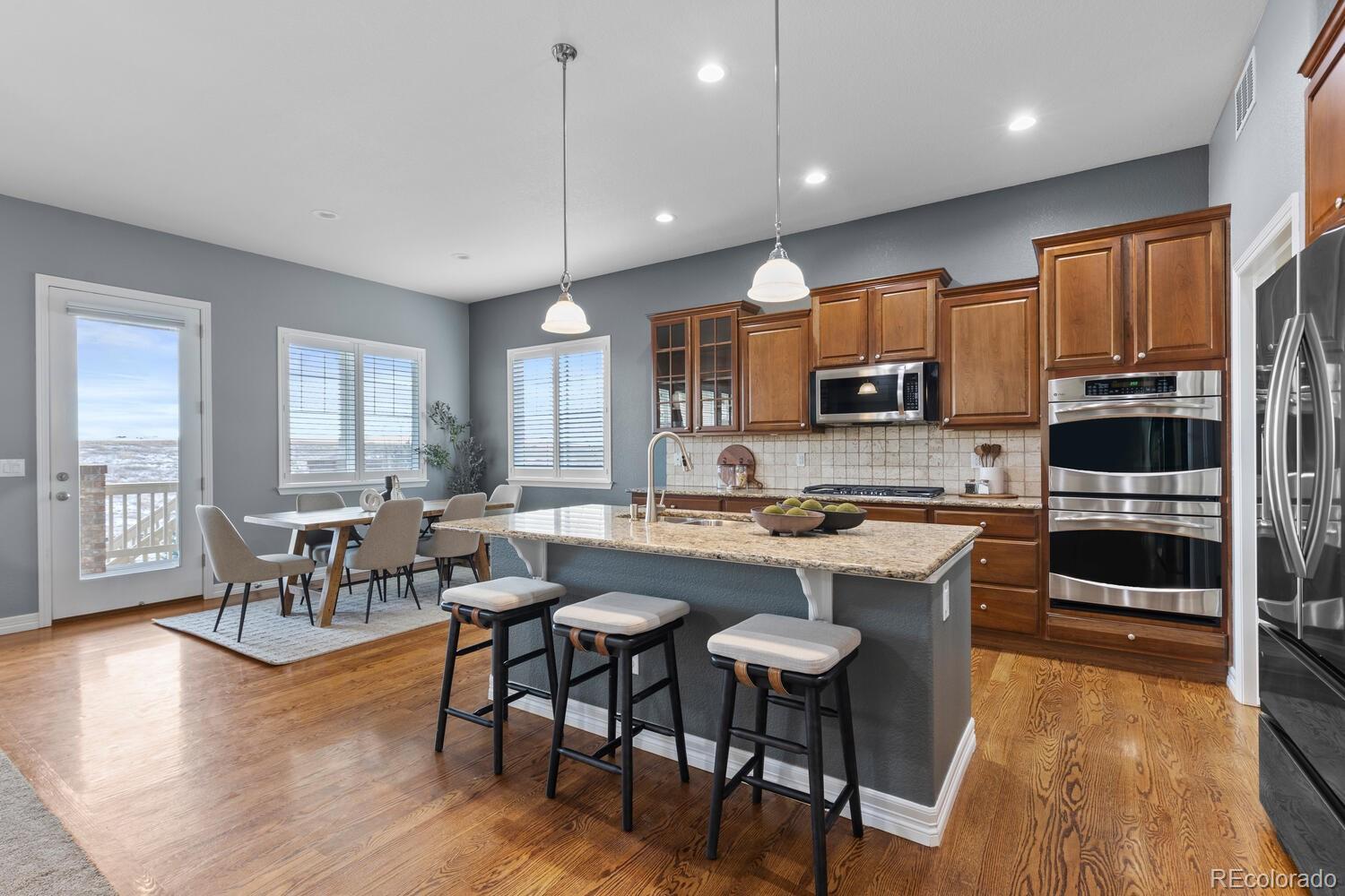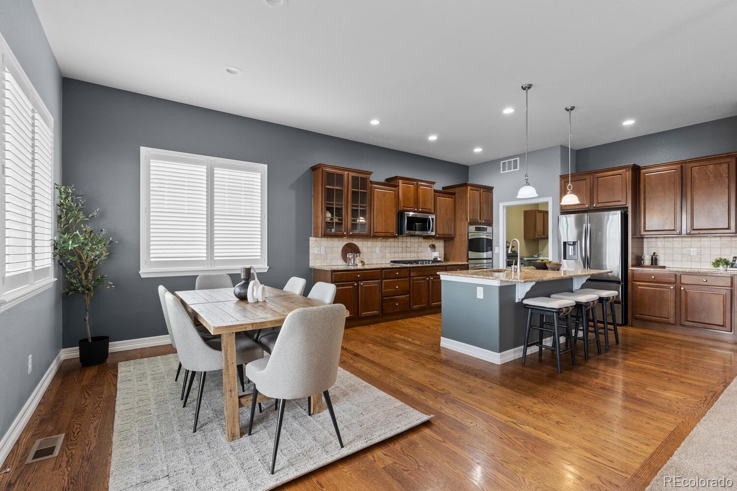 Step into a stunning residence in the highly sought-after Blackstone neighborhood of Aurora. Perfectly situated near Southlands Mall, top-rated dining, shopping, and just minutes to E-470. Nestled directly across from a neighborhood park with a basketball court. Relax on the expansive deck, enjoy morning coffee with the fresh Colorado air, or take in a spectacular Rocky Mountain sunset. Across the street, Toll Brothers ‘Piney Trails’ luxury multi-million-dollar homes are under construction, underscoring the long-term value and prestige of this location. Designed for both comfort and entertainment, this home features 4 spacious bedrooms/office, 3 bathrooms, a bonus room, media room, and a huge walk-out basement. The basement is an entertainer’s dream, boasting a fully finished bar, pool table (included), and versatile bonus room perfect for a home office, gym, playroom, or additional entertainment space. The private media/theater room is equipped with an incredible surround sound system and five luxury theater chairs (included). The upstairs living room also features built-in surround sound, creating a seamless audio experience throughout the home. All appliances, washer/dryer, all theatre room equipment / furniture and all TVs (4) are included, making this residence truly move-in ready. As a resident, you gain immediate access upon closing to the private Blackstone Country Club, offering a lifestyle beyond compare. Enjoy upscale dining, a resort-style pool with splash pad, tennis and pickleball courts, fitness center, and a full calendar of social events—all just steps from your door.