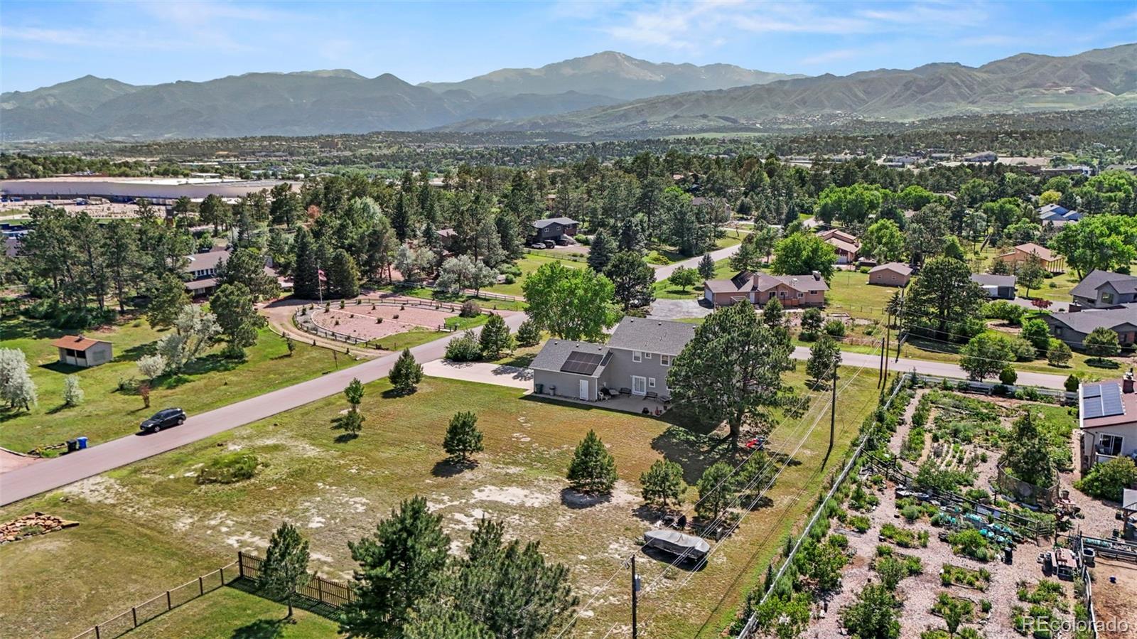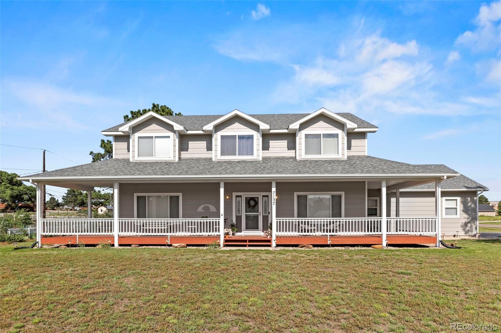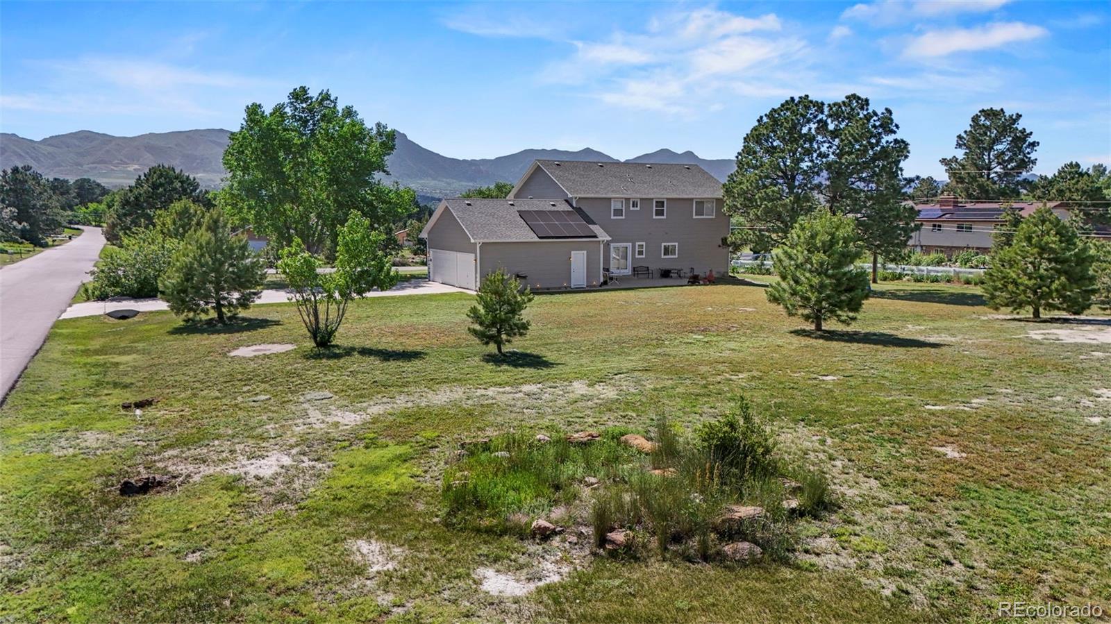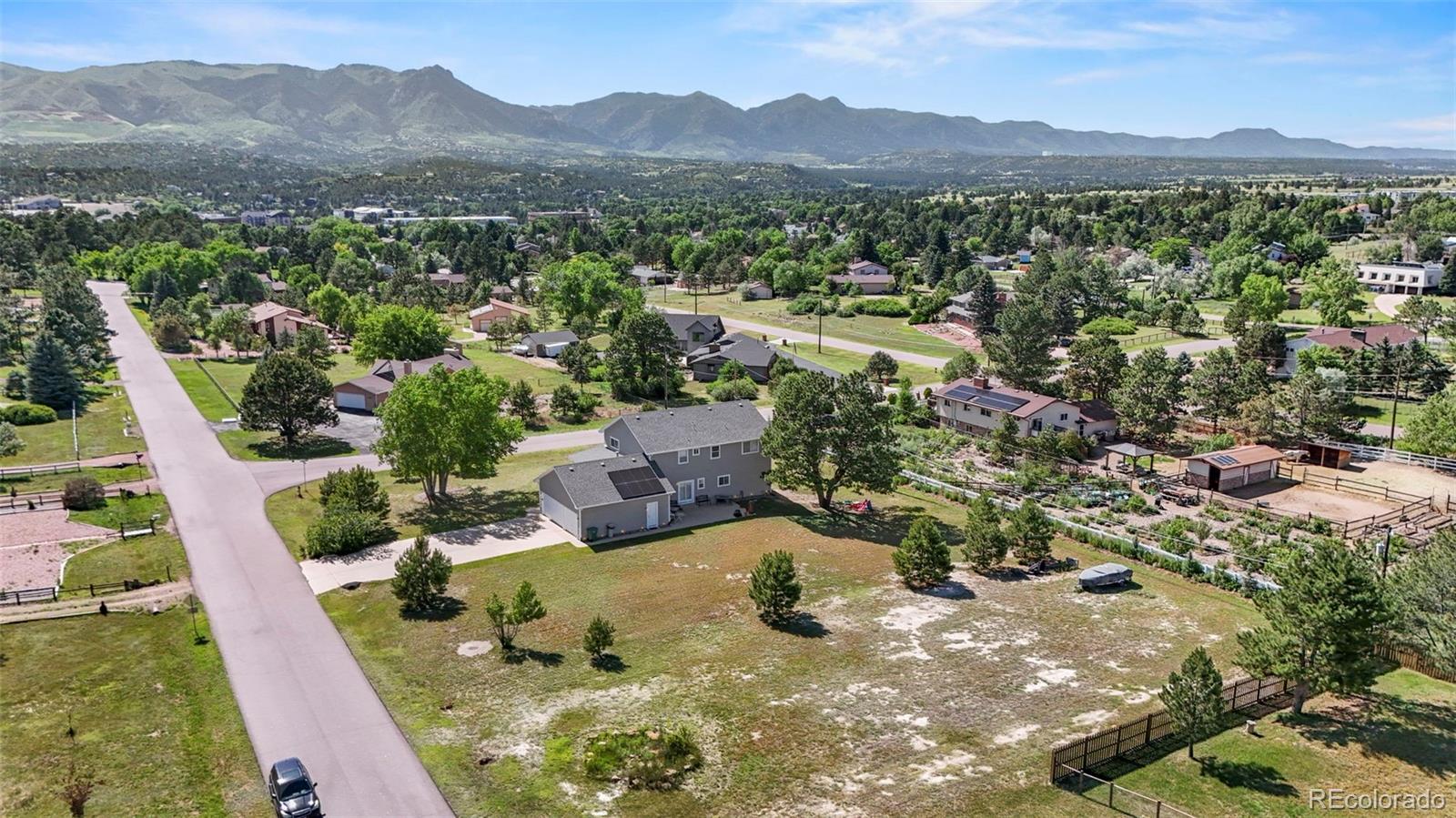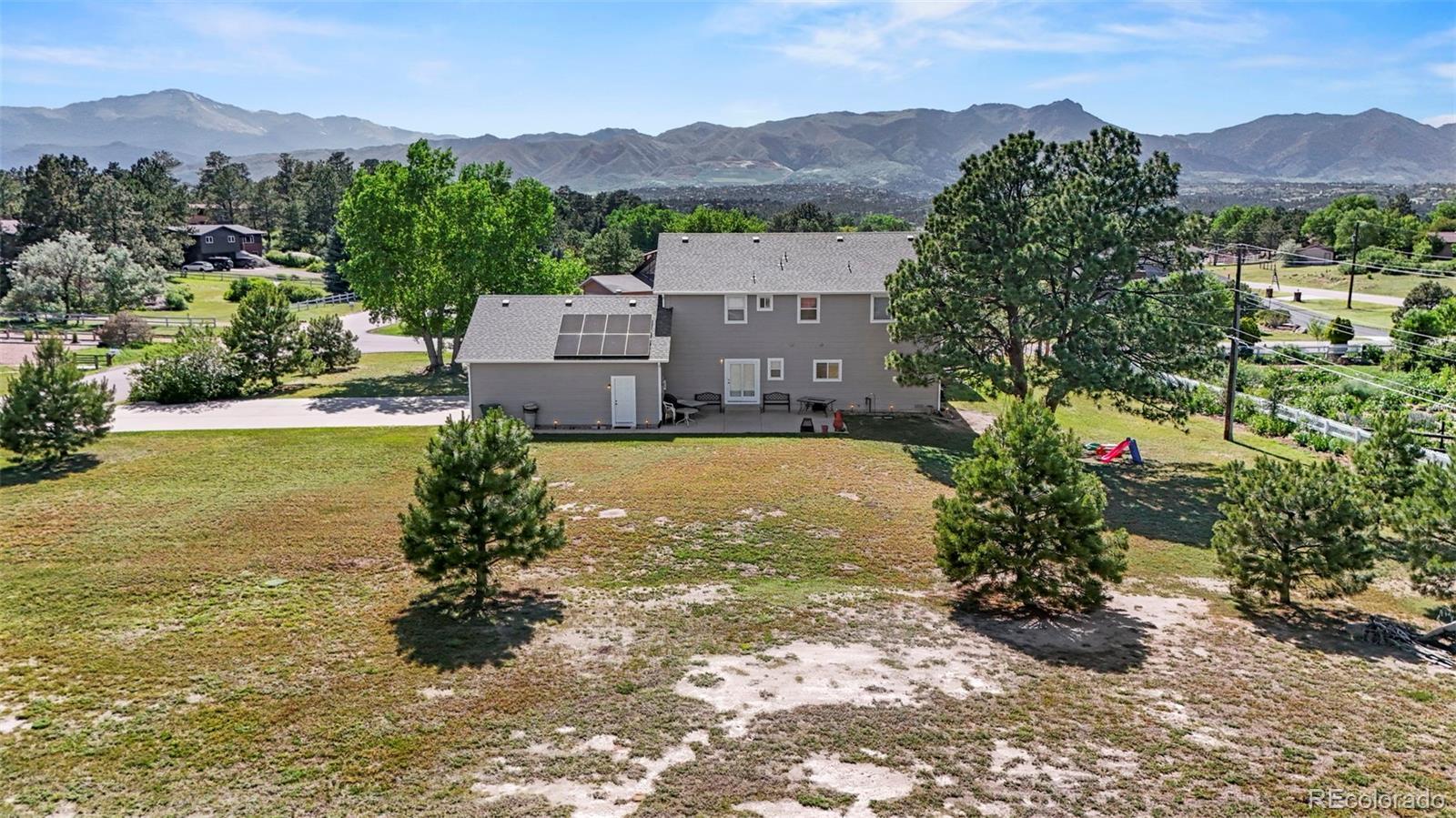 ONE ACRE LOT with VIEWS of the MOUNTAINS from the expansive front deck of this Colonial Style Home! Dreaming of a semi-rural lifestyle in the heart of the city? Your homestead awaits in The Falcon Estates. This coveted neighborhood blends urban convenience with country living. Perfect for those craving city amenities with a rural touch, this rare 4-bedroom, 3-bathroom home with a 3-car garage is the home you have been waiting for. Nestled on a ONE-ACRE corner lot, this property provides ample space and privacy. Inside, you'll find an open-concept main level with new carpet and interior paint. An inviting living room with mountain views flows seamlessly into the kitchen and formal dining room. The kitchen features granite countertops, a stone-accented breakfast bar, newly refaced white cabinets, stainless steel appliances, and updated lighting. The main level also includes a large sitting room or second living room with mountain views, access to the three-car garage, a powder room and a cozy office with french doors. Sliding glass doors open to a backyard complete with a relaxing patio, and the open backyard offers plenty of room to garden, have chickens, or entertain. Upstairs, an expansive master suite offers a true retreat with its en-suite bathroom. Three additional bedrooms and a full bathroom complete the upper level (All FOUR bedrooms on the upper level bedrooms –a rare find!) This home's appeal extends beyond its walls: situated in the highly sought-after D-20 school district, its minutes from dining and shopping at Falcon's Landing and other establishments on Academy Boulevard. Nature lovers will appreciate the short drive to stunning outdoor spaces like Ute Valley Park and Blodgett Peak. Recent upgrades include fresh interior and exterior paint, new carpet, solar panels, granite countertops in the kitchen, and new light fixtures on the main level. Even more, imagine adding a large steel barn shed for your toys on this level 1-acre property.