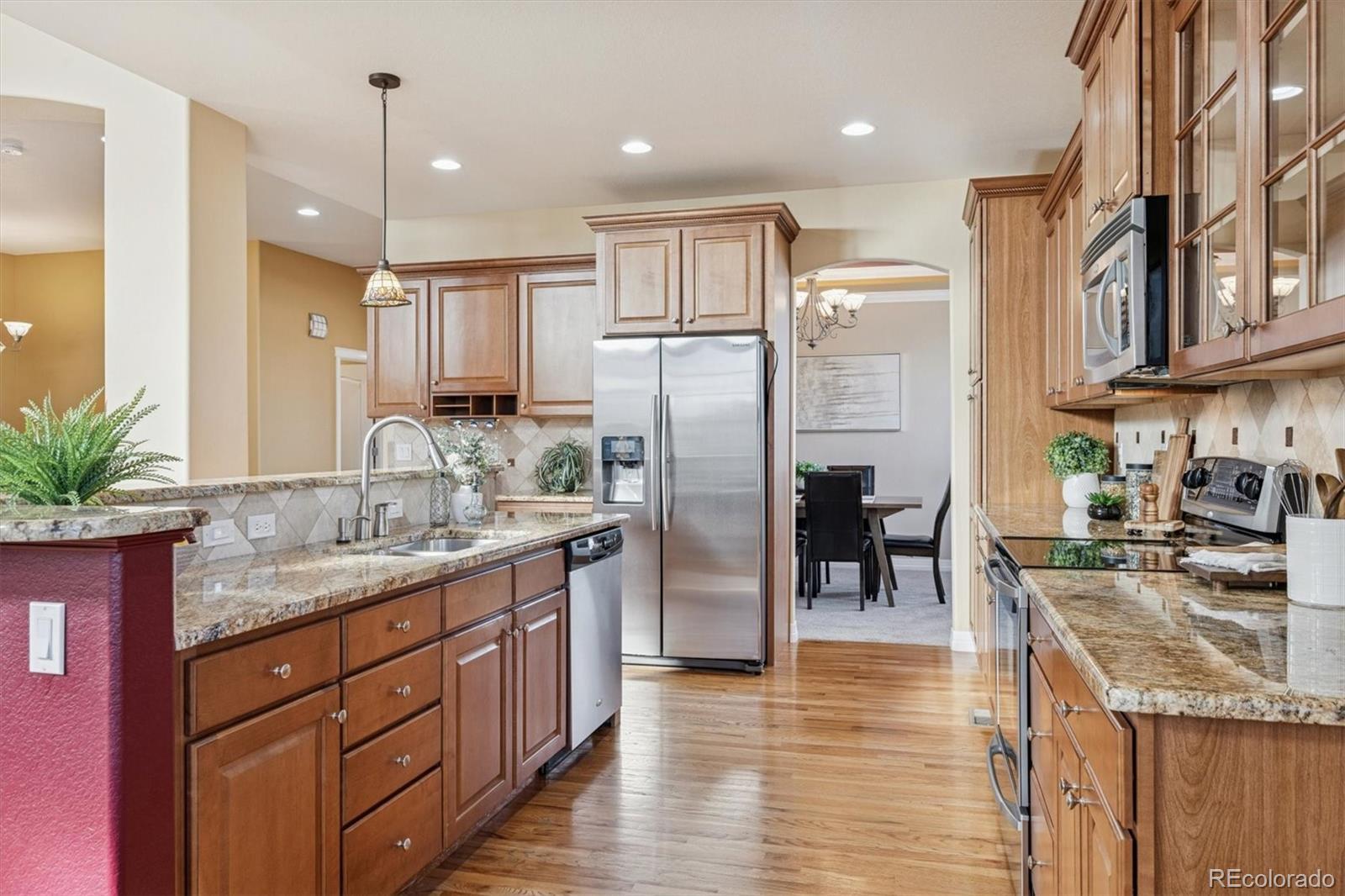 We are proud to present this lovely RANCH PATIO HOME in Meadow Ridge At Hagaman Ranch! This stunning centrally located home is steps to the Arvada Center for the Arts and Humanities and boasts a quaint, quiet, all-ranch patio home neighborhood! This CRAFTSMAN style beauty offers an open floorplan with extensive hardwood floors on much of the main level & tastefully designed! Stunning foyer entrance greets you from expansive covered front porch! Once inside formal dining room offers coffered ceiling with crown molding detail, pillars, shutters & custom ceiling detail. Soaring and SUNNY family room is pouring w/ natural light, high ceilings & cozy gas log fireplace including eye-catching mantel/hearth! Gourmet kitchen features large island, cherry cabinets w/ slab granite counters, S/S appliances, large pantry & sunny breakfast nook! MAIN floor laundry w/ appliances included, offers great functionality. Access to oversized garage! Private MAIN floor primary bedroom w/ coffered ceilings, new carpet, fan/light, crown molding & flowing into a gorgeous ensuite 5-piece bath w/ dual sinks, tile flooring, shower enclosure, soaking tub & huge walk-in closet! Secondary bed & full bath with tub/shower offers great privacy for company or home office! Professionally finished basement with family room, game room + pool light, 3rd bedroom + 3/4 shower bath, mechanical room offers ample storage. Great curb appeal, quiet block & corner lot location. Shaded by mature landscaping, comfortable rear covered patio, immaculate grounds w/ low maintenance grounds work provided by HOA who mows & shovels. Enjoy the terraced garden wall and sweet setting is pleasant for casual entertaining! Easy access to I-70 head out to the mountains for the weekend or a night downtown. JeffCo schools, tons of conveniences to shops, dining, parks and trails! Located just steps away from Arvada Center for the Arts and Humanities including superb access to Boulder/Denver/Mountains. Hurry your next home awaits!