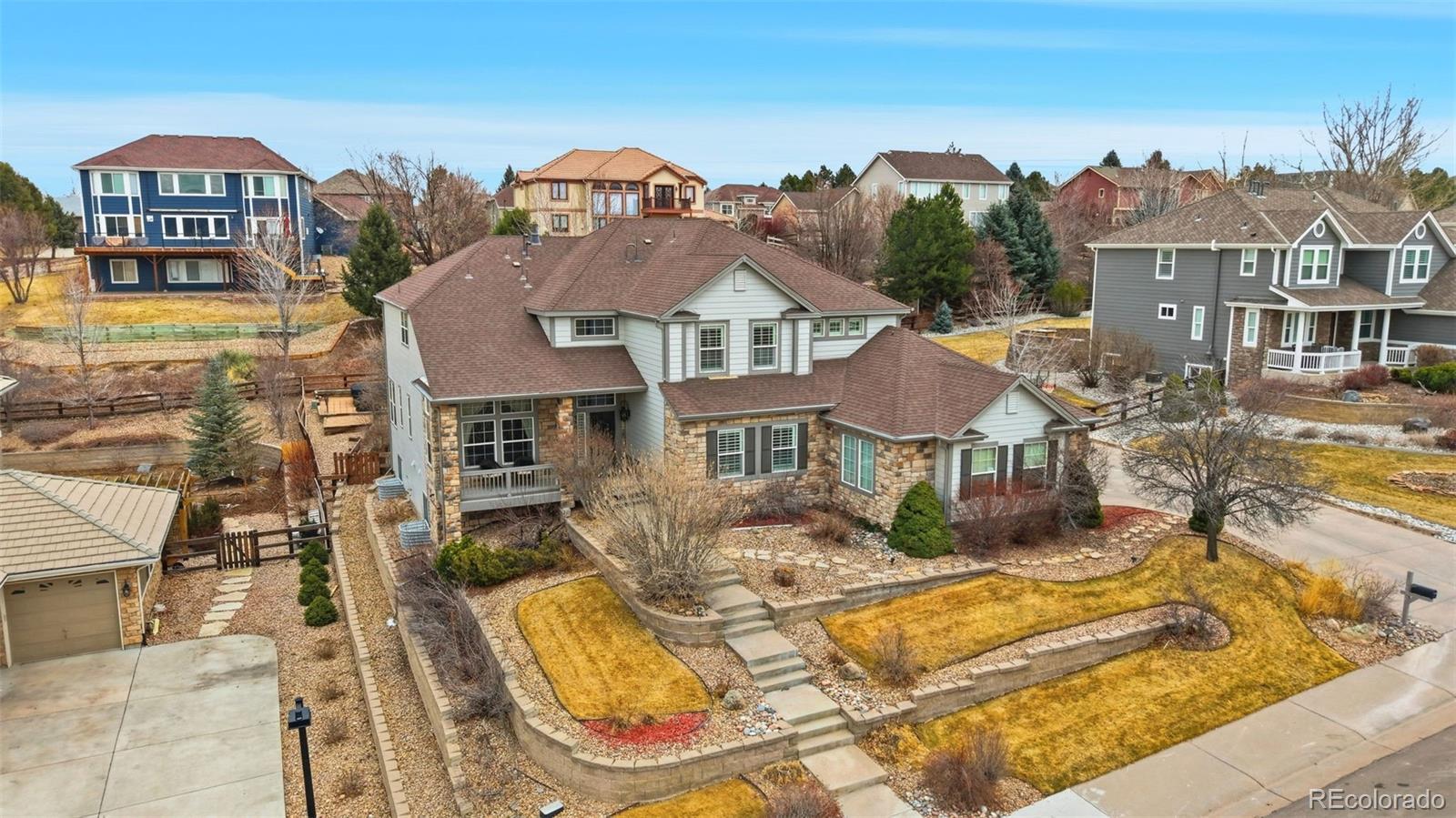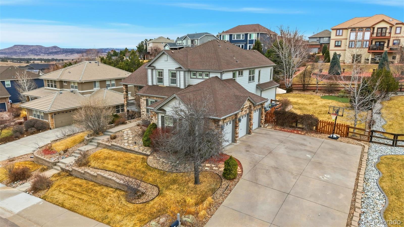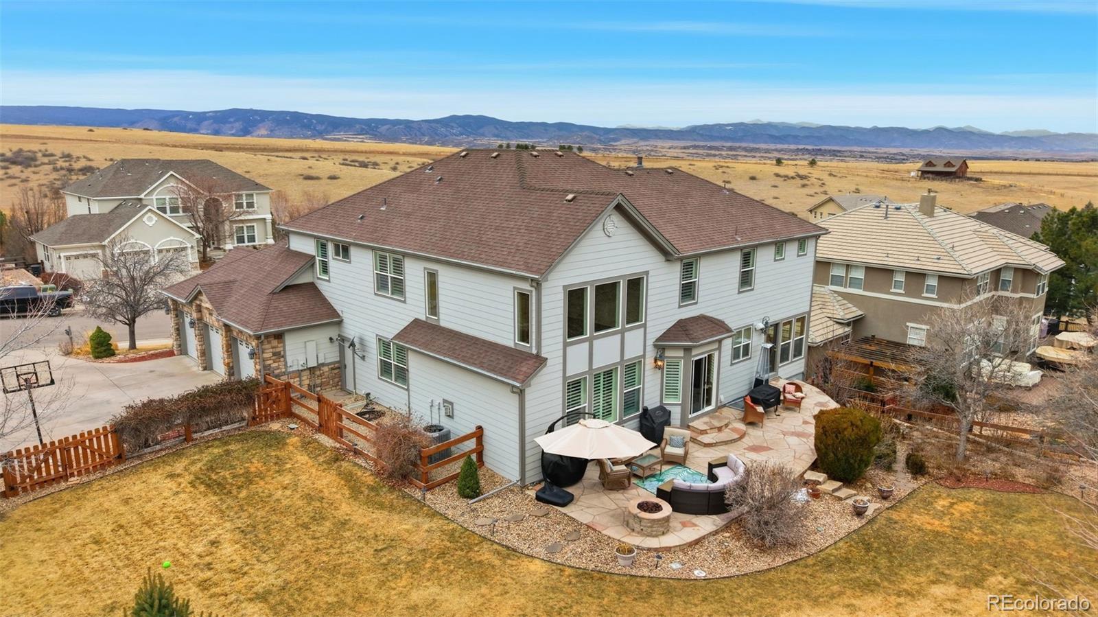 STUNNING UPDATED HOME IN EXCLUSIVE SOARING EAGLE ESTATES* TREMENDOUS CURB APPEAL & STATELY POISED ON ELEVATED LOT WITH COMMANDING MOUNTAIN VIEWS FROM THE FRONT* WONDERFUL FLOORPLAN FOR LARGE FAMILY WITH CREATIVE SPACE FOR ALL* GRAND, INVITING ENTRY* HUGE MEDIA ROOM ON MAIN LEVEL- IDEAL FOR MOVIE NIGHTS* SUN ROOM OFF THE REAR OFFERING DIRECT ACCRESS TO BACKYARD- THE PERFECT AREA FOR THAT MORNING CUP OF JOE* EXECUTIVE OFFICE W/ BUILT INS & FRENCH DOORS* FINISHED BASEMENT FEATURING FULL BAR W/ CUSTOM CABS & GRANITE COUNTERS, GAMING AREA, SECONDARY MEDIA AREA, 3/4 BATH W/ CUSTOM TILE WORK, 5TH BEDROOM/WORKOUT OR CRAFT ROOM & CRAWL SPACE FOR ADDED STORAGE* PRIMARY SUITE W/ DOUBLE DOOR ENTRY, FIREPLACE & WALK IN* GENEROUS SECONDARY BEDROOMS W/ VIEWS (1 ENSUITE)* LARGE PRIVATE REAR YARD W/ EXTENDED FLAGSTONE PATIO, GAS FIREPIT/ SITTING AREA, VIEWS FROM HOT TUB (INCLUDED), DOG RUN & MATURE PROFESSIONAL LANDSCAPING PROVIDING EXCELLENT PRIVACY IN SUMMER BLOOM* NEW FURNACE (MAIN LEVEL)* NEWER TANKLESS H20 HEATER* BRAND NEW CARPET* NEWER INTERIOR PAINT* SIDE LOAD 3 CAR GARAGE* PLANTATION SHUTTERS* SURROUND SOUND SPEAKERS THROUGHOUT HOME* TREMENDOUSLY CARED FOR PROPERTY* THE MEADOWS IS A LARGE MASTER PLANNED COMMUNITY OFFERING TOP RATED SCHOOLS, PARKS, TRAILS & POOL/CLUBHOUSE (THE GRANGE)- CONVENIENTLY LOCATED MINUTES TO THE VIBRANT DOWNTOWN OF OLD CASTLE ROCK & EASY ACCESS TO I25 & DENVER TECH CENTER* WELCOME HOME.