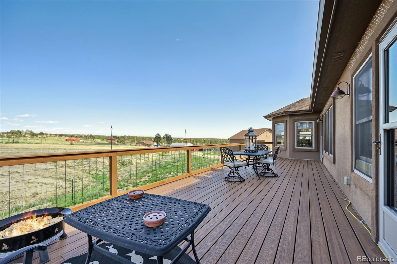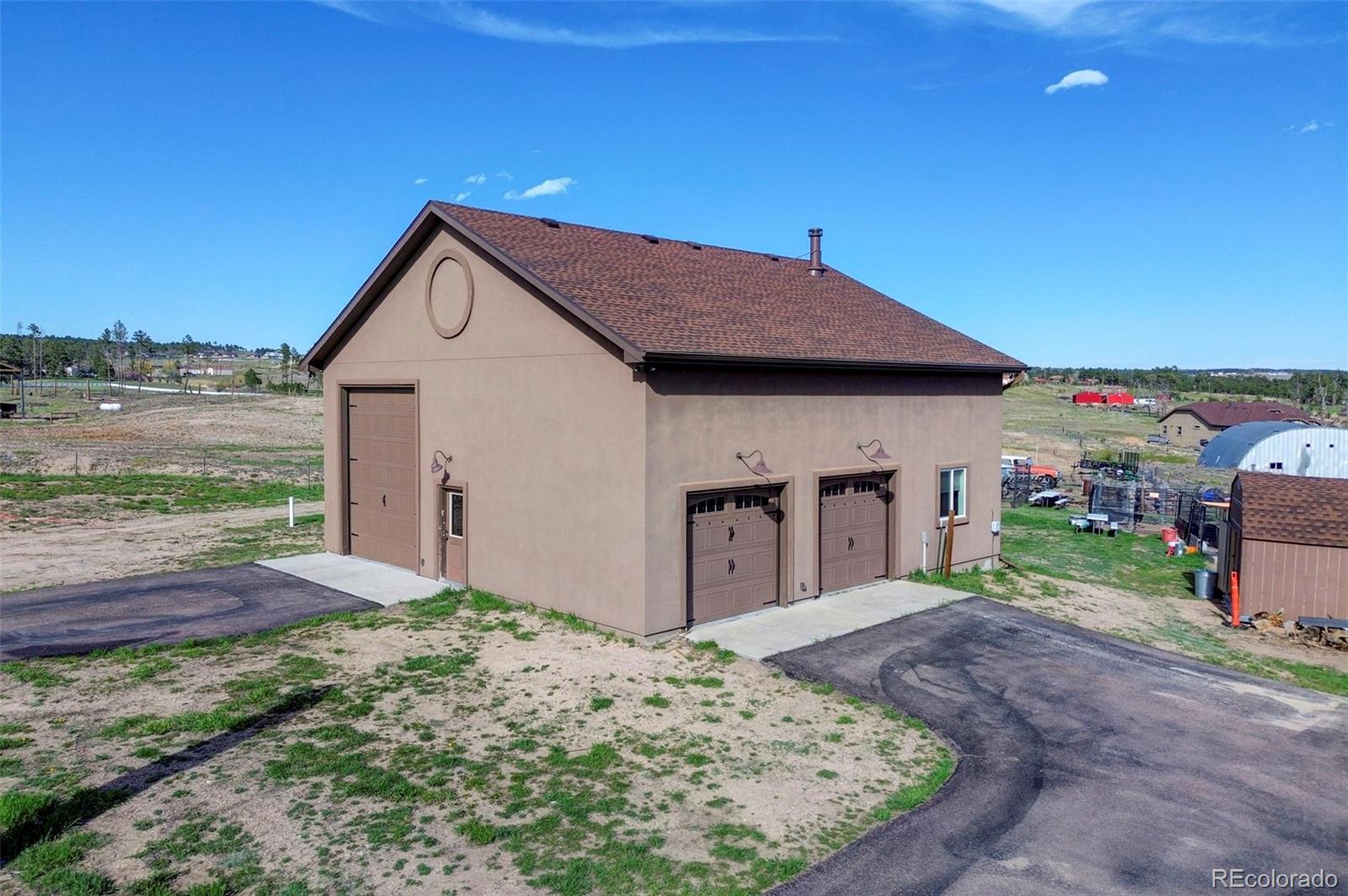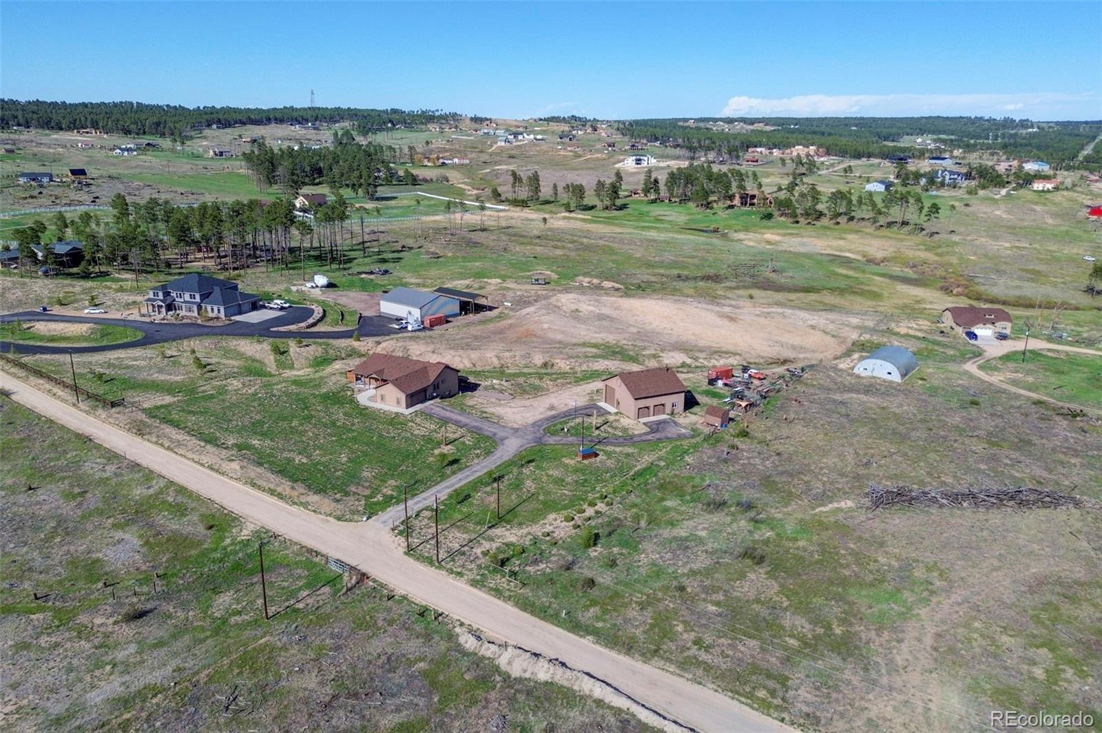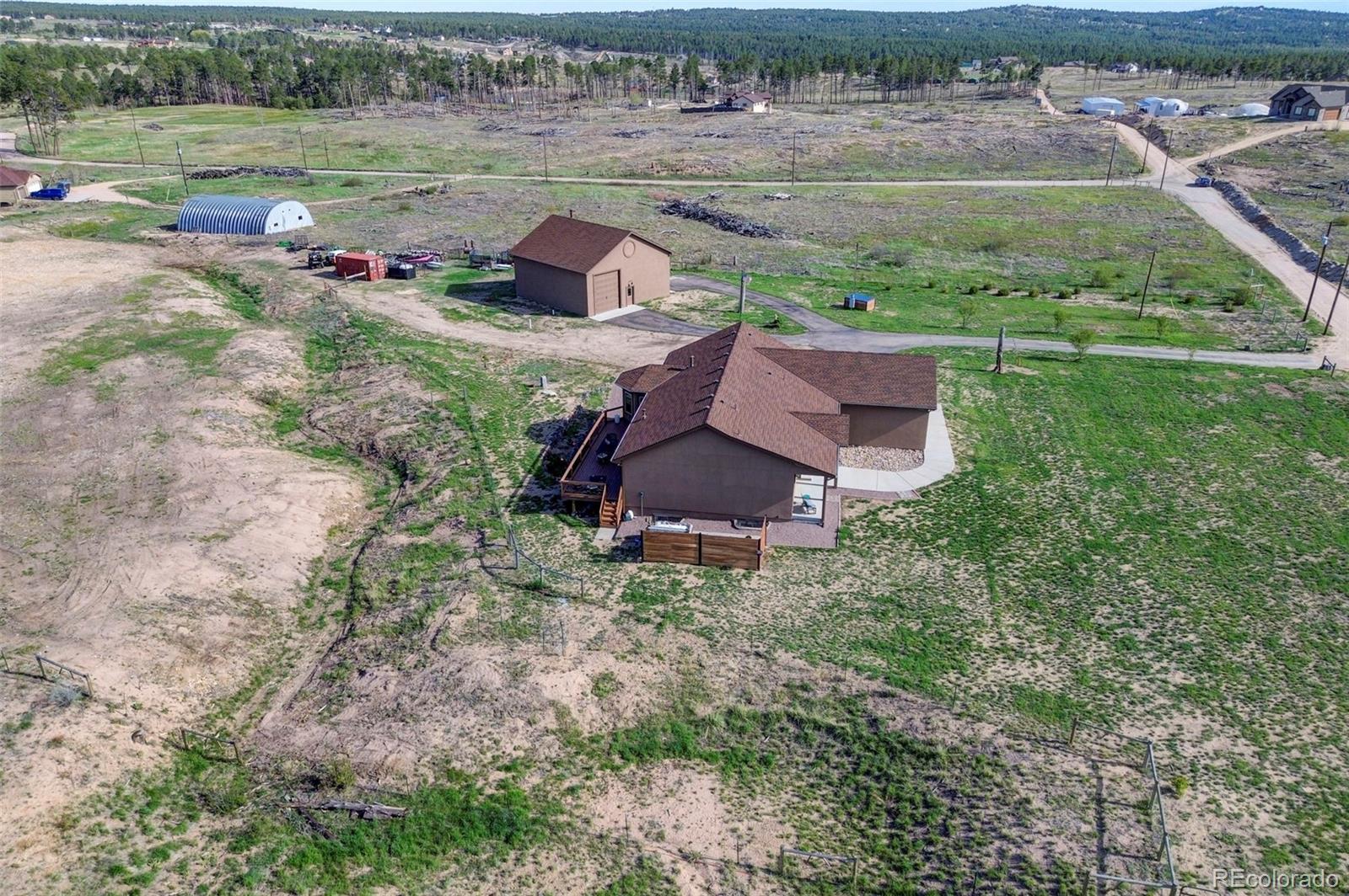 Move-in-ready rancher in Black Forest County Club Estates. This 7.35-acre property is just what you have been waiting for! 5 bdrm, 3 ba home perfectly blends upscale finishes and thoughtful utility with room to work, live, and play. This home offers a gourmet kitchen with beautiful alder cabinets, an oversized granite island, a gas cooktop, a convection microwave, and a wall oven. The master bath features a custom double vanity and a tiled two-person walk-in shower. There are two additional bedrooms and a main-level office. The main level walks out to an oversized composite wood deck. This great home has zoned radiant heat in the basement and forced air natural gas heat with a/c on the main level. The finished basement features a Bowling Alley wood-topped wet bar with a built-in microwave oven and refrigerator. There are two pellet stoves, one on each level. The one in the basement will keep you warm while you play a game of ping-pong or watch a movie in the home theatre. Two additional bedrooms and a large bath make this a great space for you and your guests to enjoy! Lastly is the awesome 40 x 40 foot insulated RV/shop. This space will cover almost every need, whether to store your RV or give you that space for tinkering on cars or building your next project! 3-garage doors, 2-man doors, sheetrocked interior, 30 amp RV plug-in, and dump station, 220 plug for your welder. Built-in shelving, outdoor generator hookup, enclosed and installed on a concrete slab at the pole, ready for emergency power when needed. Buried fiber internet to both the shop and the home. The 7.35-acre lot has been cleared and fenced. The property is zoned for animals. The private hot tub area is a great place to retreat to at the end of a long day, or you may prefer the front porch, which gives you a perfect spot to sit and enjoy the beautiful sunset over Pikes Peak. So put this home on your must-see short list and come and see for yourself all this great house has to offer and MORE!