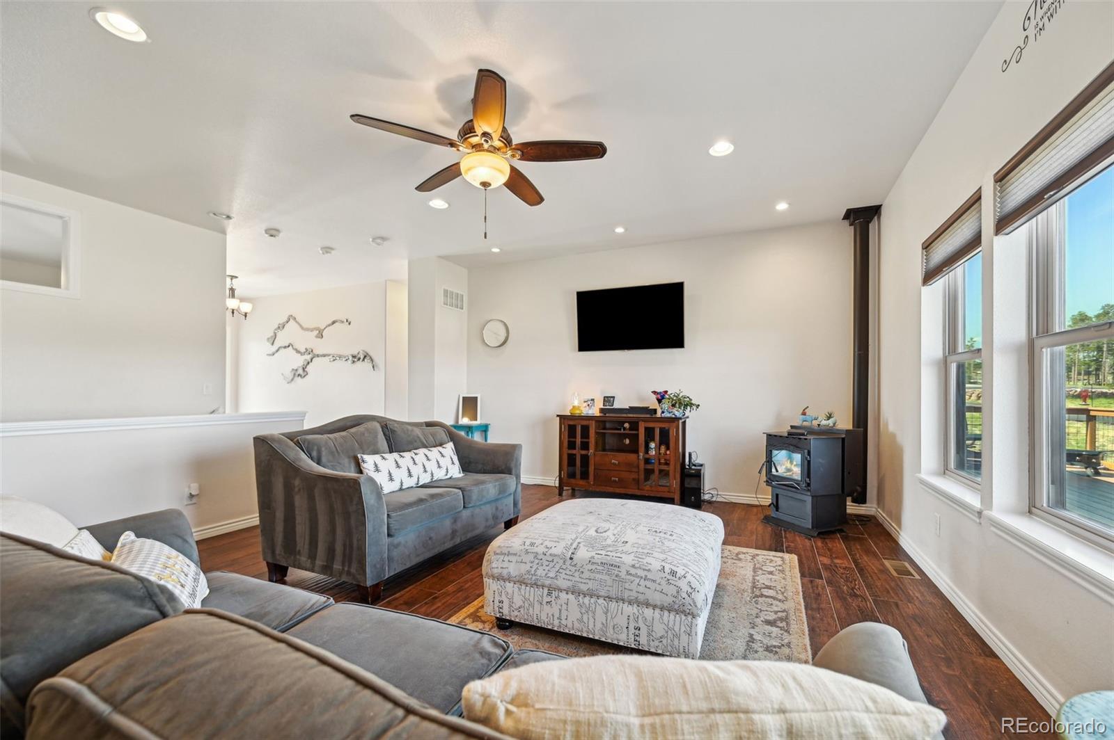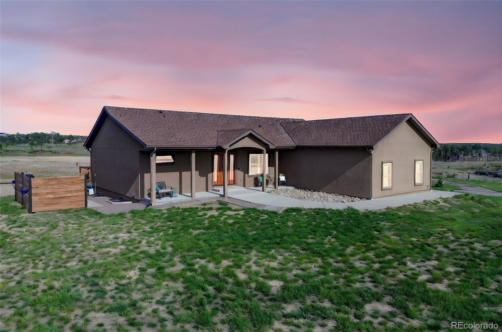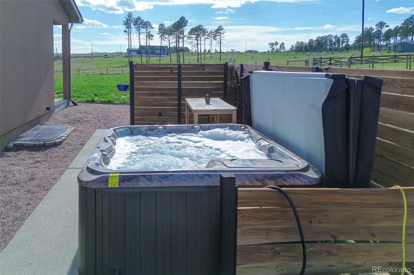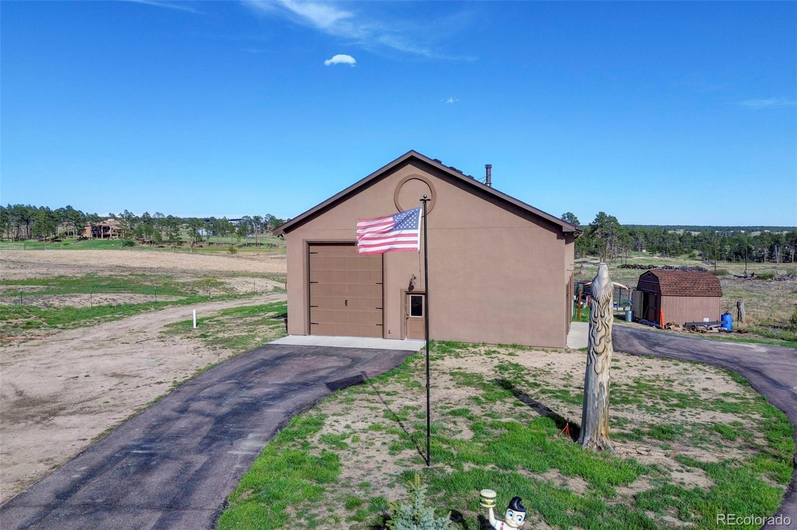 Move-in-ready rancher in Black Forest County Club Estates. This 7.35-acre property is just what you have been waiting for! 5 bdrm, 3 ba home perfectly blends upscale finishes and thoughtful utility with room to work, live, and play. This home offers a gourmet kitchen with beautiful alder cabinets, an oversized granite island, a gas cooktop, a convection microwave, and a wall oven. The master bath features a custom double vanity and a tiled two-person walk-in shower. There are two additional bedrooms and a main-level office. The main level walks out to an oversized composite wood deck. This great home has zoned radiant heat in the basement and forced air natural gas heat with a/c on the main level. The finished basement features a Bowling Alley wood-topped wet bar with a built-in microwave oven and refrigerator. There are two pellet stoves, one on each level. The one in the basement will keep you warm while you play a game of ping-pong or watch a movie in the home theatre. Two additional bedrooms and a large bath make this a great space for you and your guests to enjoy! Lastly is the awesome 40 x 40 foot insulated RV/shop. This space will cover almost every need, whether to store your RV or give you that space for tinkering on cars or building your next project! 3-garage doors, 2-man doors, sheetrocked interior, 30 amp RV plug-in, and dump station, 220 plug for your welder. Built-in shelving, outdoor generator hookup, enclosed and installed on a concrete slab at the pole, ready for emergency power when needed. Buried fiber internet to both the shop and the home. The 7.35-acre lot has been cleared and fenced. The property is zoned for animals. The private hot tub area is a great place to retreat to at the end of a long day, or you may prefer the front porch, which gives you a perfect spot to sit and enjoy the beautiful sunset over Pikes Peak. So put this home on your must-see short list and come and see for yourself all this great house has to offer and MORE!
